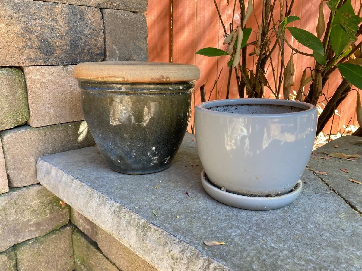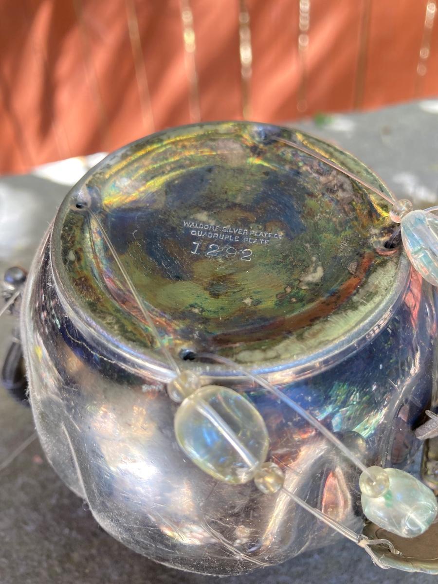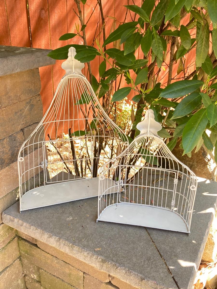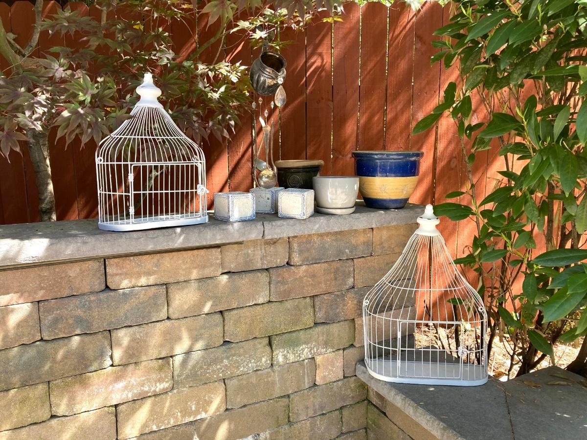 LOT 121: Home Decor Collection - Ceramic / Pottery Planters, Silver Plated Pitcher and Utensil Wind Chimes, Two White Wire Bird Cages and More