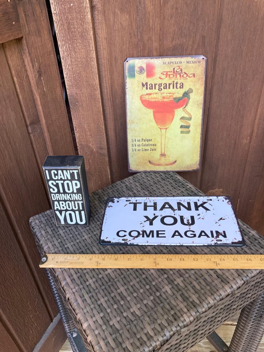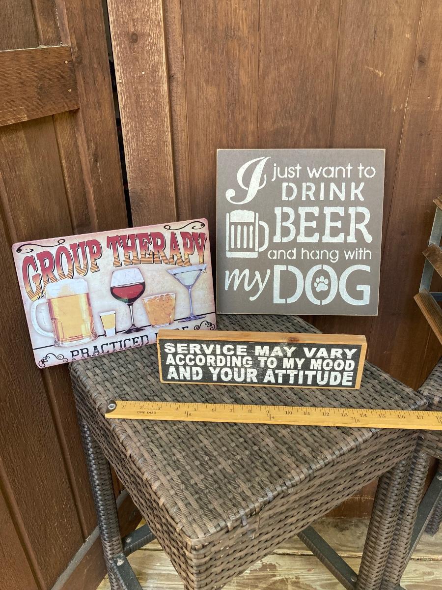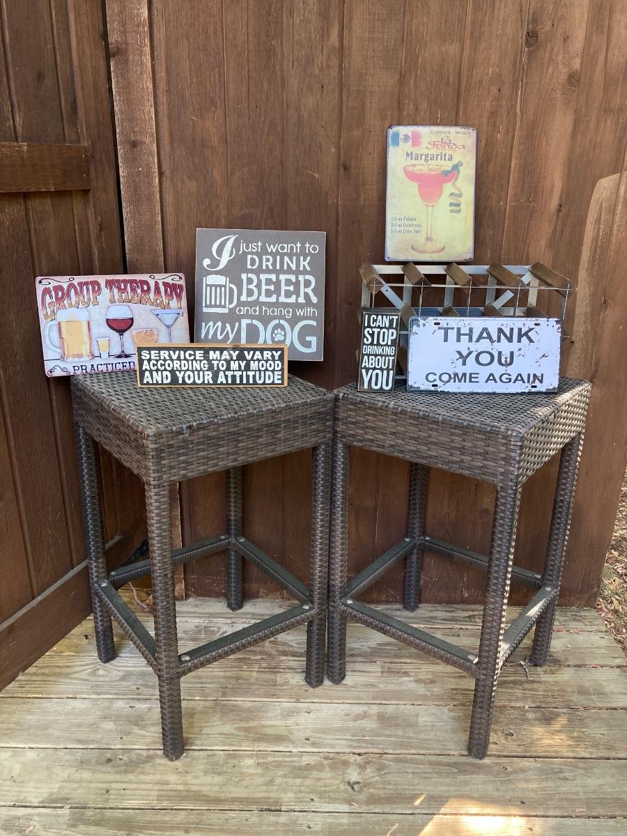 LOT 122: Cheers - A Collection of Bar Signs, Wine Rack and Set of Two (2) Bar Stools