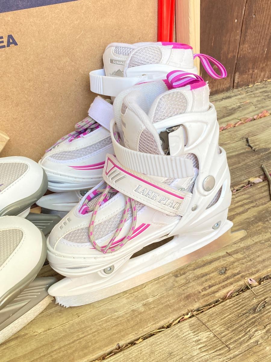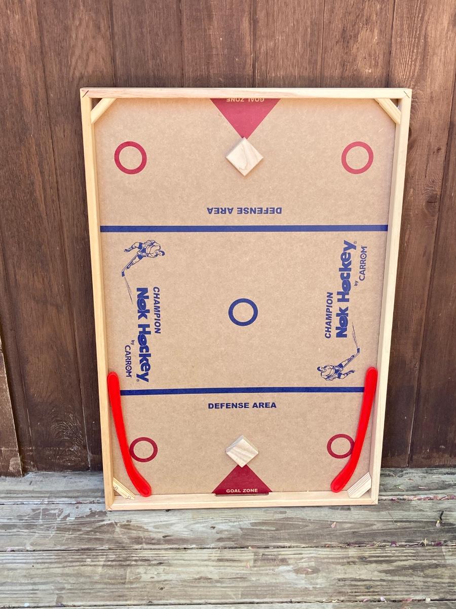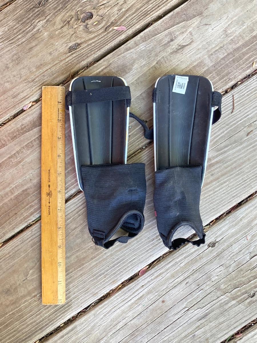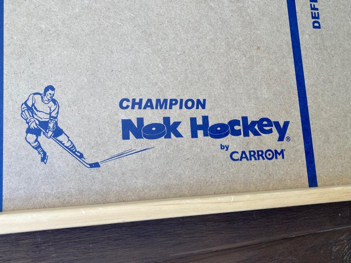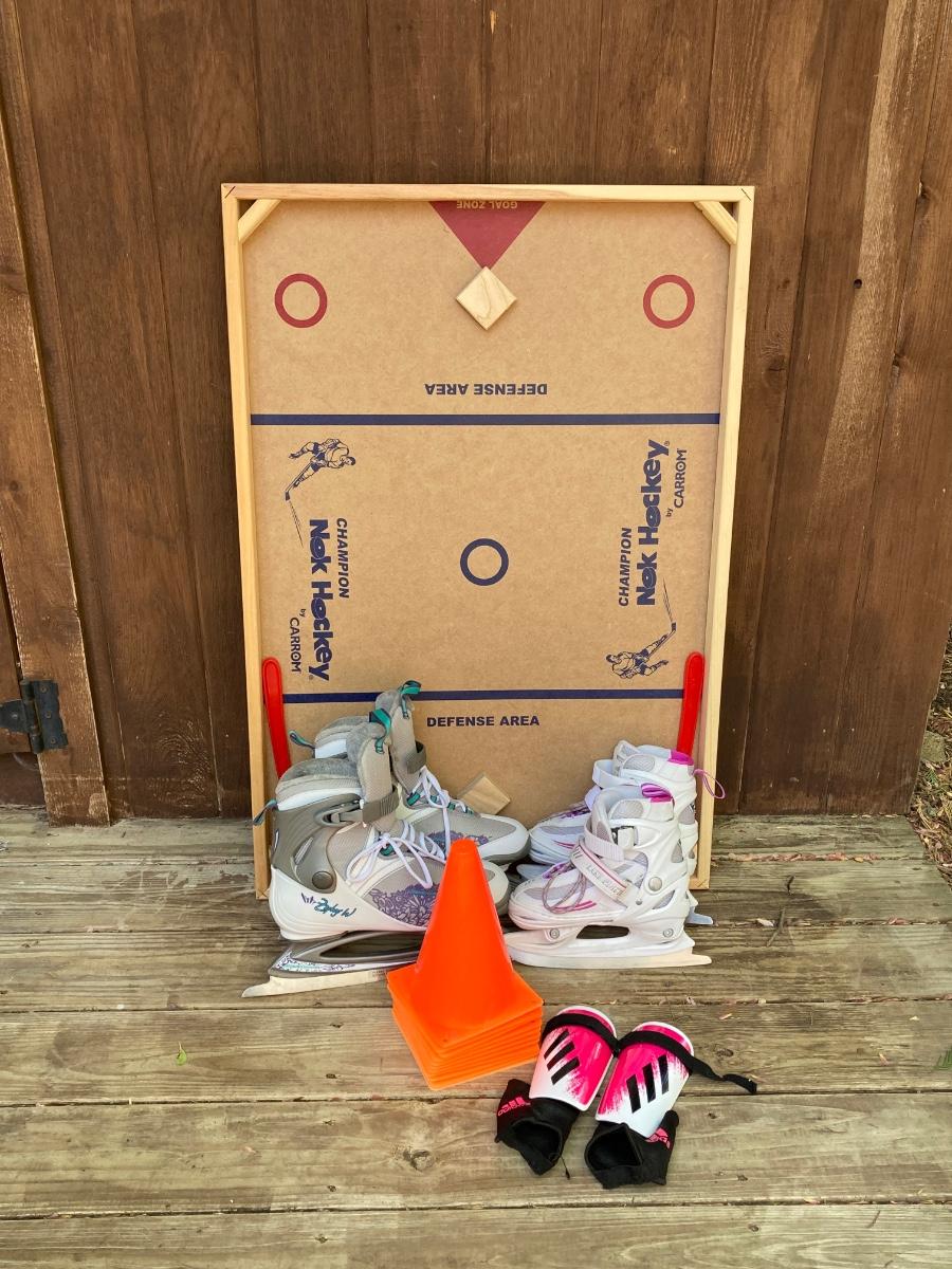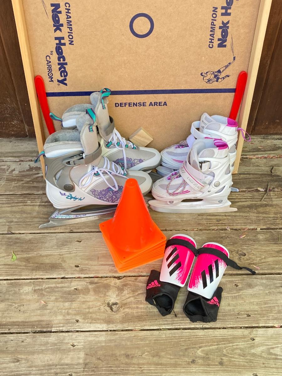 LOT 126: Nok Champion Hockey by Carrom Wooden Board, Bladerunner Adult Ice Skates, Children's Ice Skates / Adidas Shin Guards and Orange Safety Cones