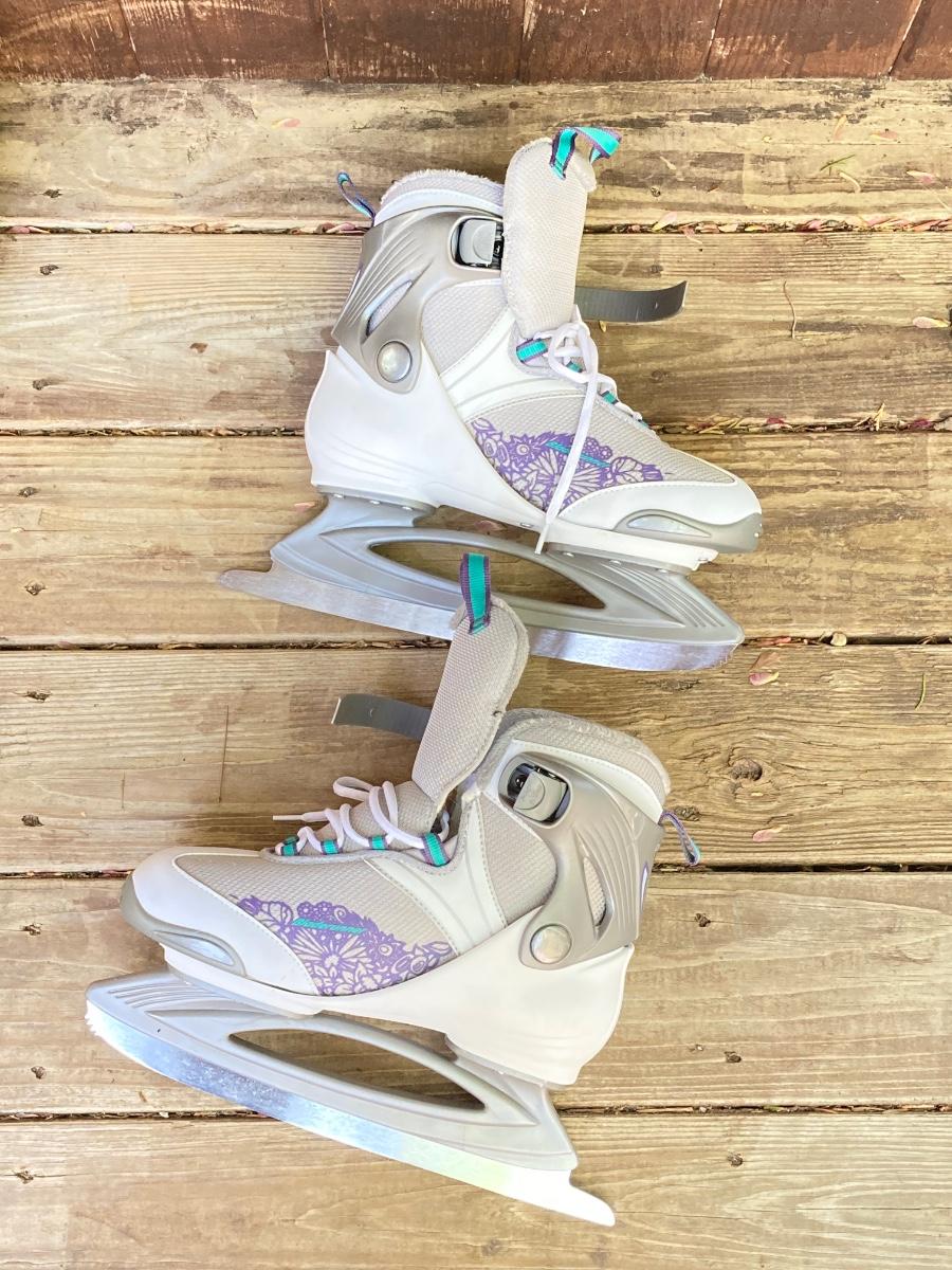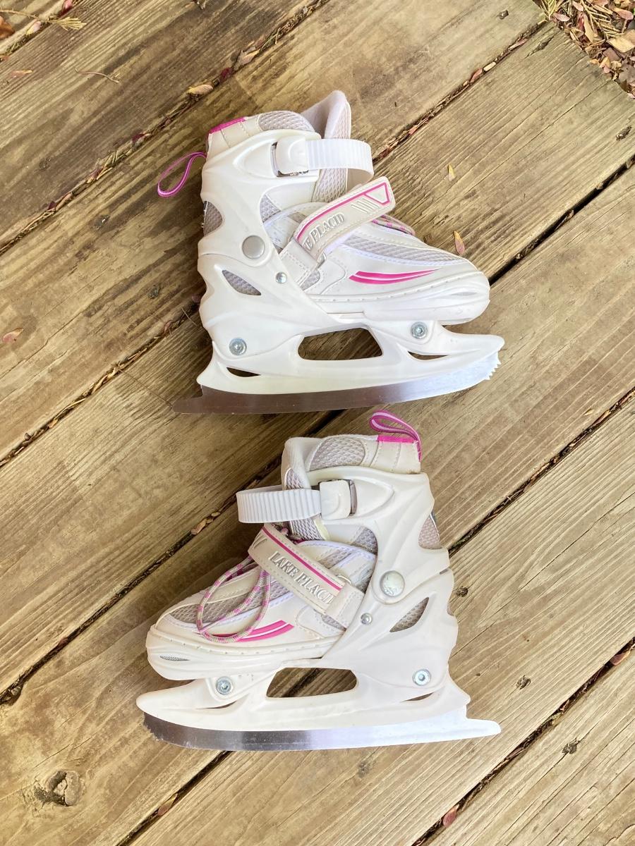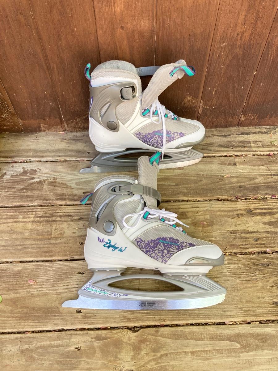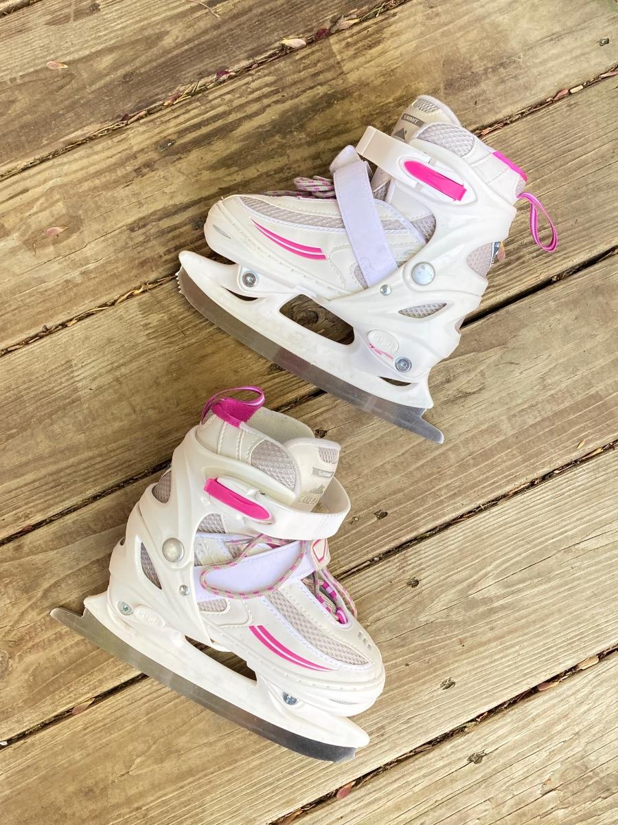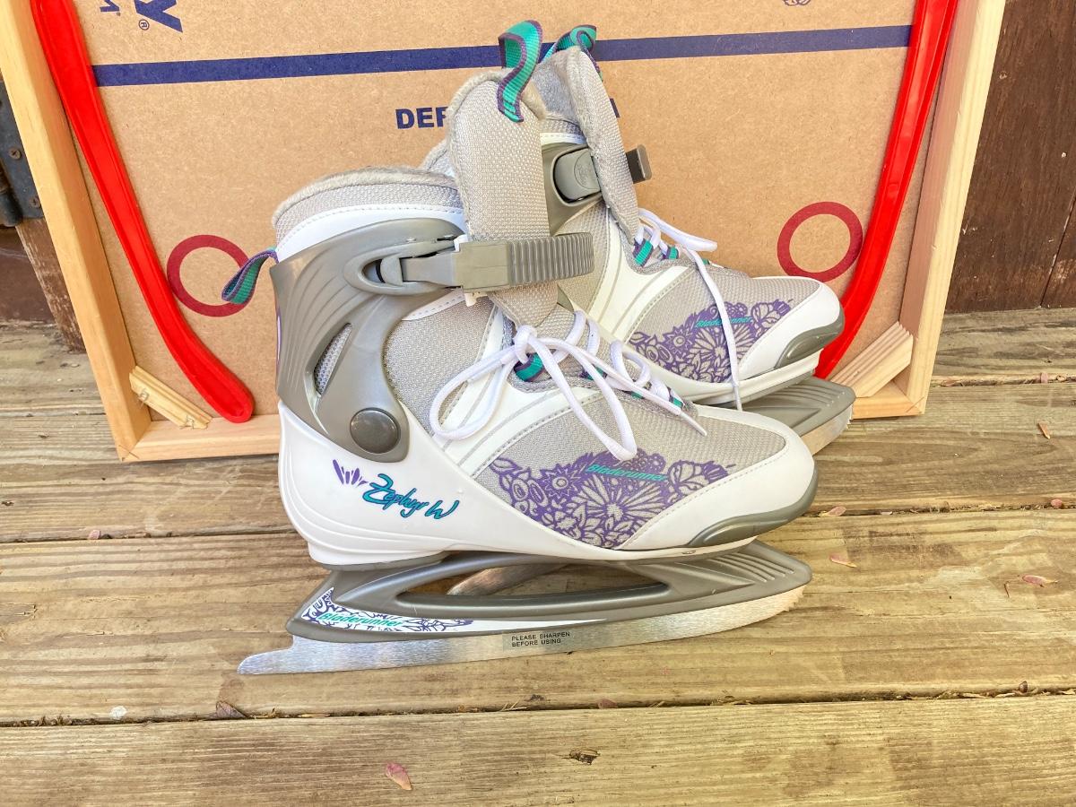 LOT 126: Nok Champion Hockey by Carrom Wooden Board, Bladerunner Adult Ice Skates, Children's Ice Skates / Adidas Shin Guards and Orange Safety Cones