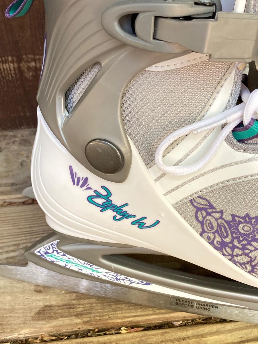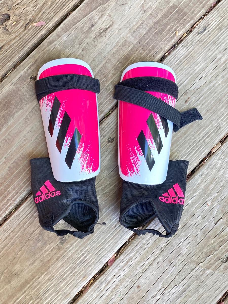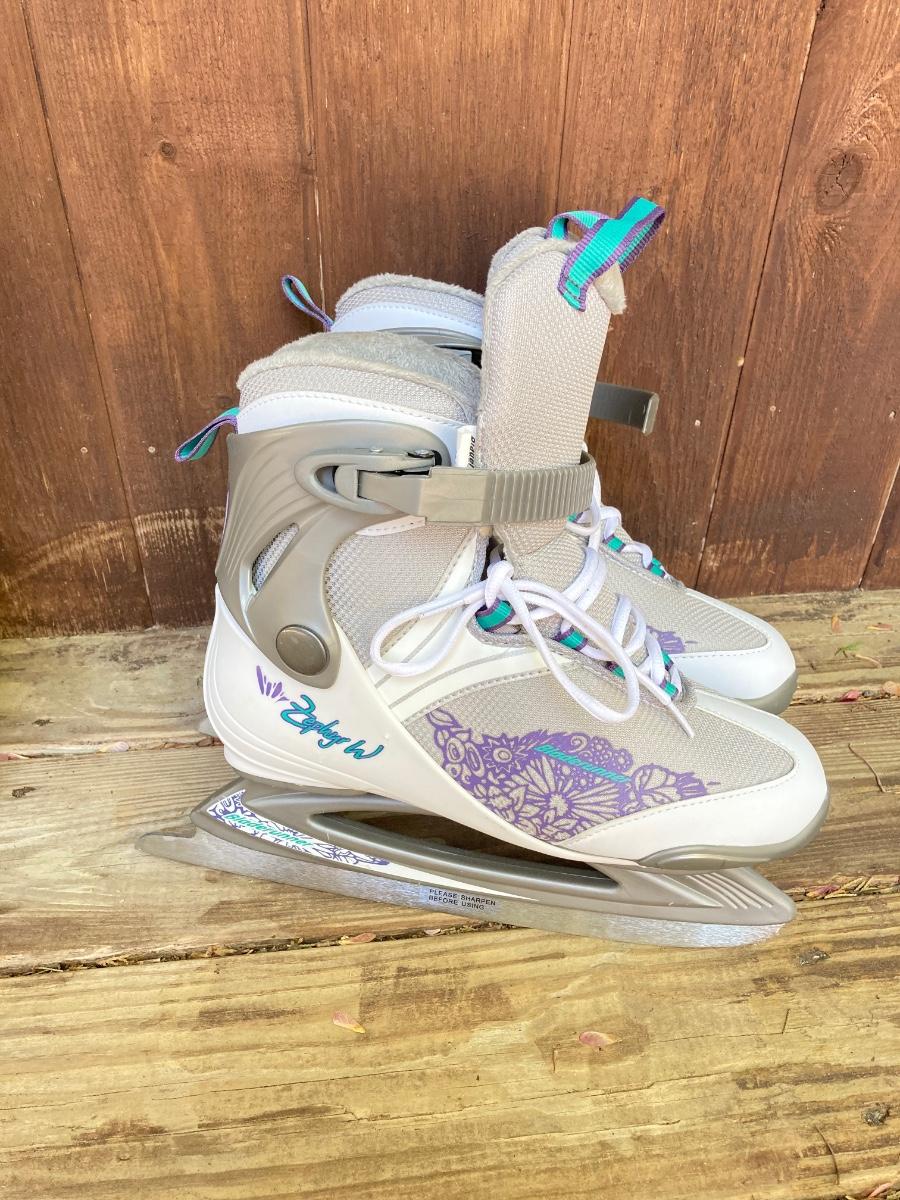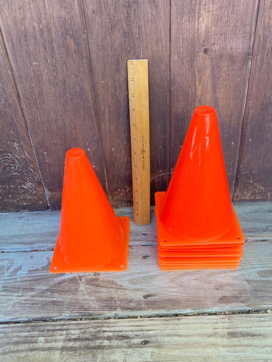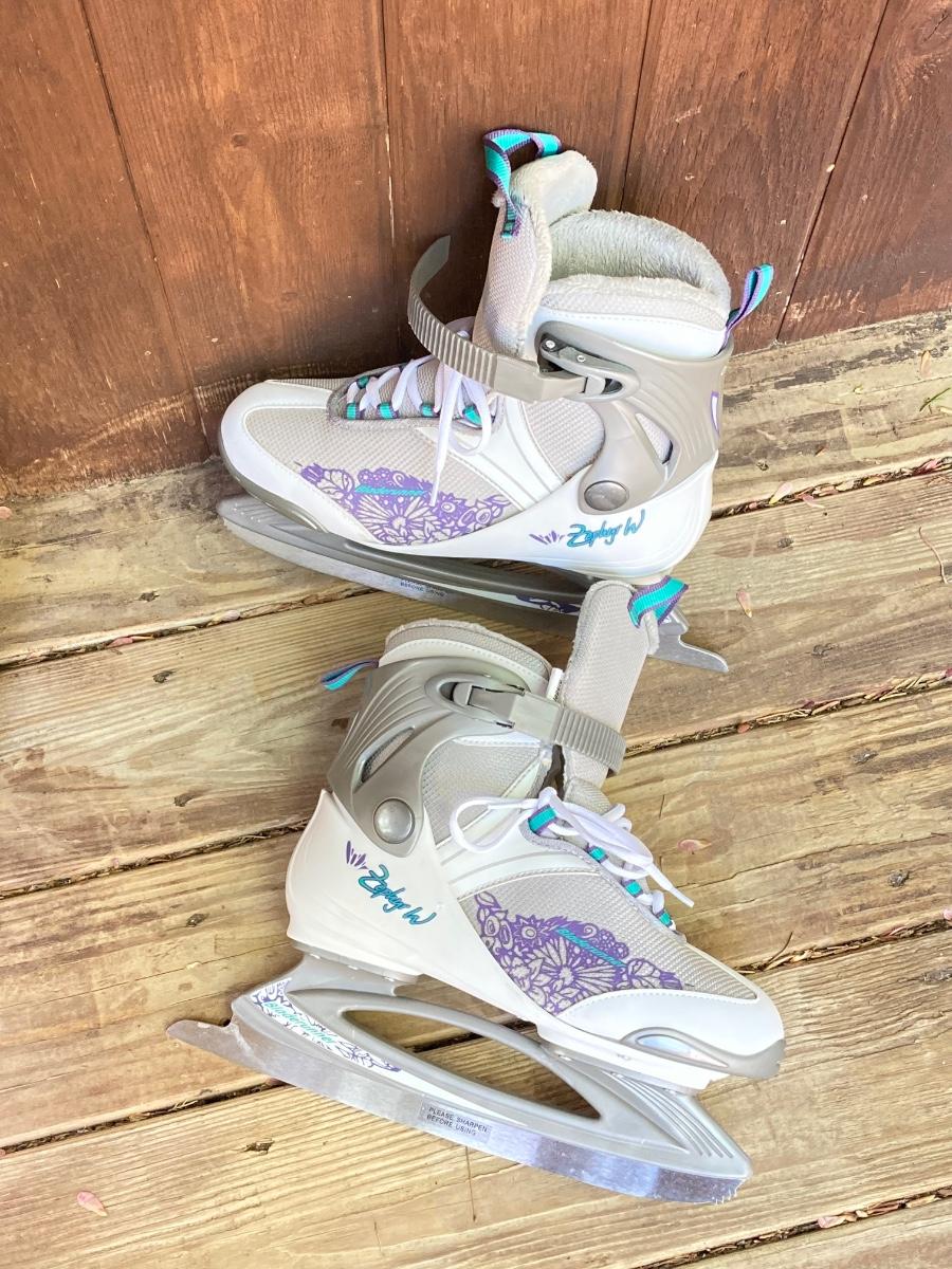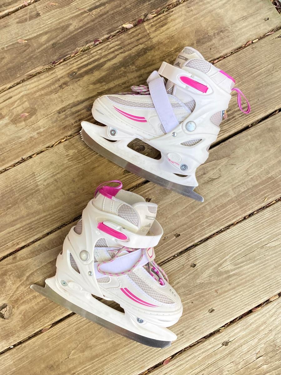 LOT 126: Nok Champion Hockey by Carrom Wooden Board, Bladerunner Adult Ice Skates, Children's Ice Skates / Adidas Shin Guards and Orange Safety Cones