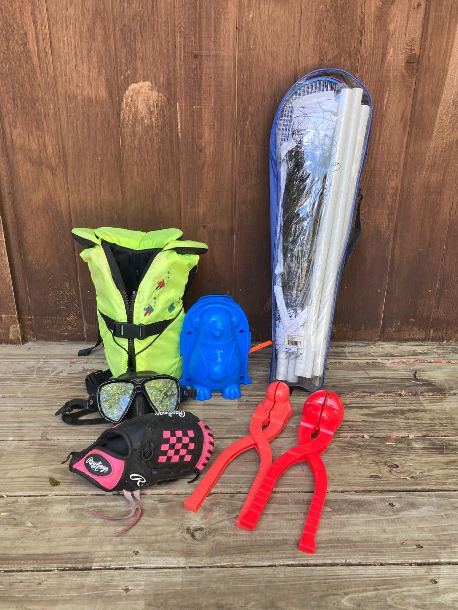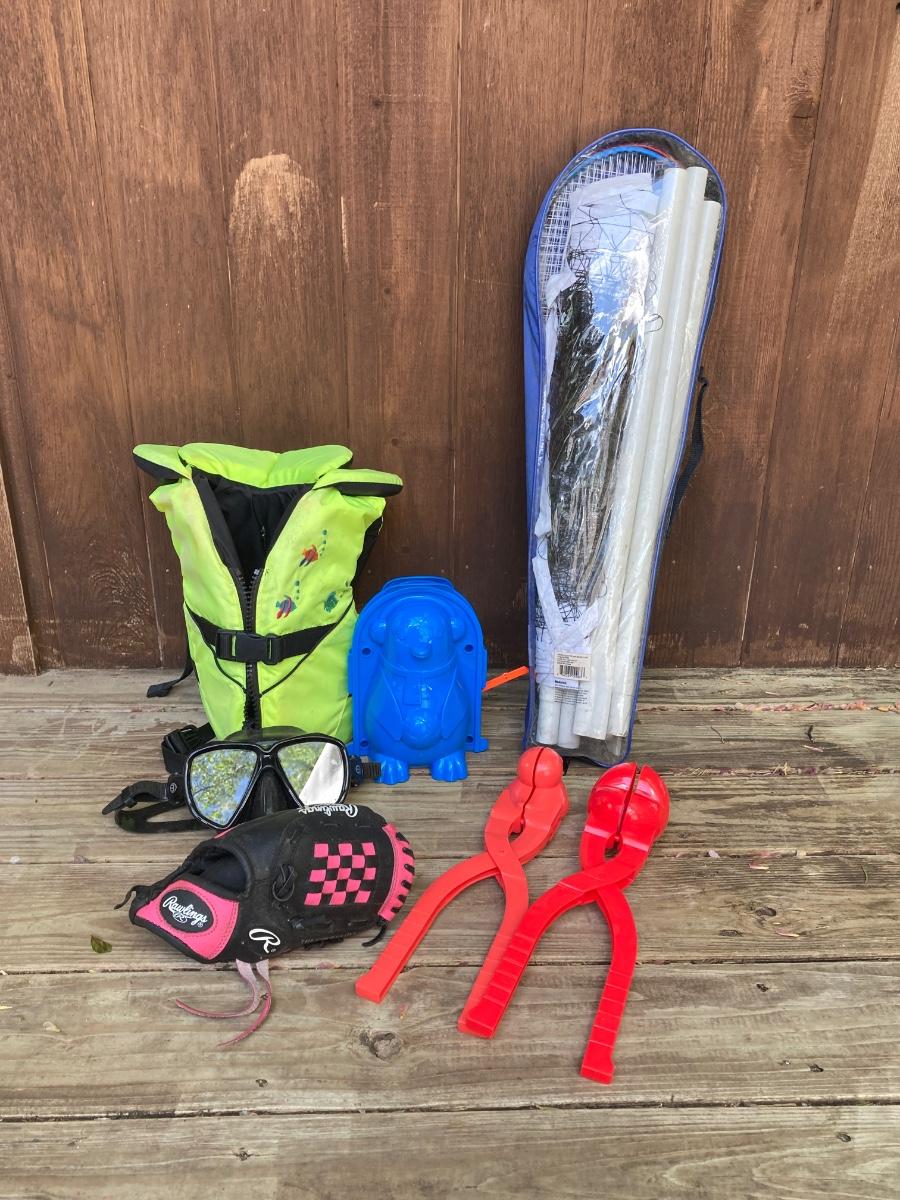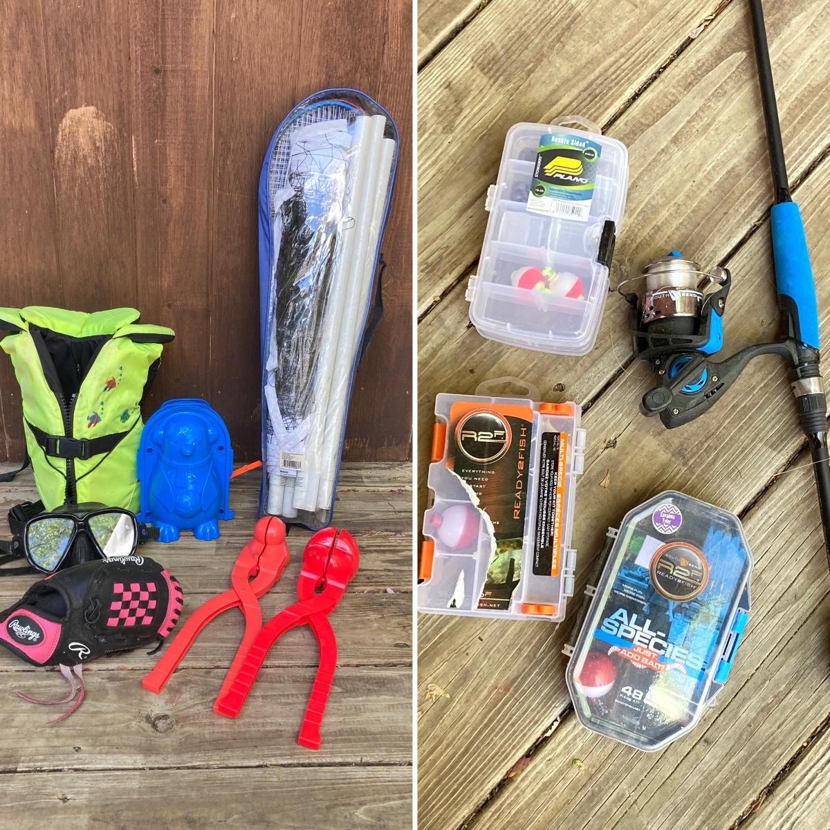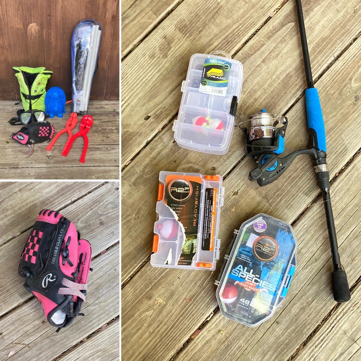 LOT 127: Let's Go Outside to Play - Children's Play Gear - LL Bean Life Jacket, Rawlings Baseball Glove, Fishing Rod with Tackle, Winter Snowball and Penguin Maker and More