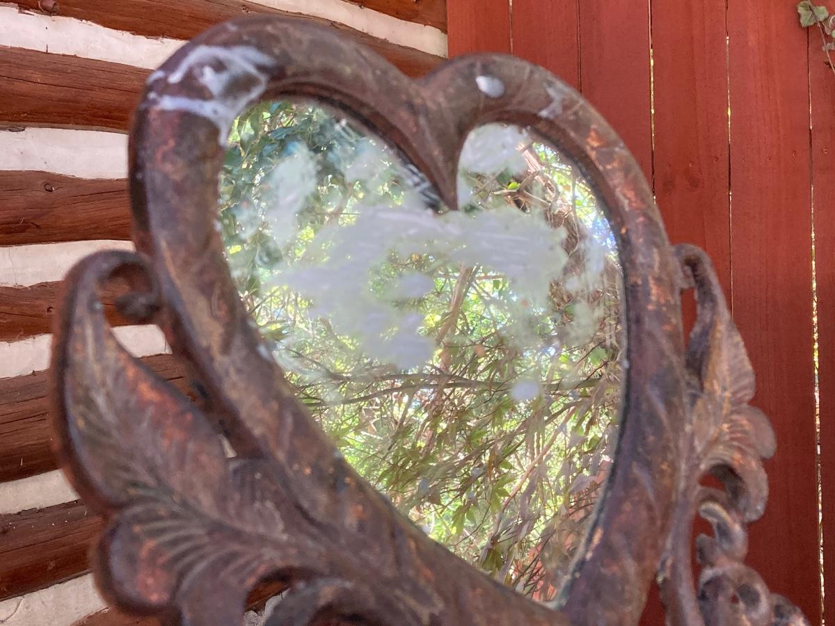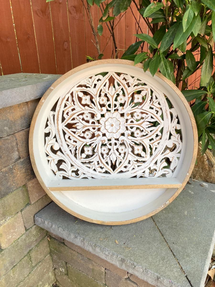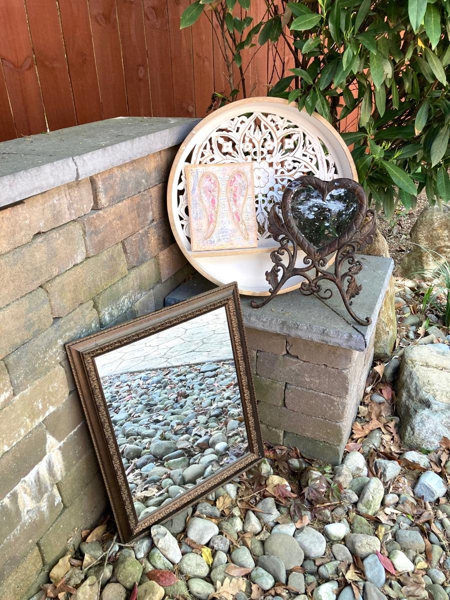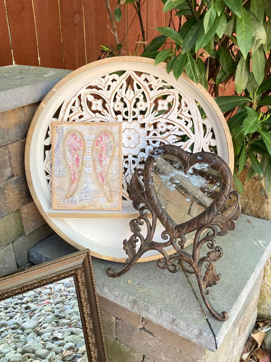 LOT 128: Home Decor Collection - Carved Circular Shelf, Wall Mirror, Heart Shaped Metal Table Mirror and Inspirational Artwork