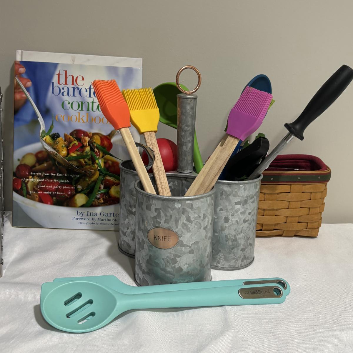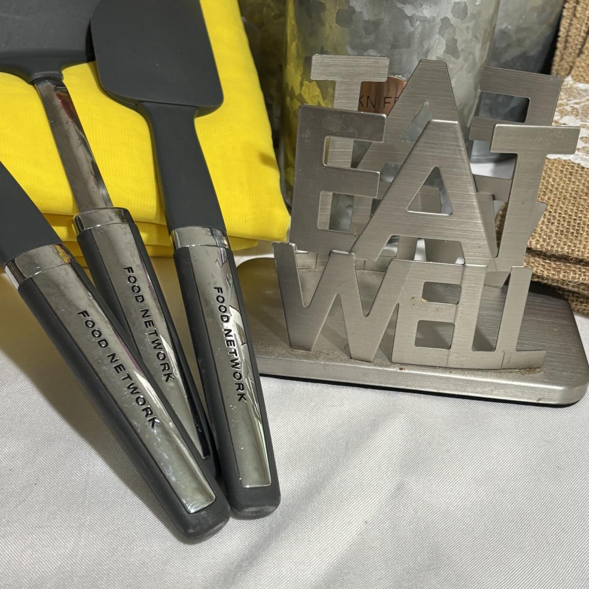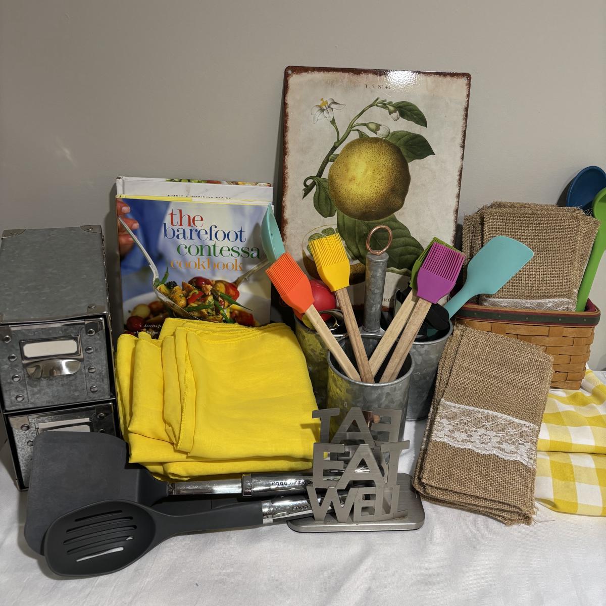 LOT 136: Kitchen Collection Featuring Longaberger Basket, Crate & Barrel and Food Network Utensils,(40) Burlap Flatware Holders, Cookbooks, Recipe Boxes, Ten (10) Table Scarves, and More