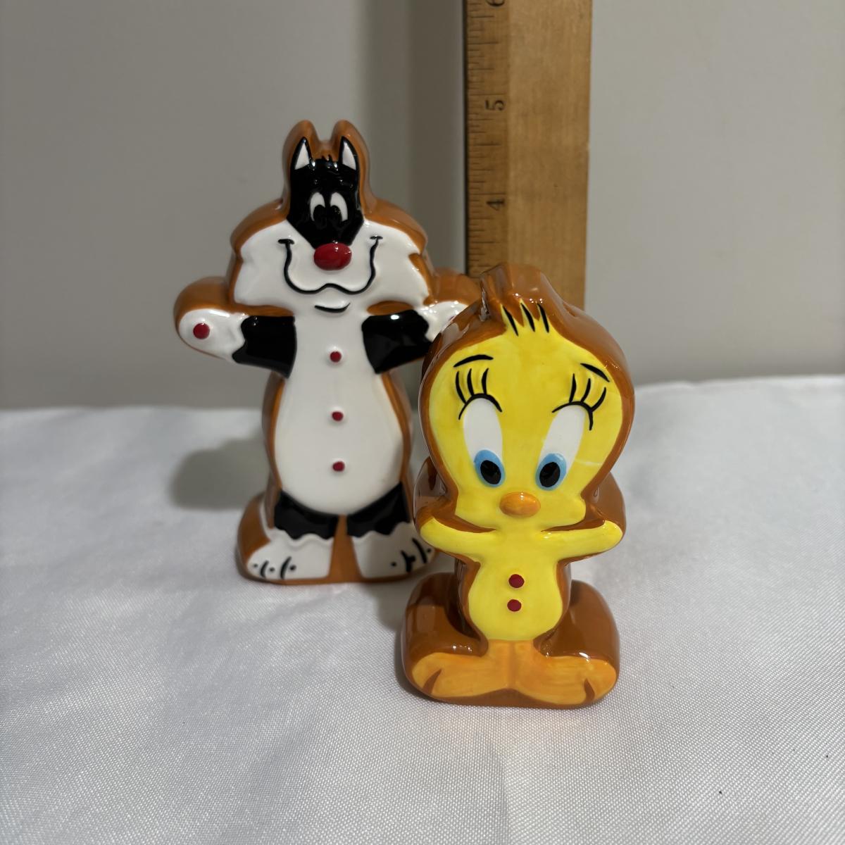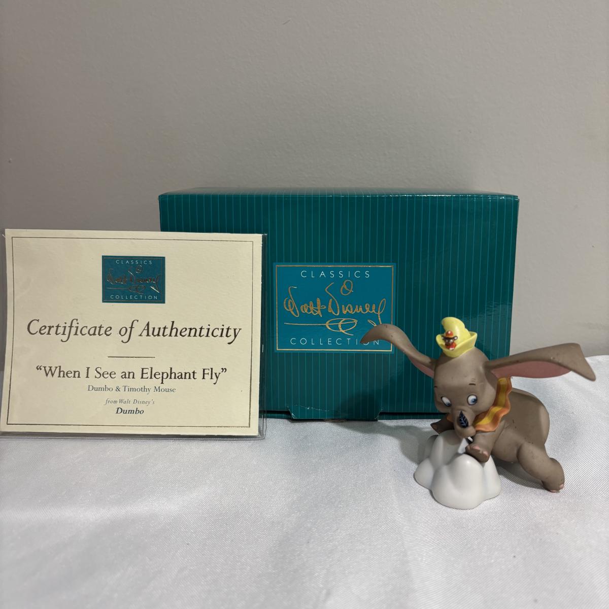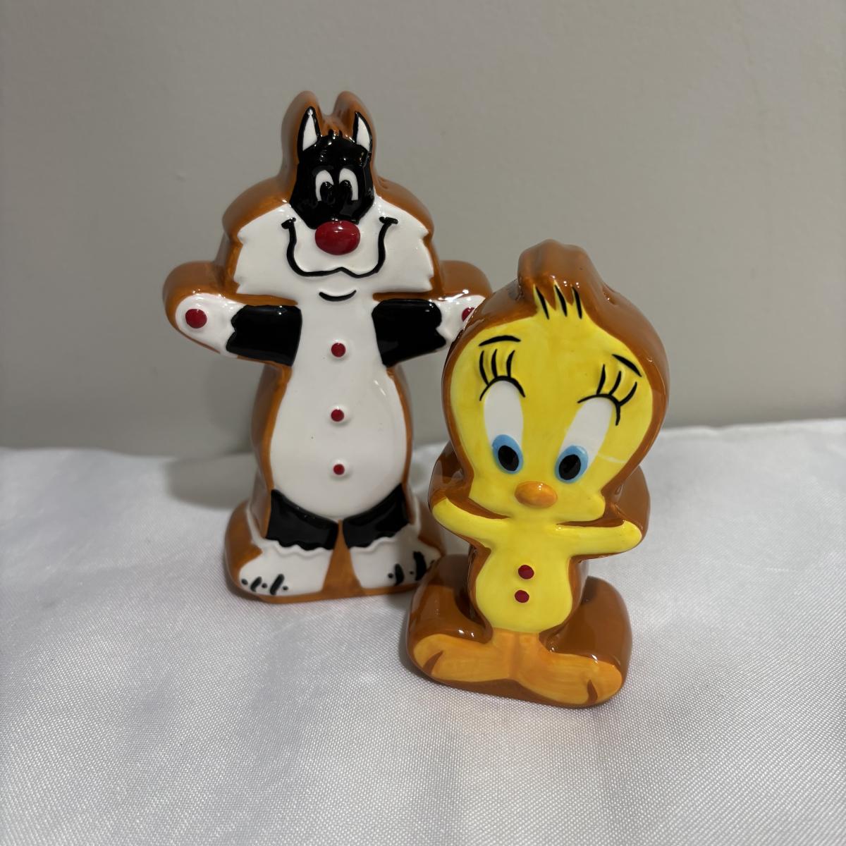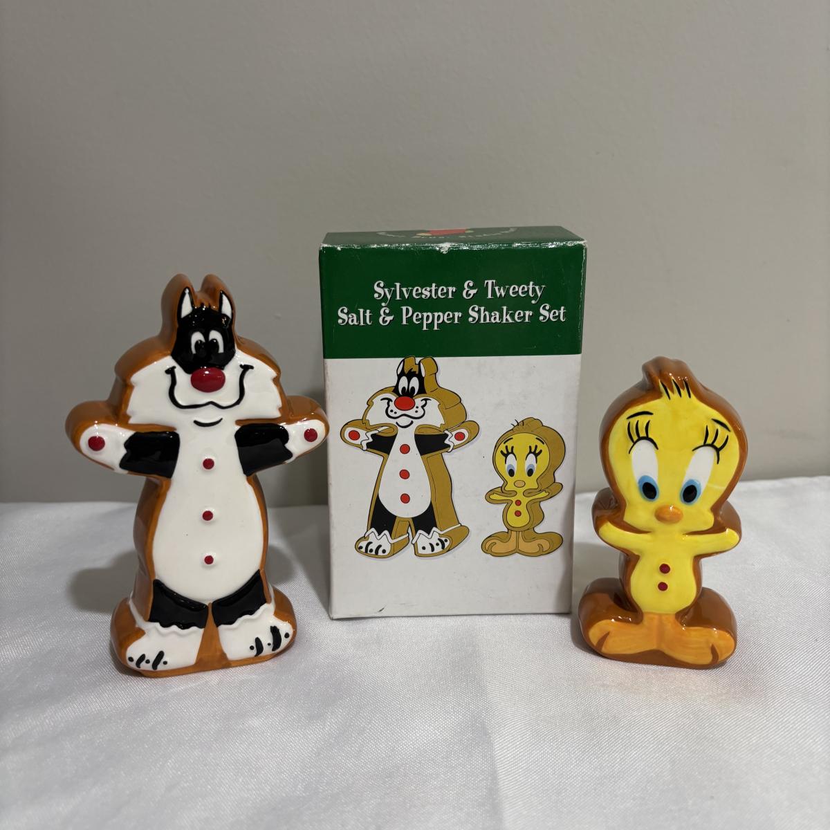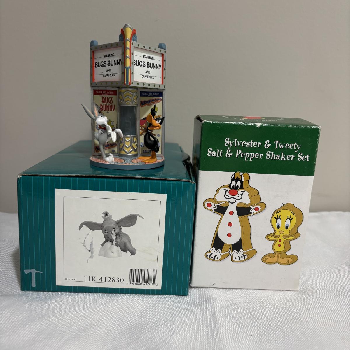 LOT 142: Walt Disney Classic Collection Dumbo “When I See Elephant Fly” Ornament with COA and Original Box, Looney Tunes Sylvester & Tweety Salt & Pepper Shakers, Bugs and Daffy Hallmark