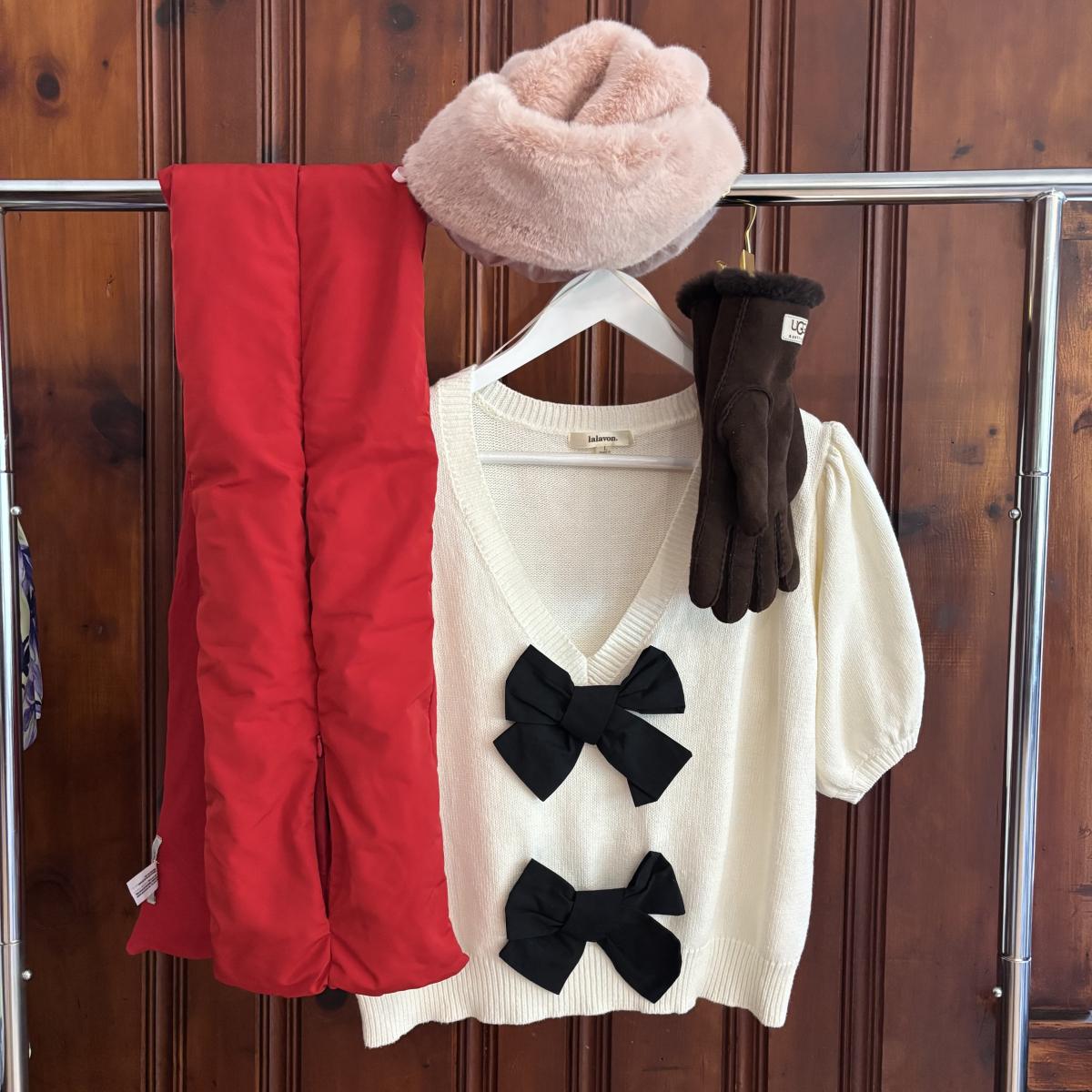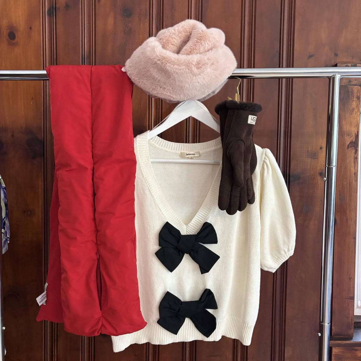 LOT 147: Ugg Fur Lined Gloves, Pink Faux Fur Hat, Banana Republic Scarf, and Sweater