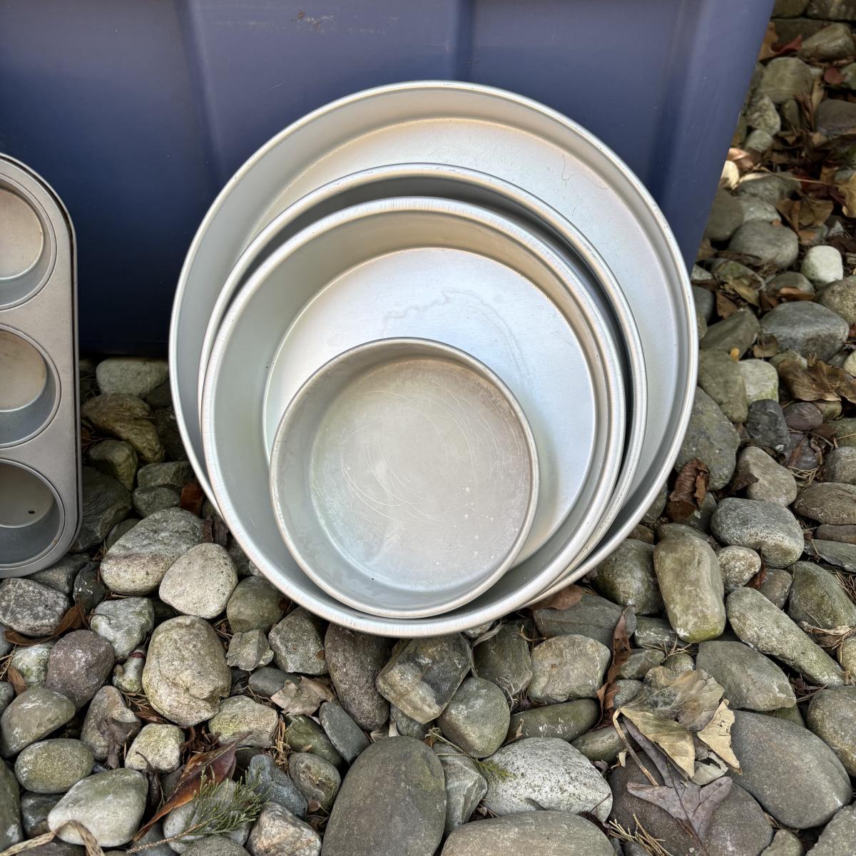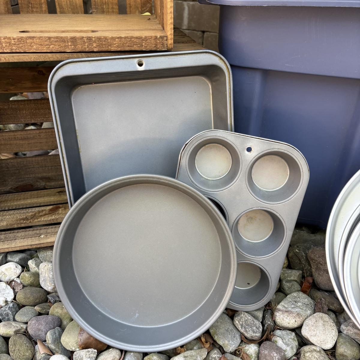 LOT 188: Wilton Cake Pans, Wooden Crated, Rubbermaid Tote & More