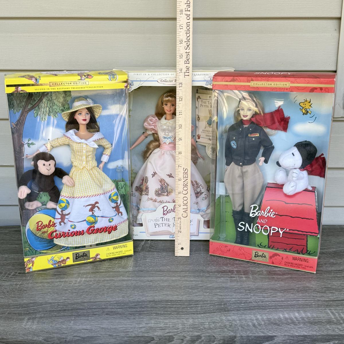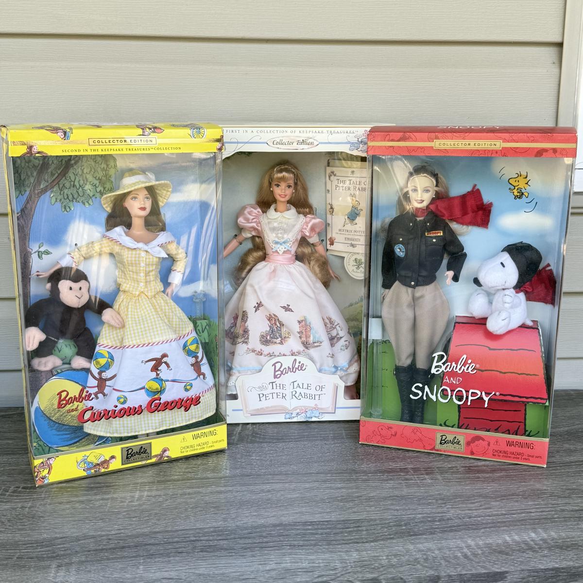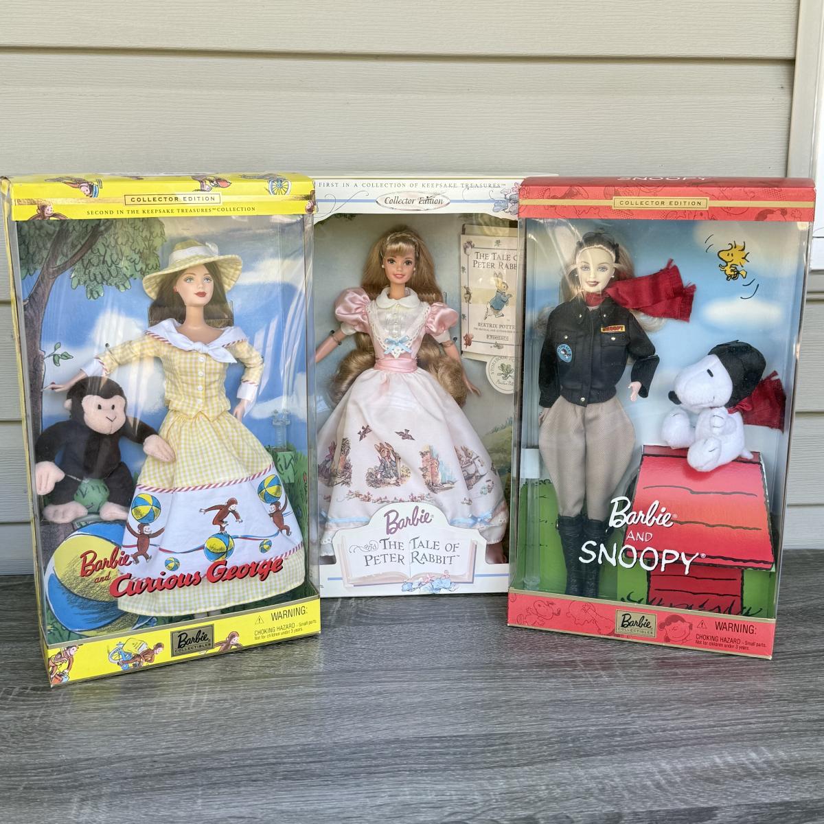 LOT 44P: NRFB Mattel Barbie Collector Edition Dolls: Tale of Peter Rabbit (19360), Barbie & Snoopy (55558) & Curious George (28789)