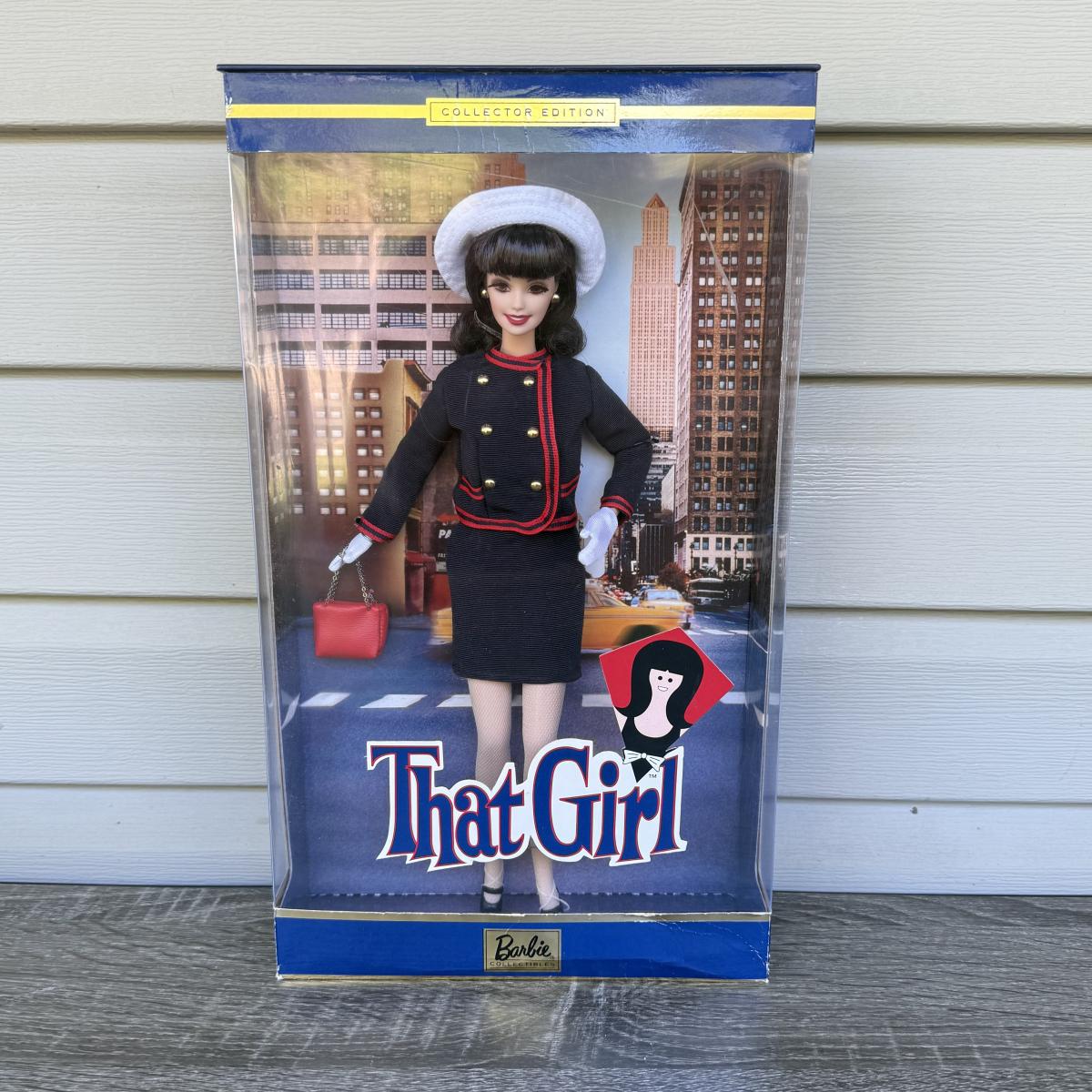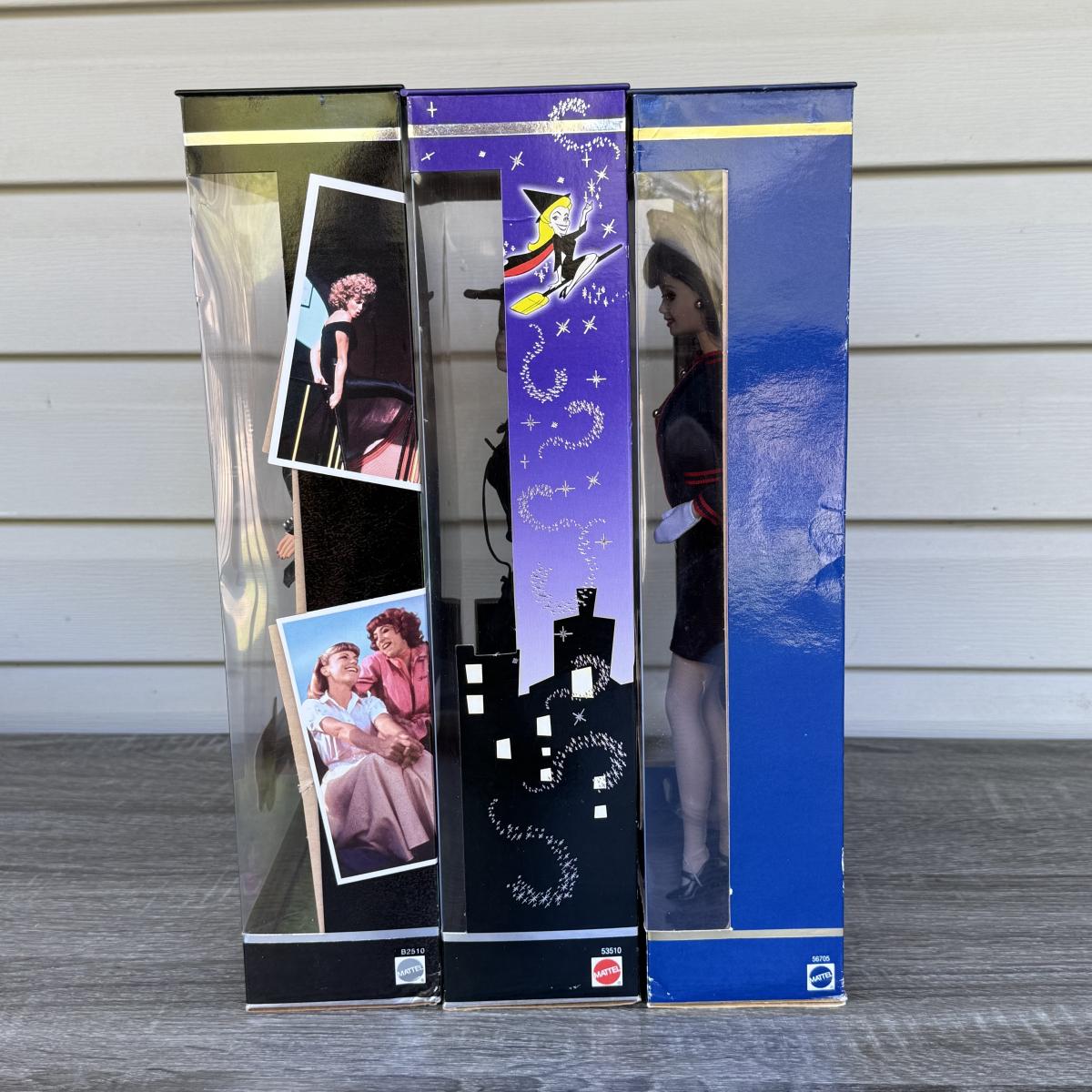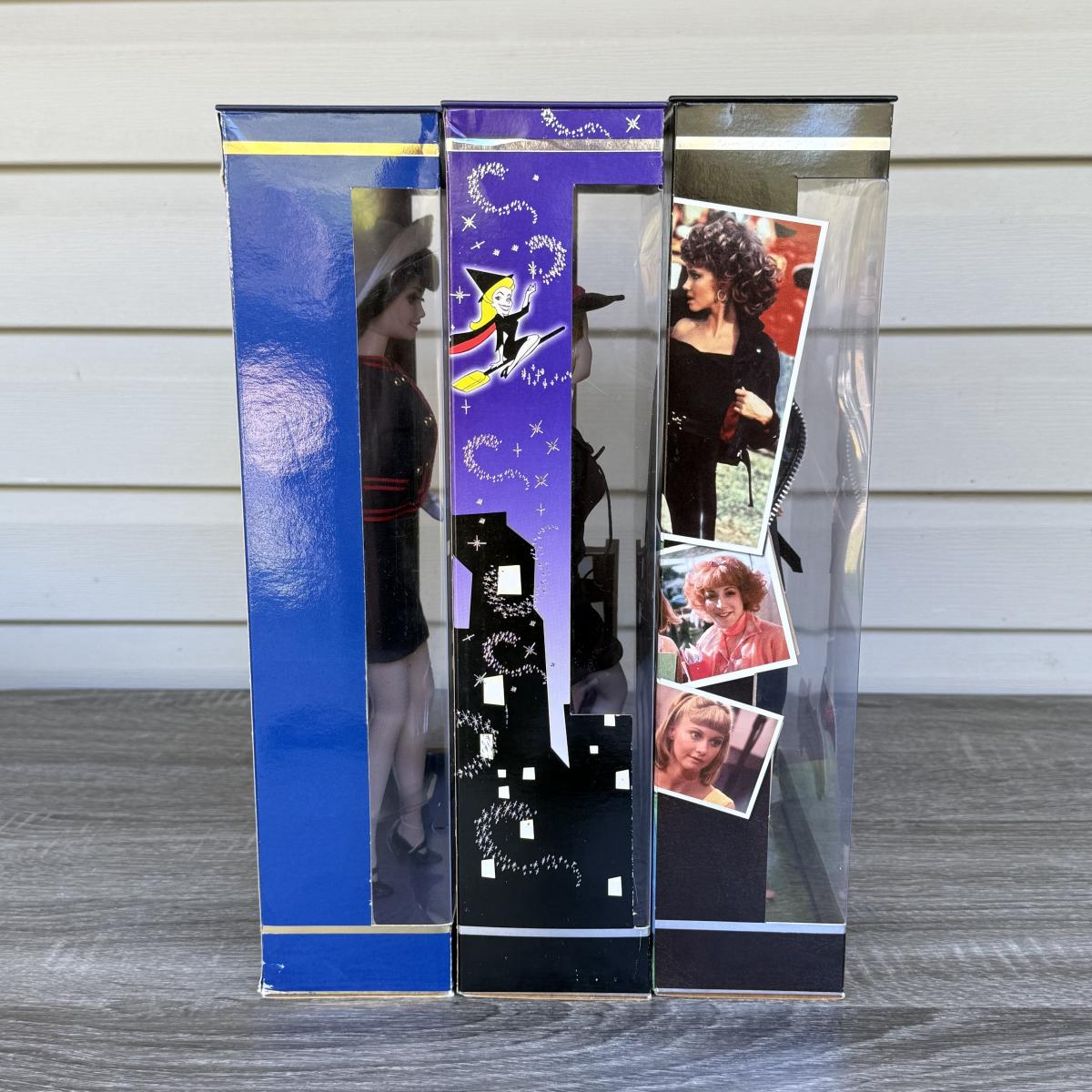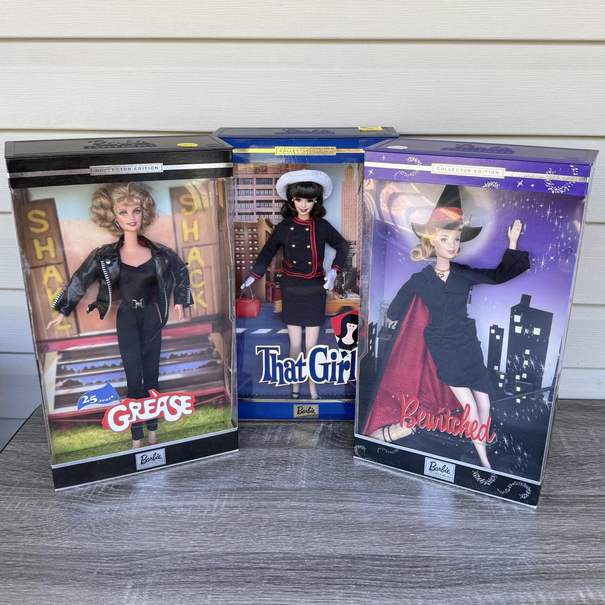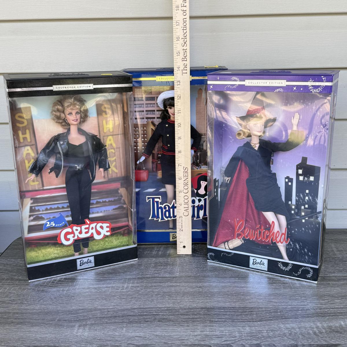 LOT 45P: NRFB Mattel Barbie Collector Edition Dolls w/ COAs: That Girl (56705), Bewitched (53570) & Grease Sandy (B2570)