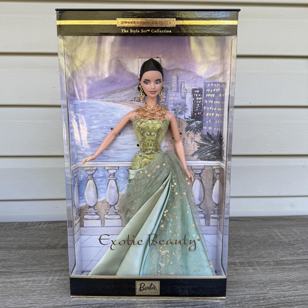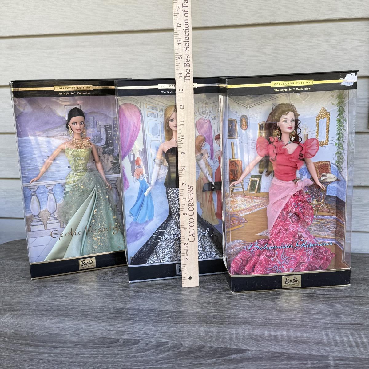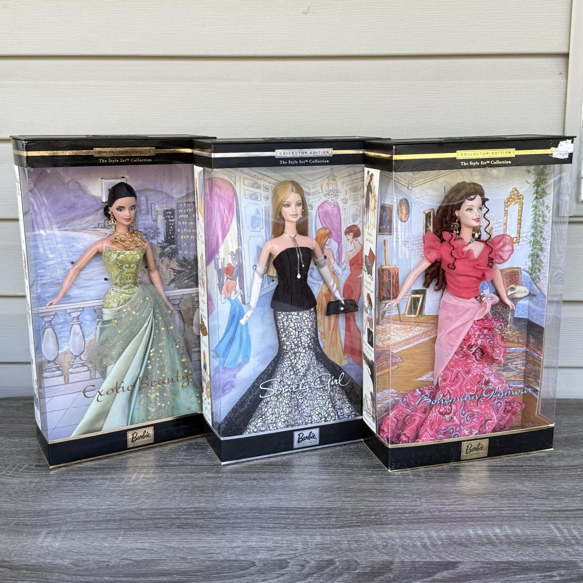 LOT 49P: NRFB Mattel Barbie Collector Edition The Style Set Dolls: 2003 Bohemian Glamour (B2512), 2002 Exotic Beauty (B0149) & 2001 Society Girl (56203)