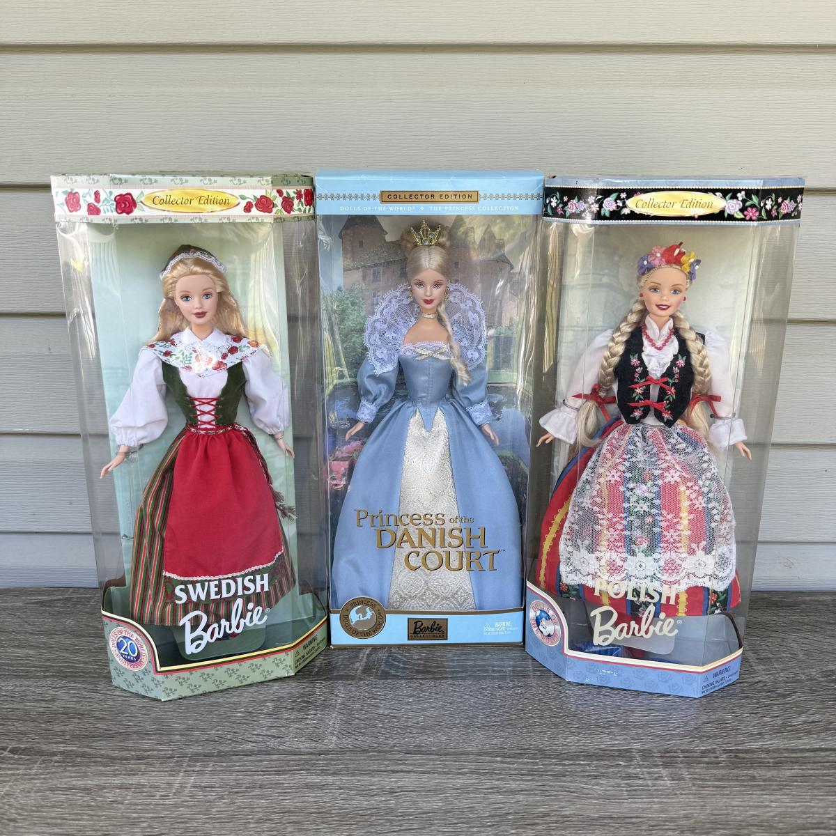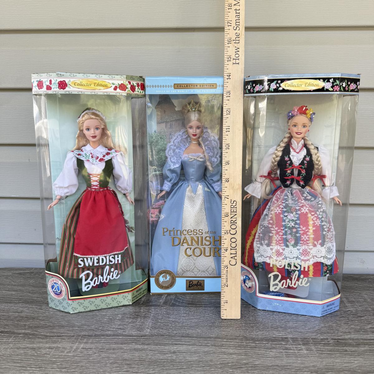 LOT 57H: NRFB Mattel Barbie Collector Edition Dolls of the World: 1997 Polish Barbie (18560), 1999 Swedish Barbie (24672) & 2002 Princess of the Danish Court (56216)