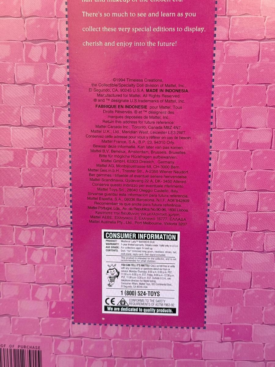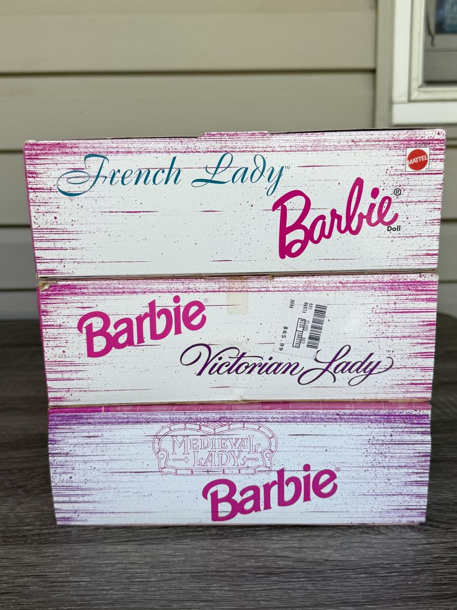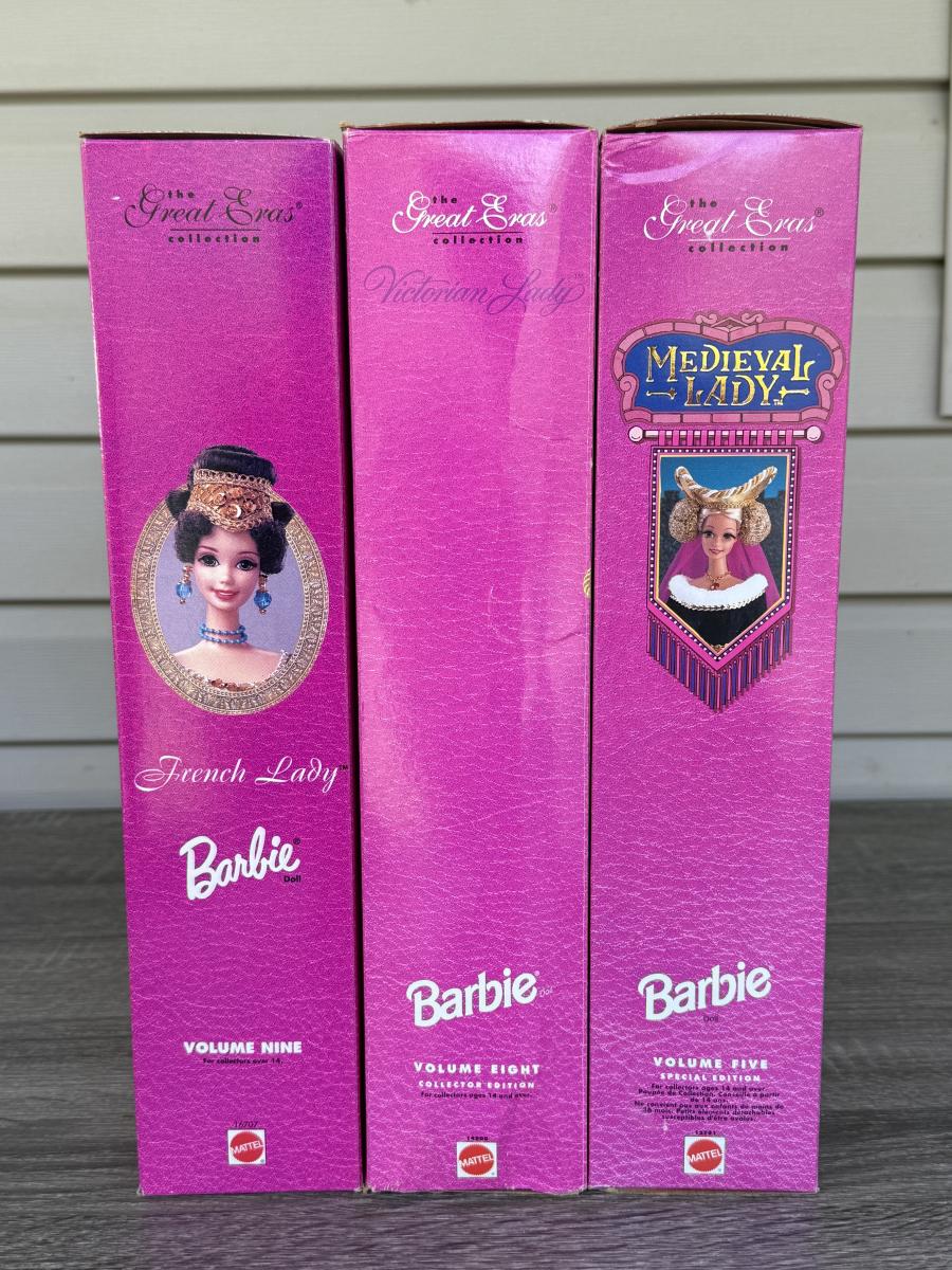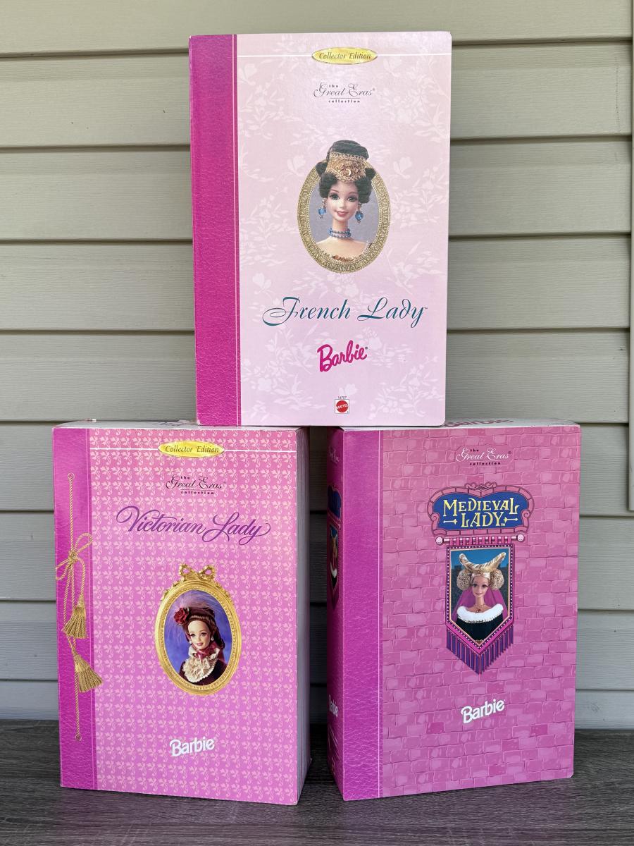 LOT 69H: NRFB Mattel Collector Edition Barbie Great Eras Collection Dolls: 1994 Medieval Lady (12791), 1995 Victorian Lady (14900) & 1996 French Lady (16707)