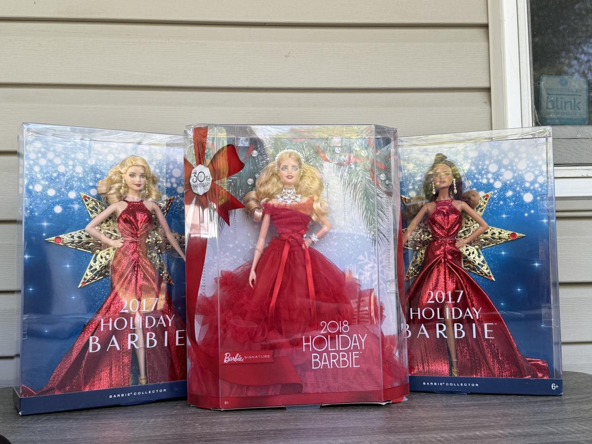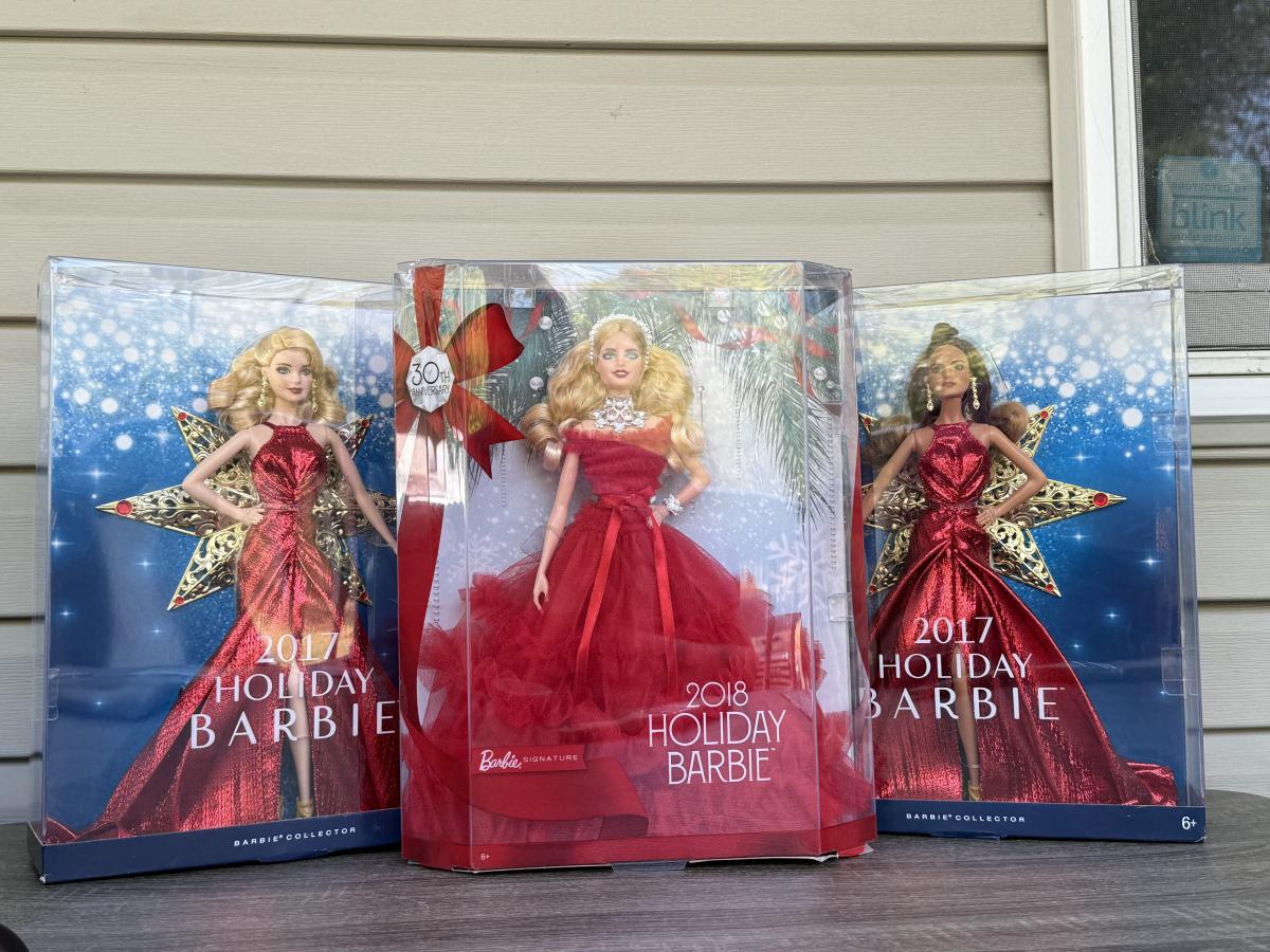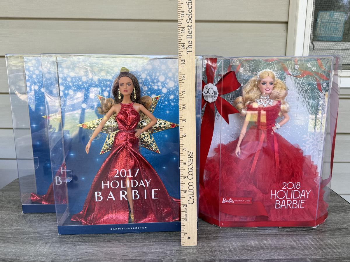 LOT 73P: NRFB Mattel Barbie Collector 2017 Holiday Barbies (DYX39 & DYX41) & Barbie Signature 30th Anniversary 2018 Holiday Barbie (FRN69)