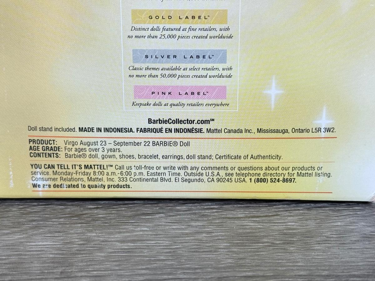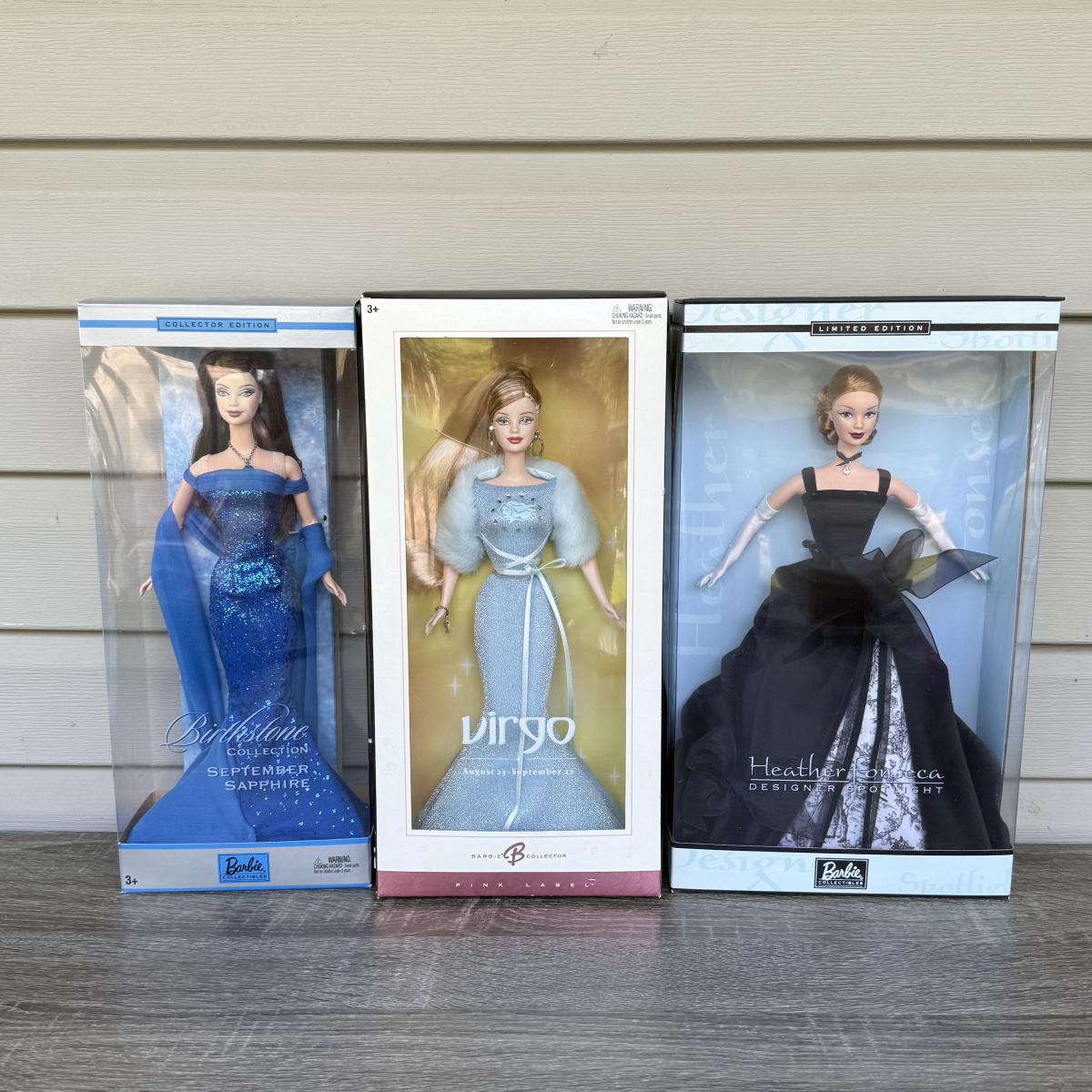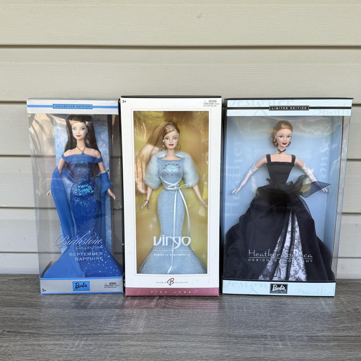 LOT 78P: NRFB Mattel Barbie: 2002 Collector Edition Birthstone September Sapphire (C5327), 2003 Ltd Edition Heather Fonseca Designer Spotlight (B3455) & 2004 Barbie Collector Pink Label Virgo (C3823)