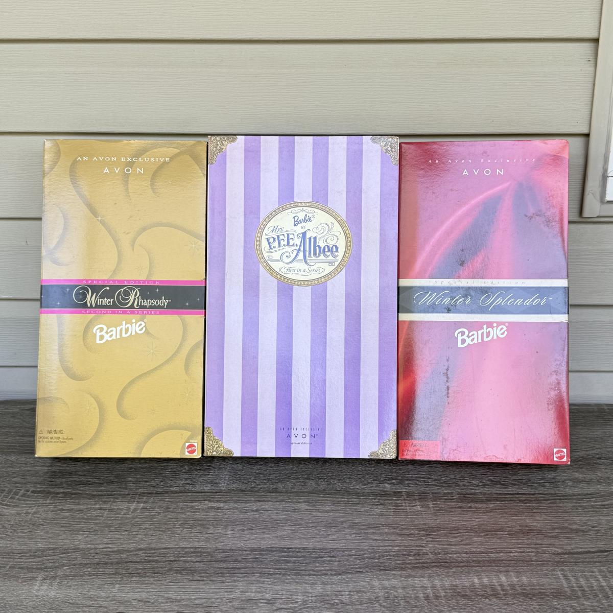 LOT 80P: NRFB late 1990s Mattel Avon Exclusive Special Edition Barbie Dolls: Winter Rhapsody (16353), Winter Splendor (19357) & Barbie as Mrs. PFE Albee (17690)