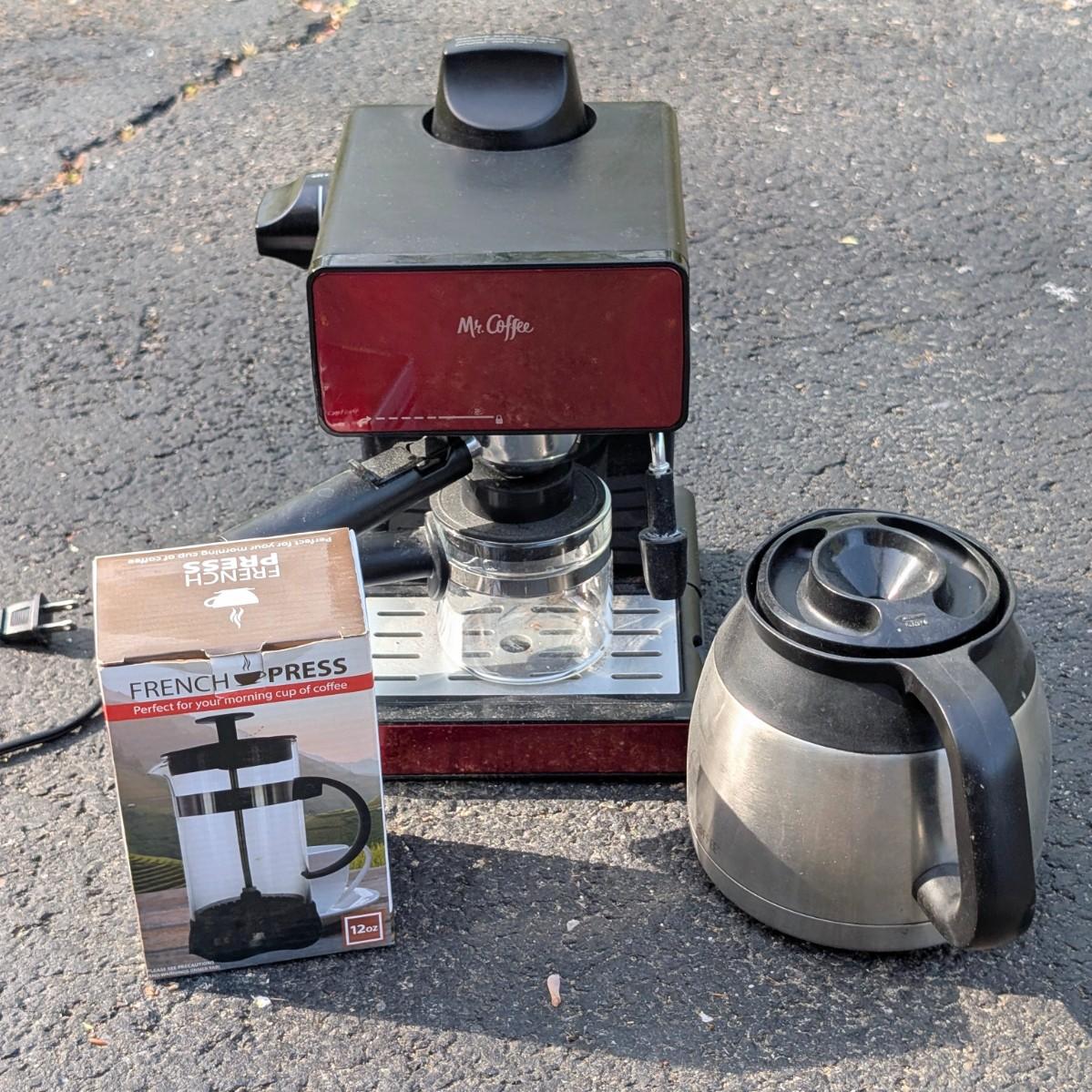 LOT 105G: Mr. Coffee Espresso/Cappuccino Maker With Accessories Model: BVM-ECM260R, Untested, 12 oz. French Press Coffee Maker & Mr. Coffee Stainless Steel Carafe