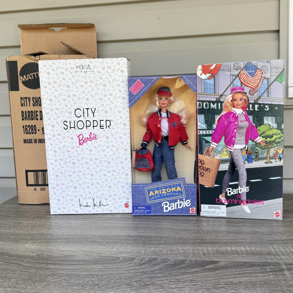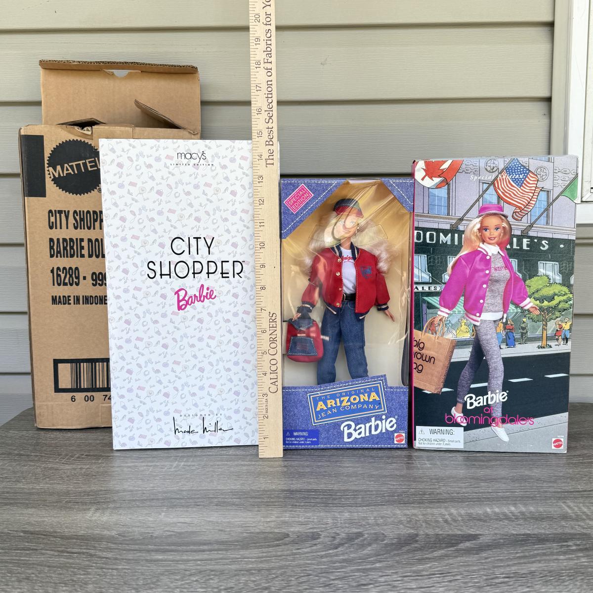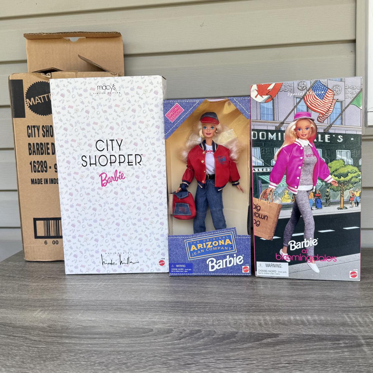 LOT 124P: NRFB Mattel Barbie Dolls: 1996 Ltd Edition Macy's City Shopper Barbie designed by Nicole Miller (16289) & Special Edition: 1995 Arizona Jean Co (15441) & 1996 Bloomingdales (16290)