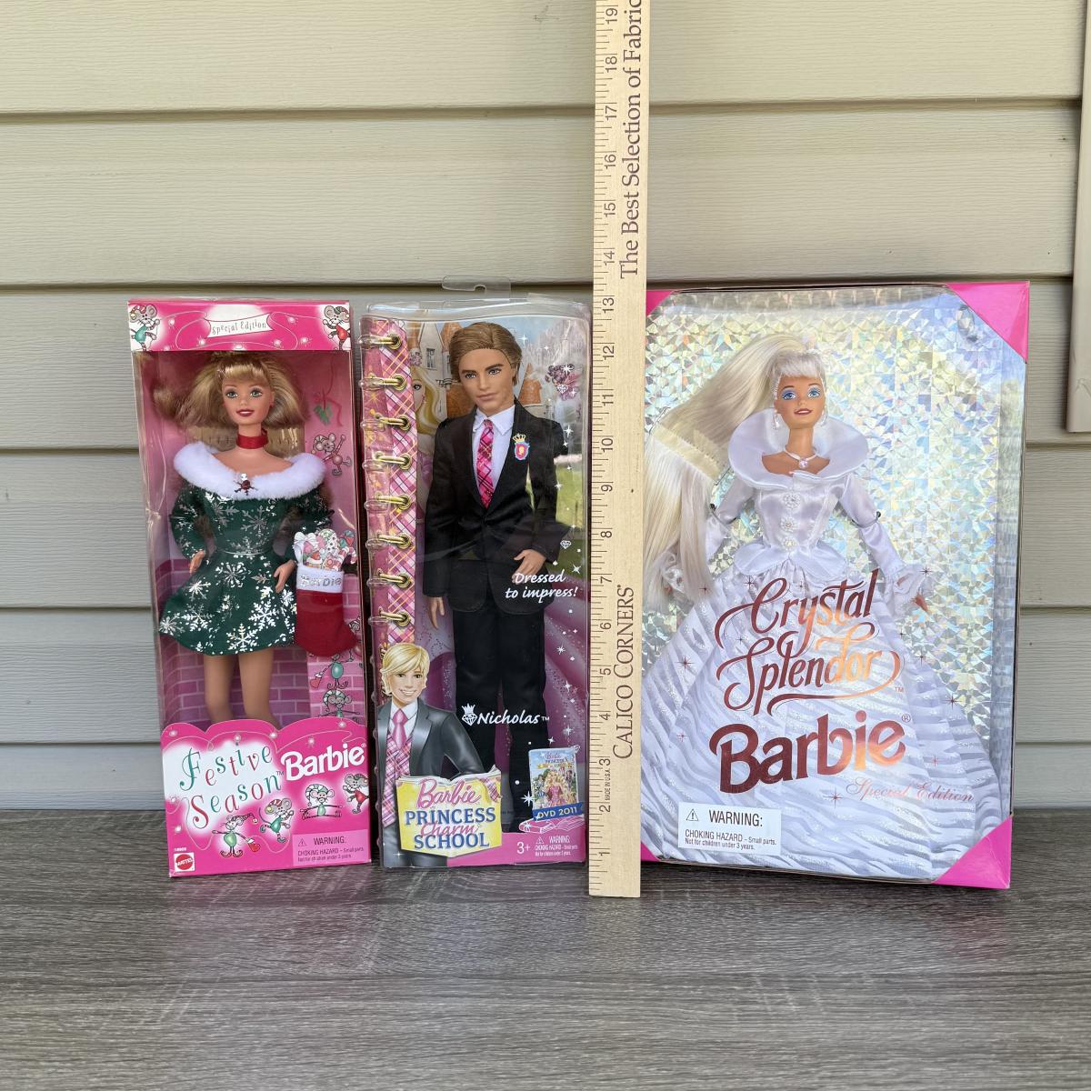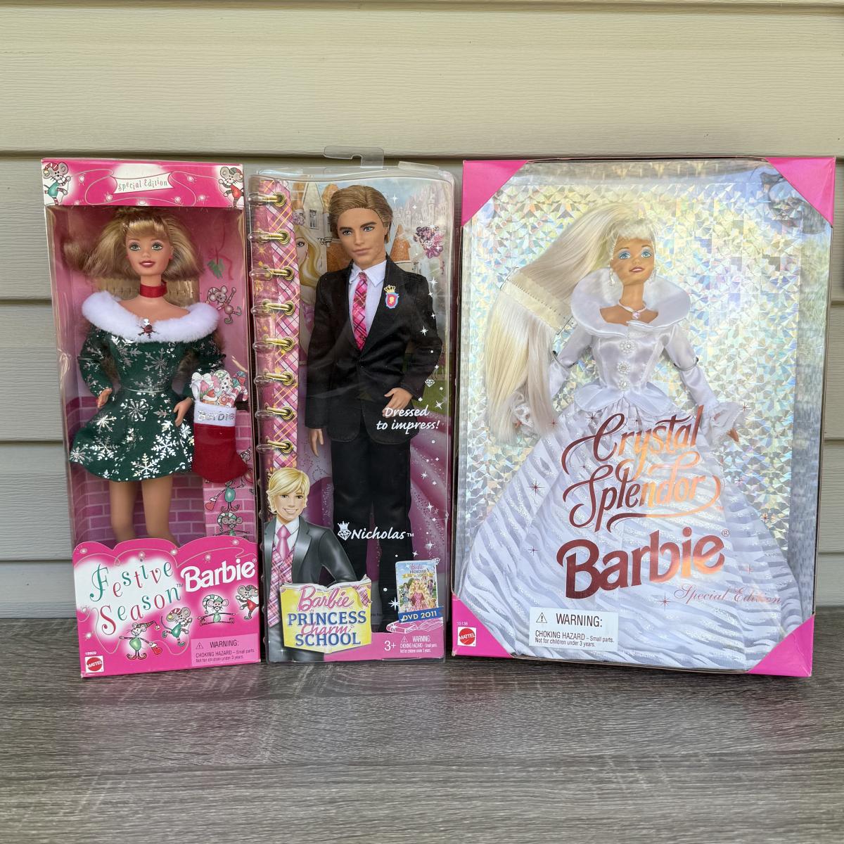 LOT 128P: NRFB Mattel Barbie Dolls: 2011 Princess Charm School Nicholas (V6828) & Special Edition: 1995 Crystal Splendor (15136) & 1997 Festive Season (18909)