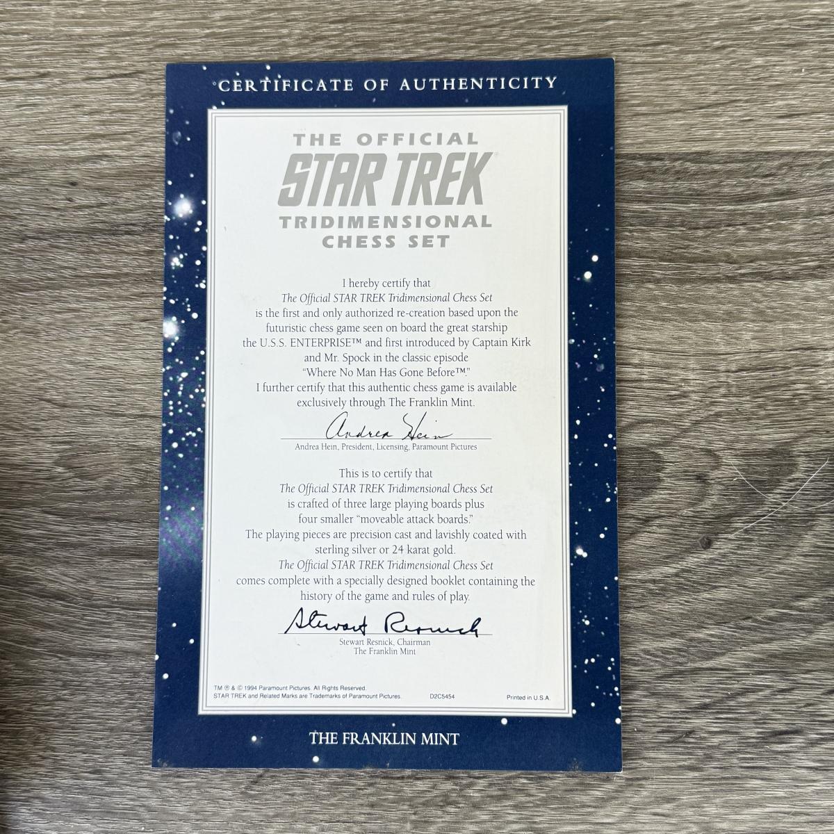 LOT 143S: 1994 Franklin Mint Official Star Trek Tridimensional Chess Set w/ COA & Display Case