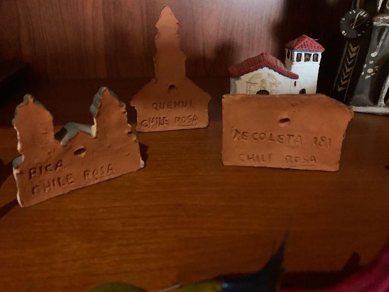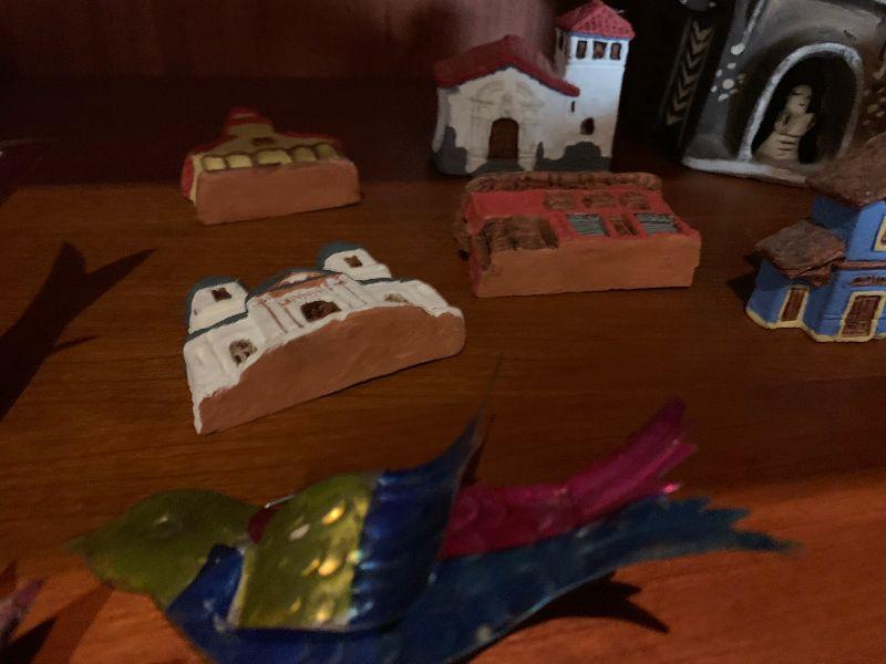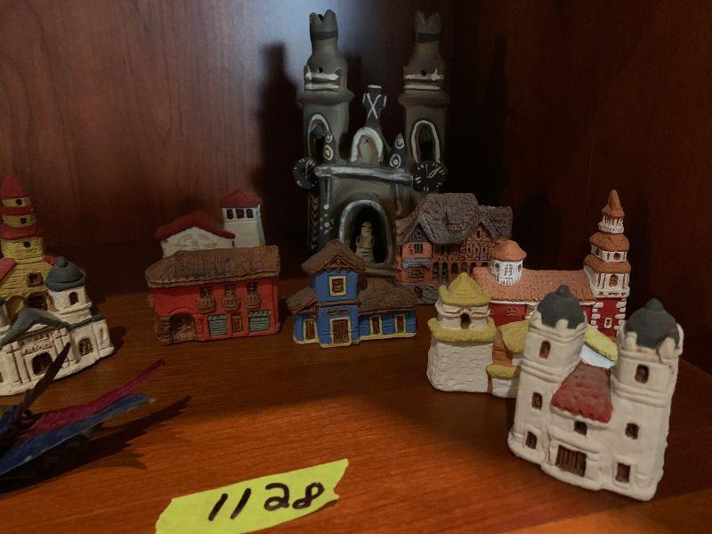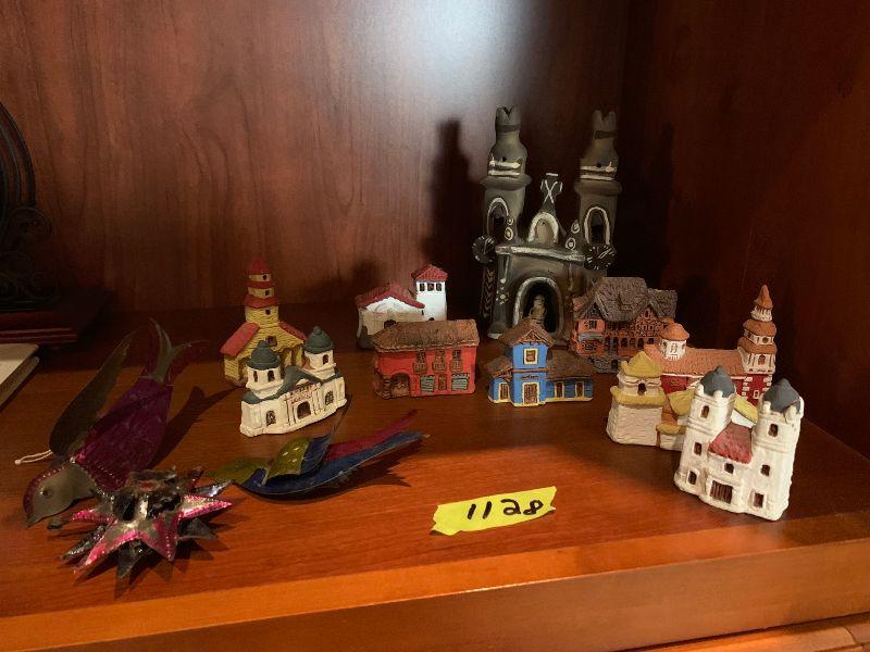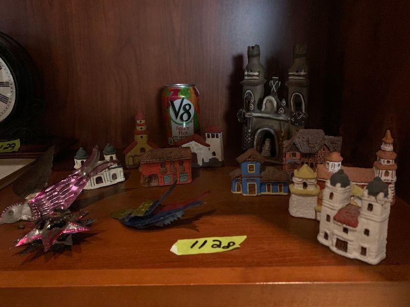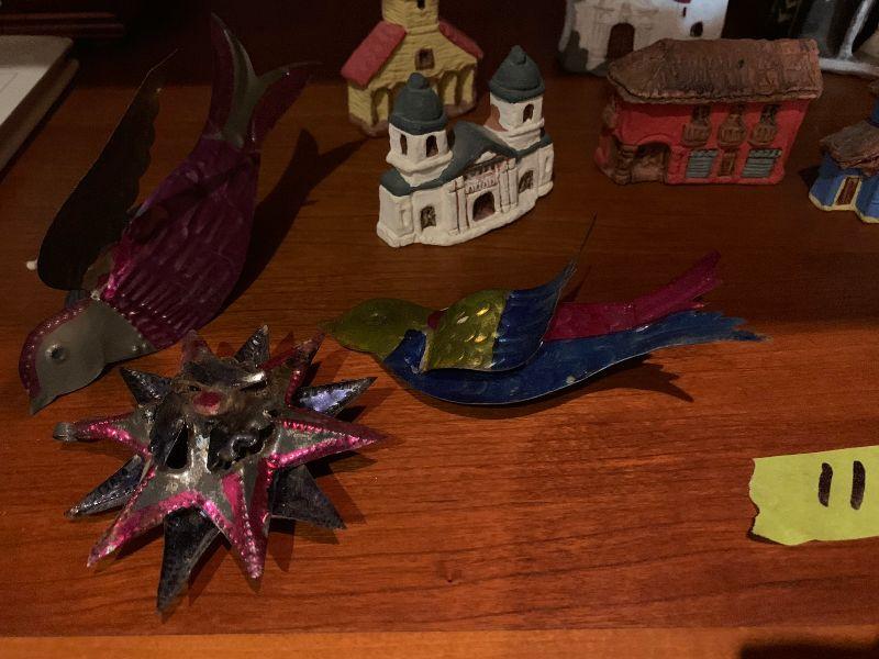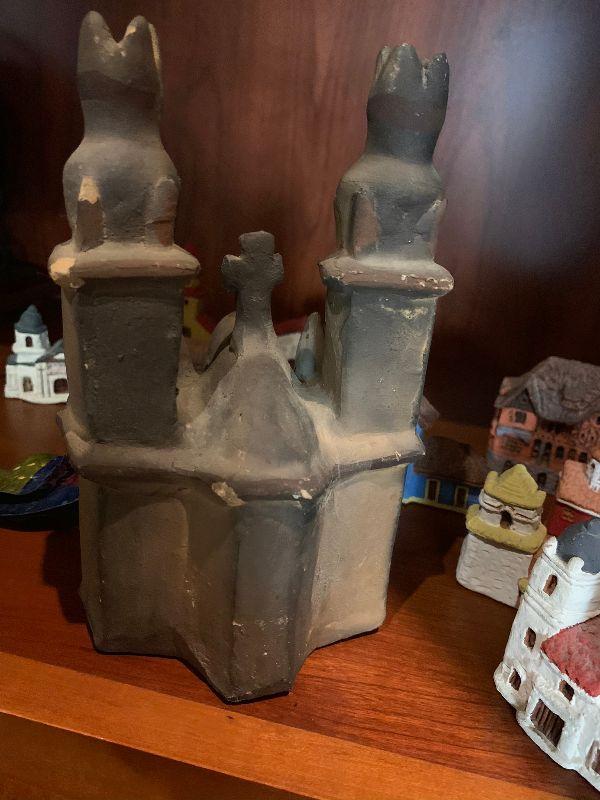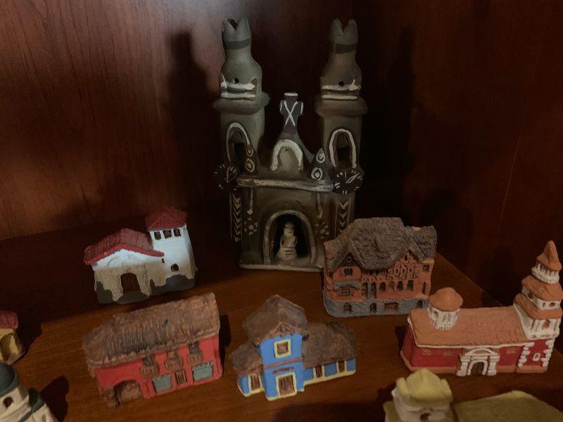 3 vintage metal xmas ornaments and 20 clay houses church and more