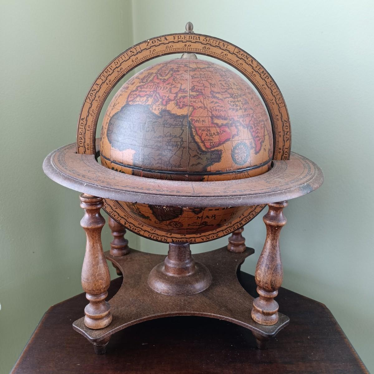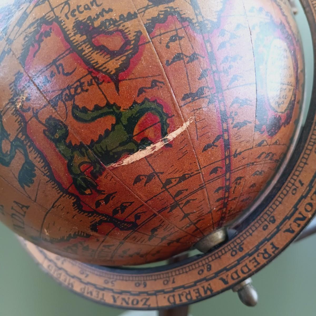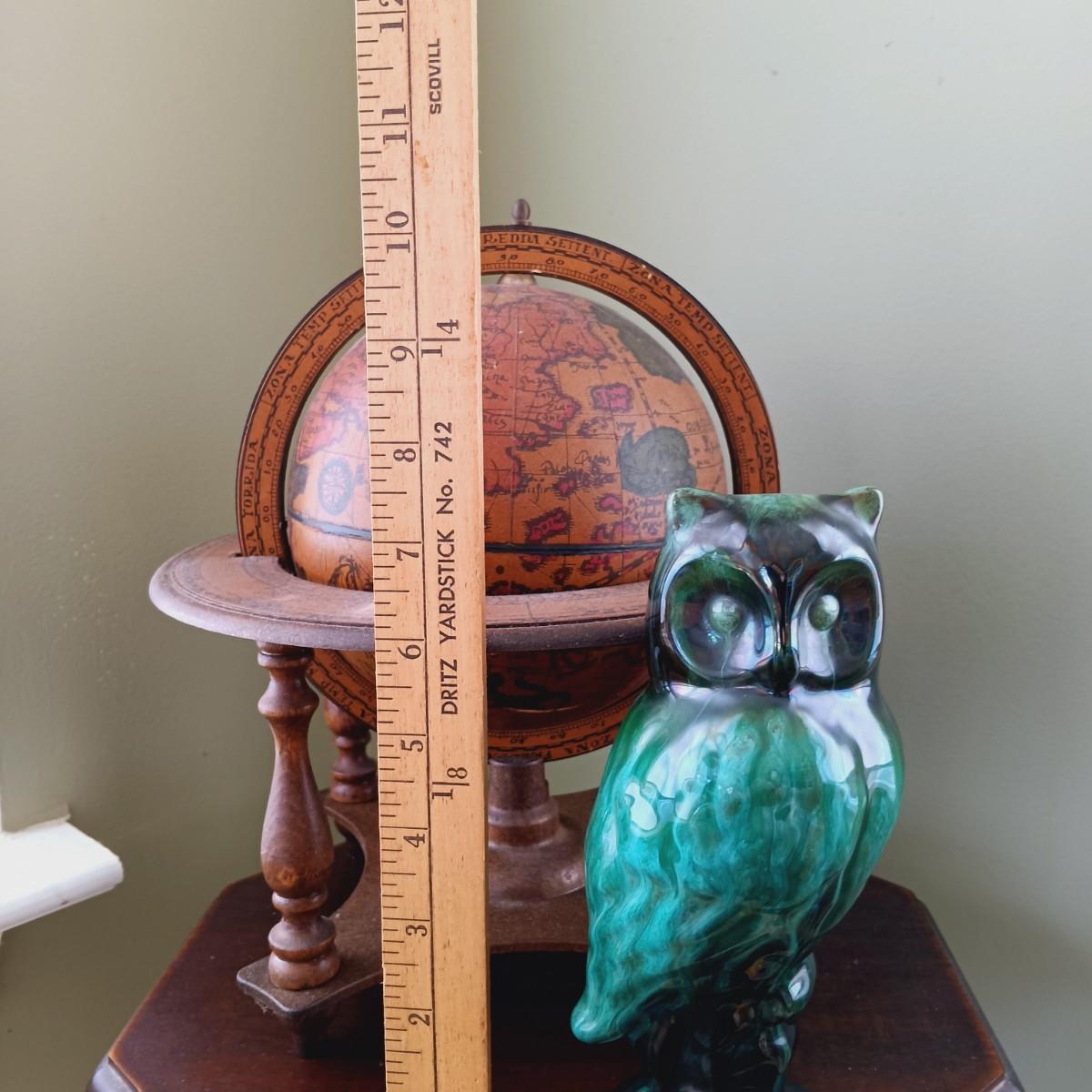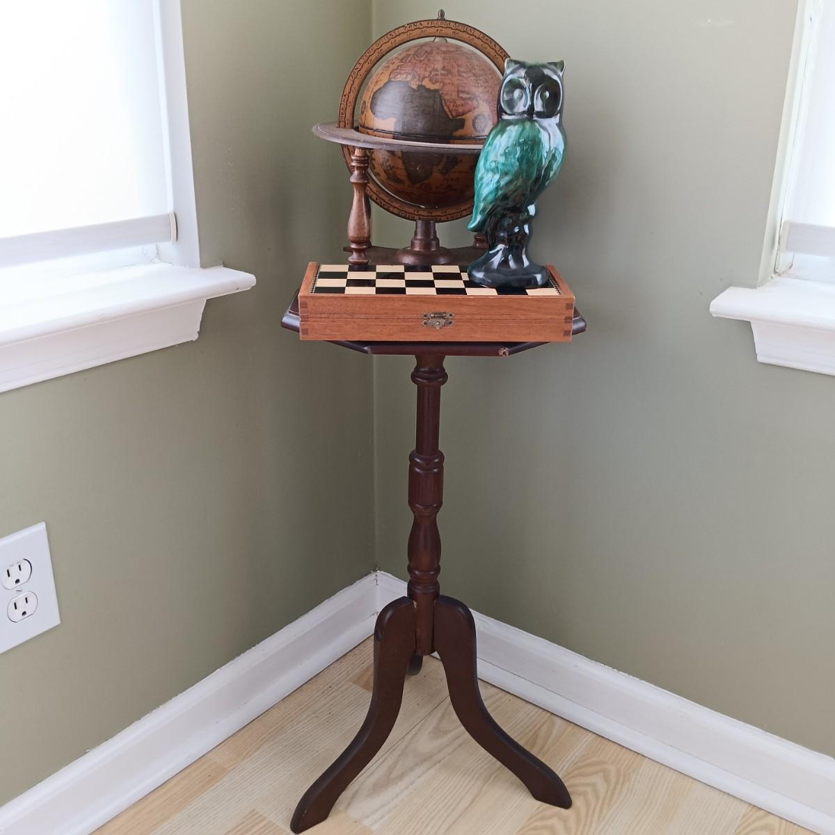 LOT 13: Old World Globe Made in Italy, Pottery Owl, Vintage Magnetic Travel Chess Set & Octogonal Side Table