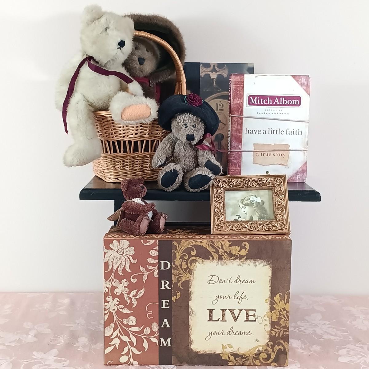 LOT 22: Boyd's Bears with Wood Step Stool, Olgemini Selections Picture Frame & More