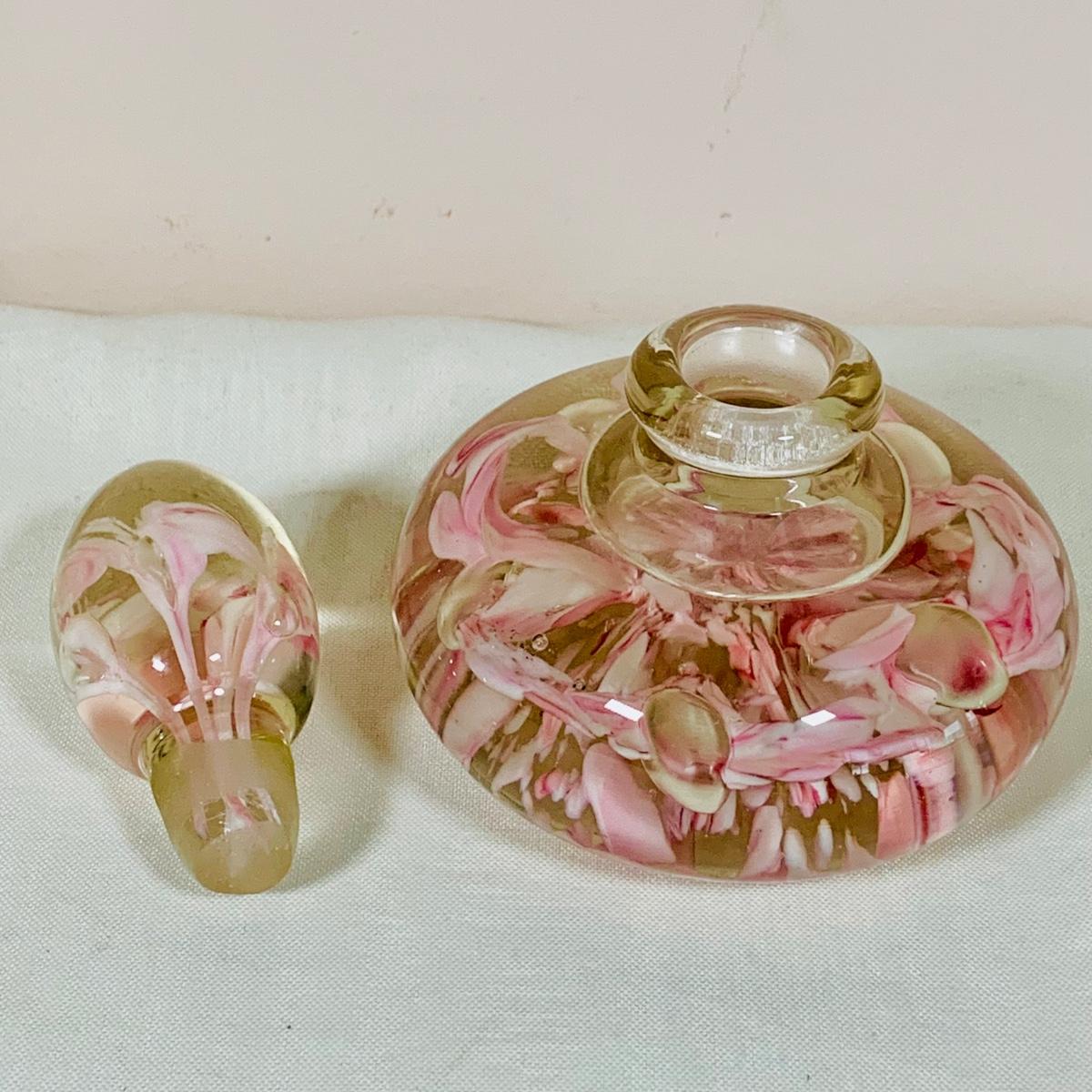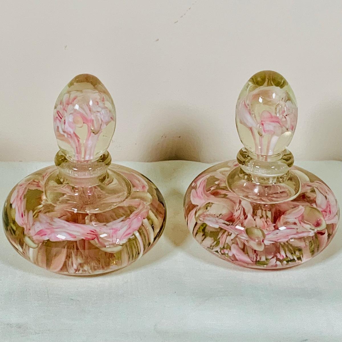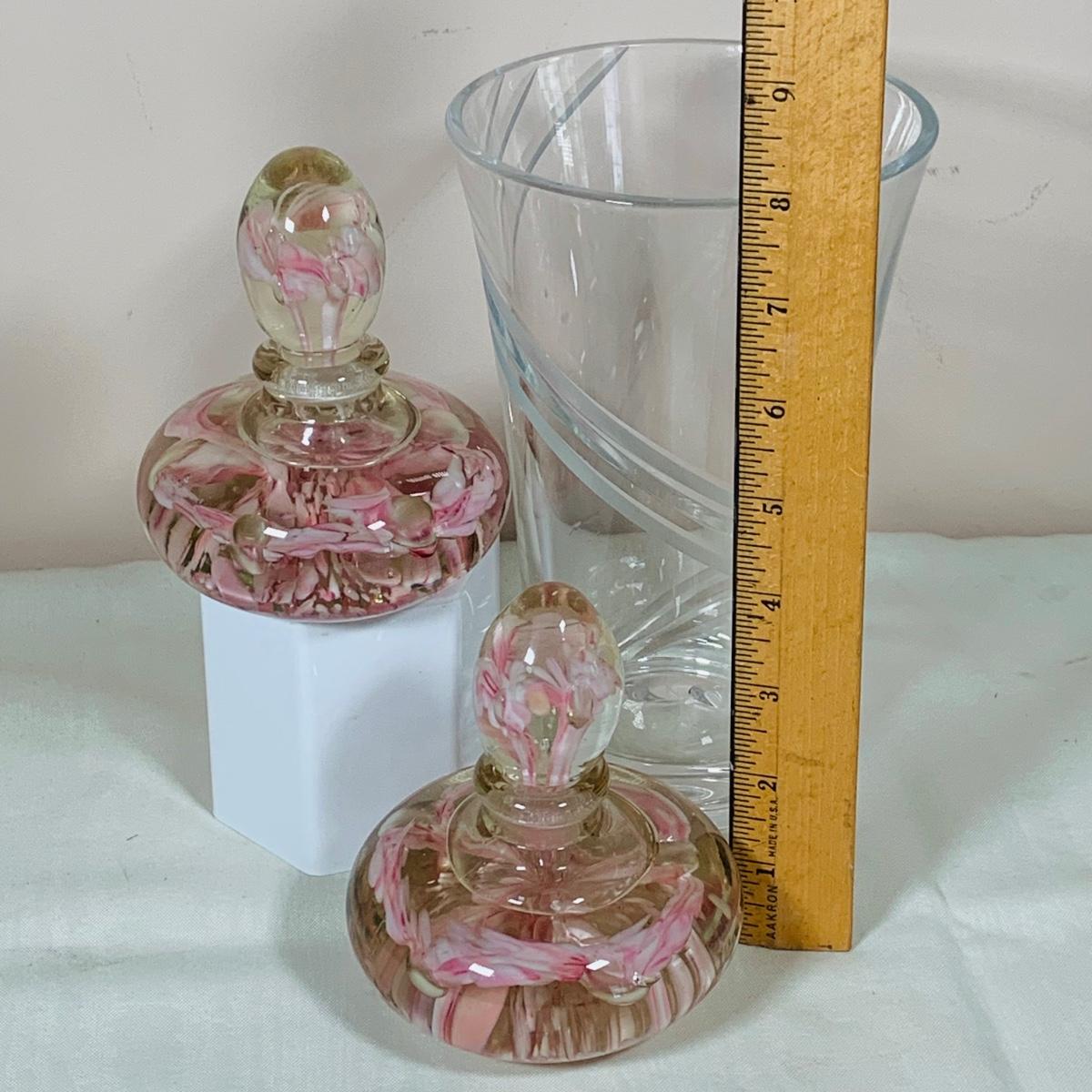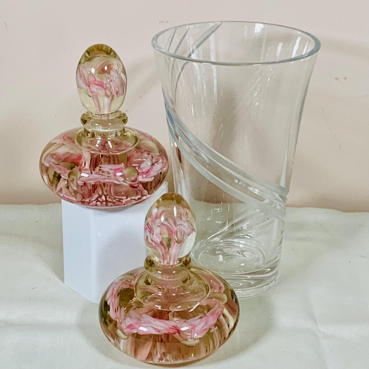 LOT 33: Set of Two (2) Beautiful Art Glass Perfume Bottles and a Cut Glass Vase