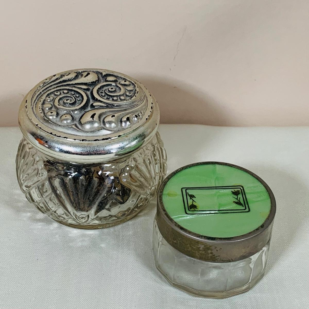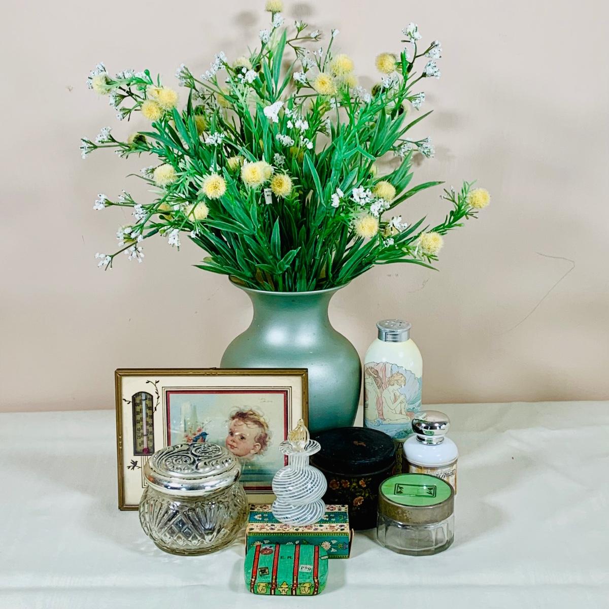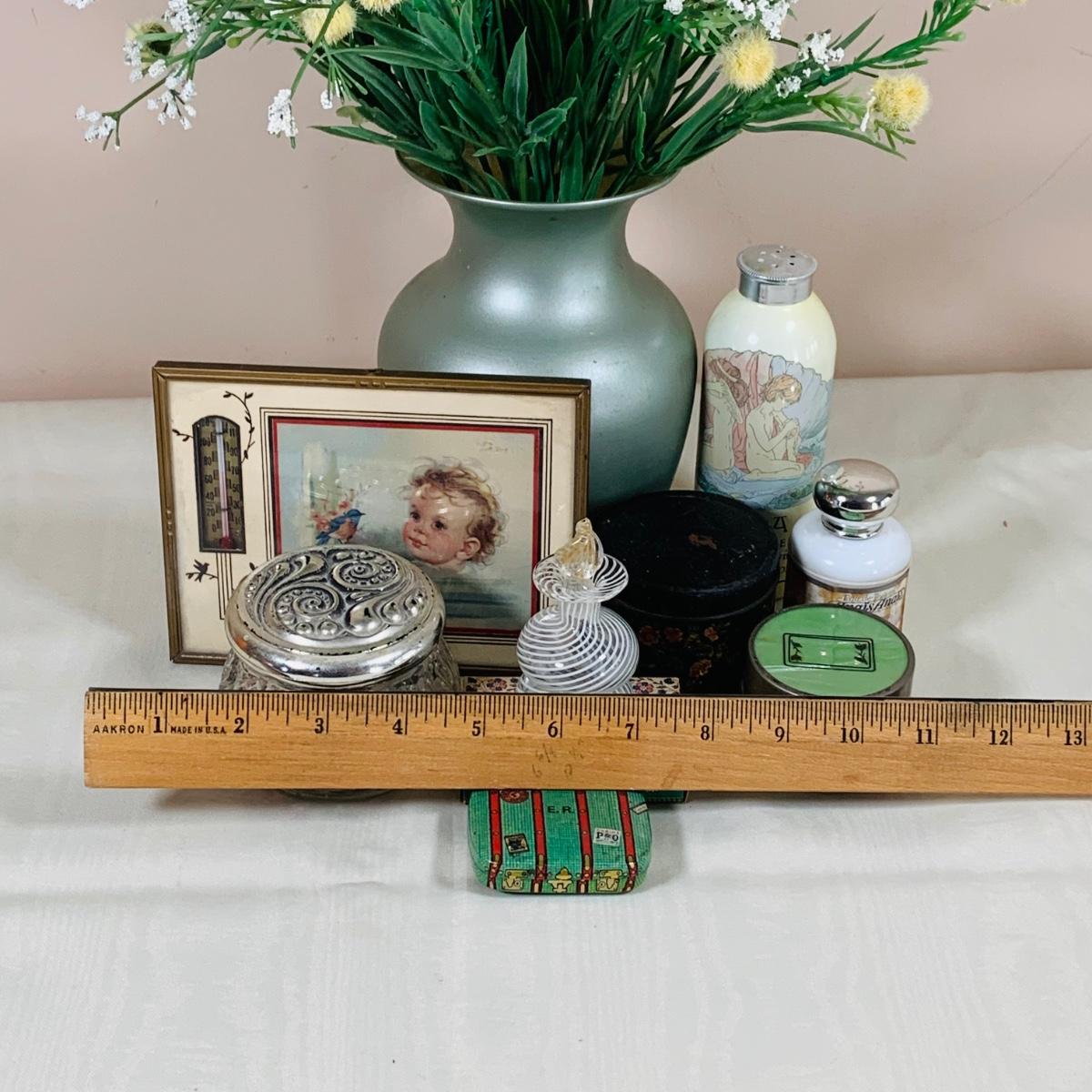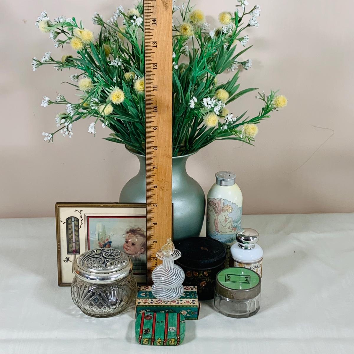 LOT 45: Beautiful Art Glass Perfume Bottle, Glass Jars with Lids, Vintage Thermometer Advertisement, Perfume, Vase with Faux Flowers