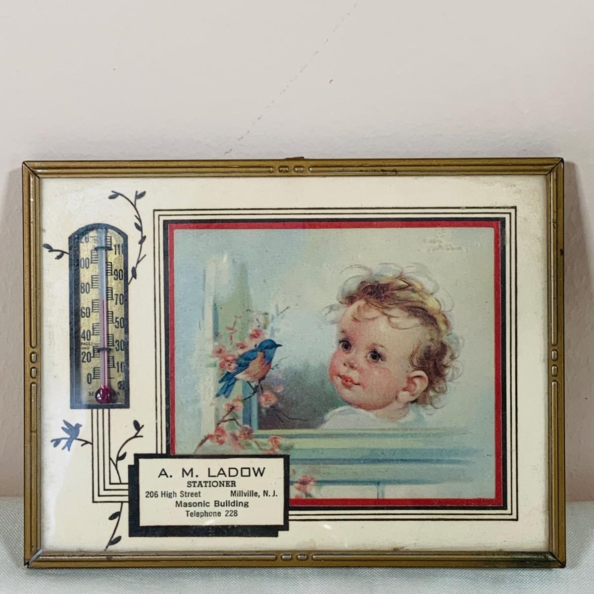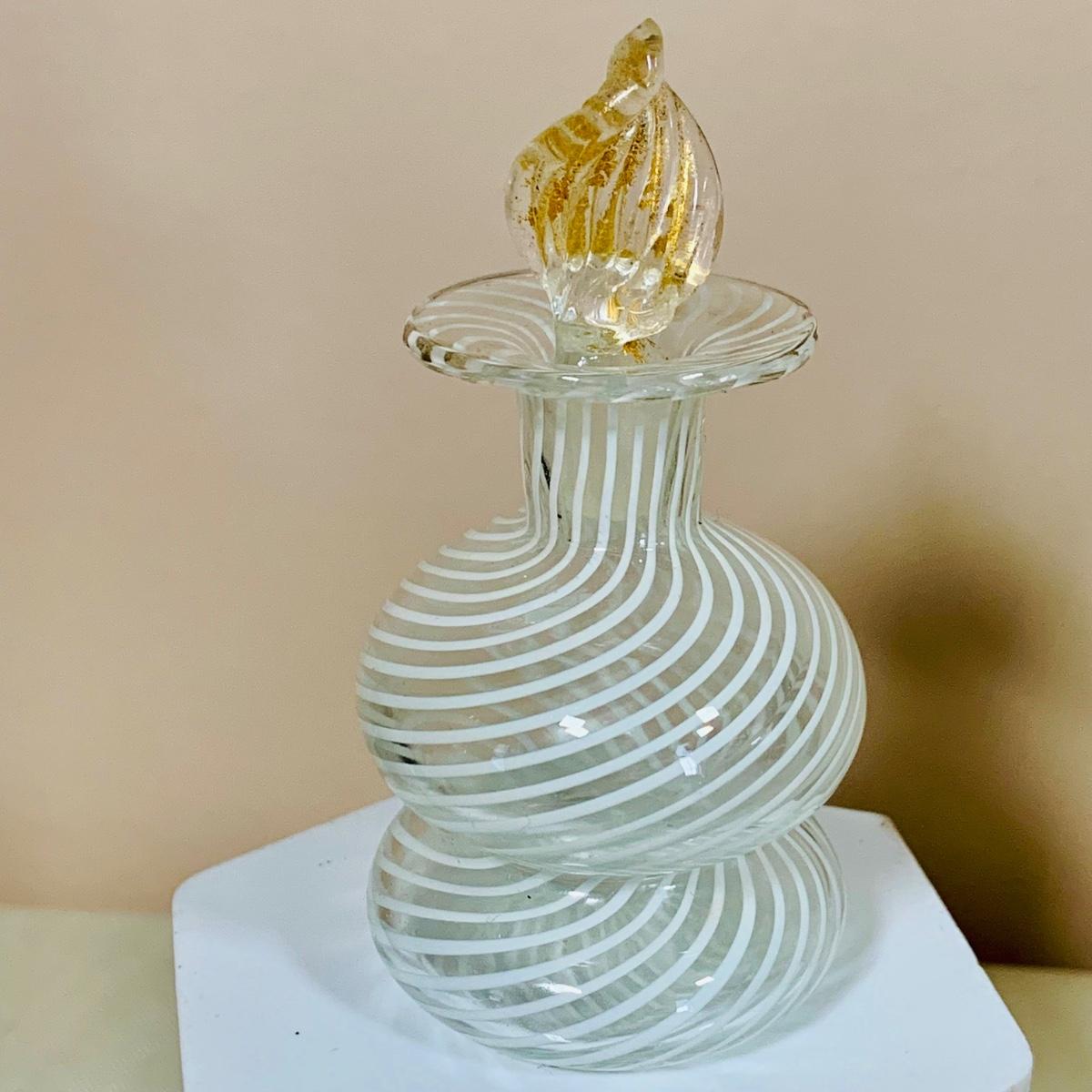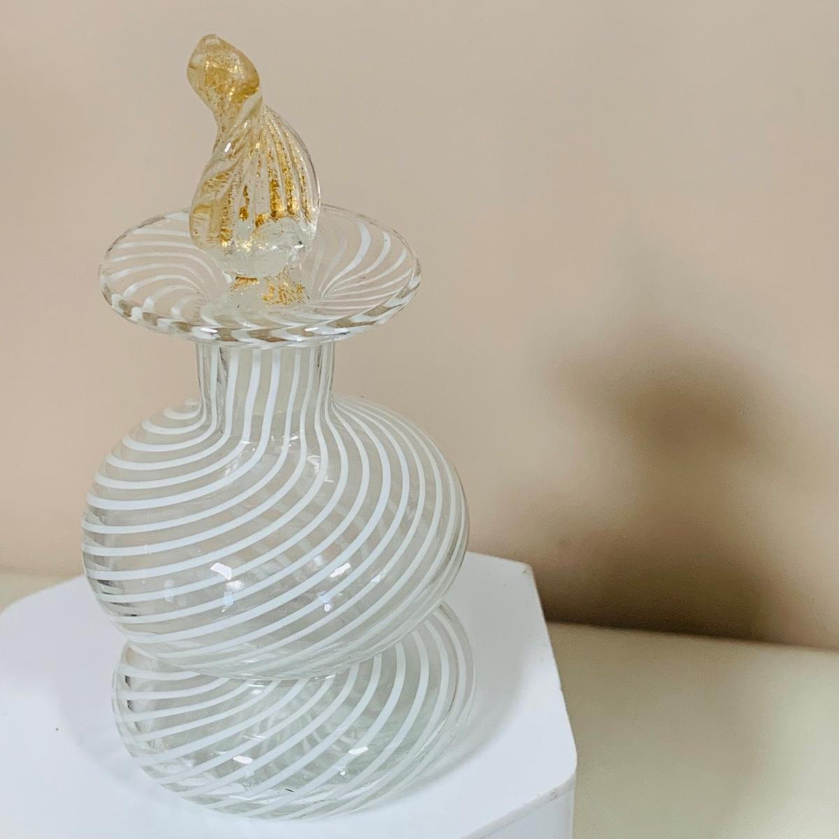 LOT 45: Beautiful Art Glass Perfume Bottle, Glass Jars with Lids, Vintage Thermometer Advertisement, Perfume, Vase with Faux Flowers