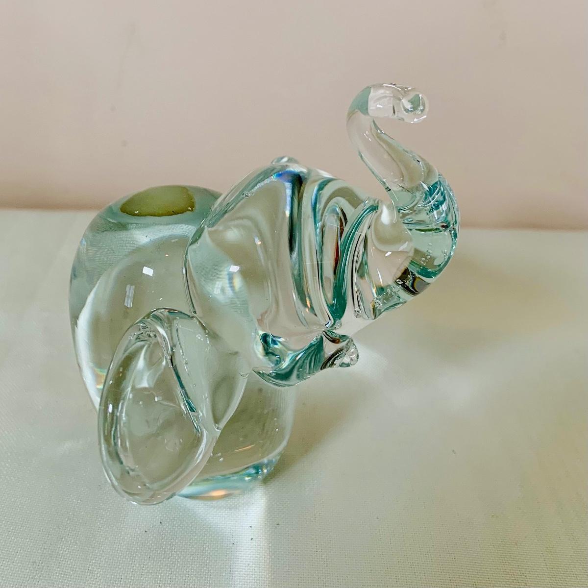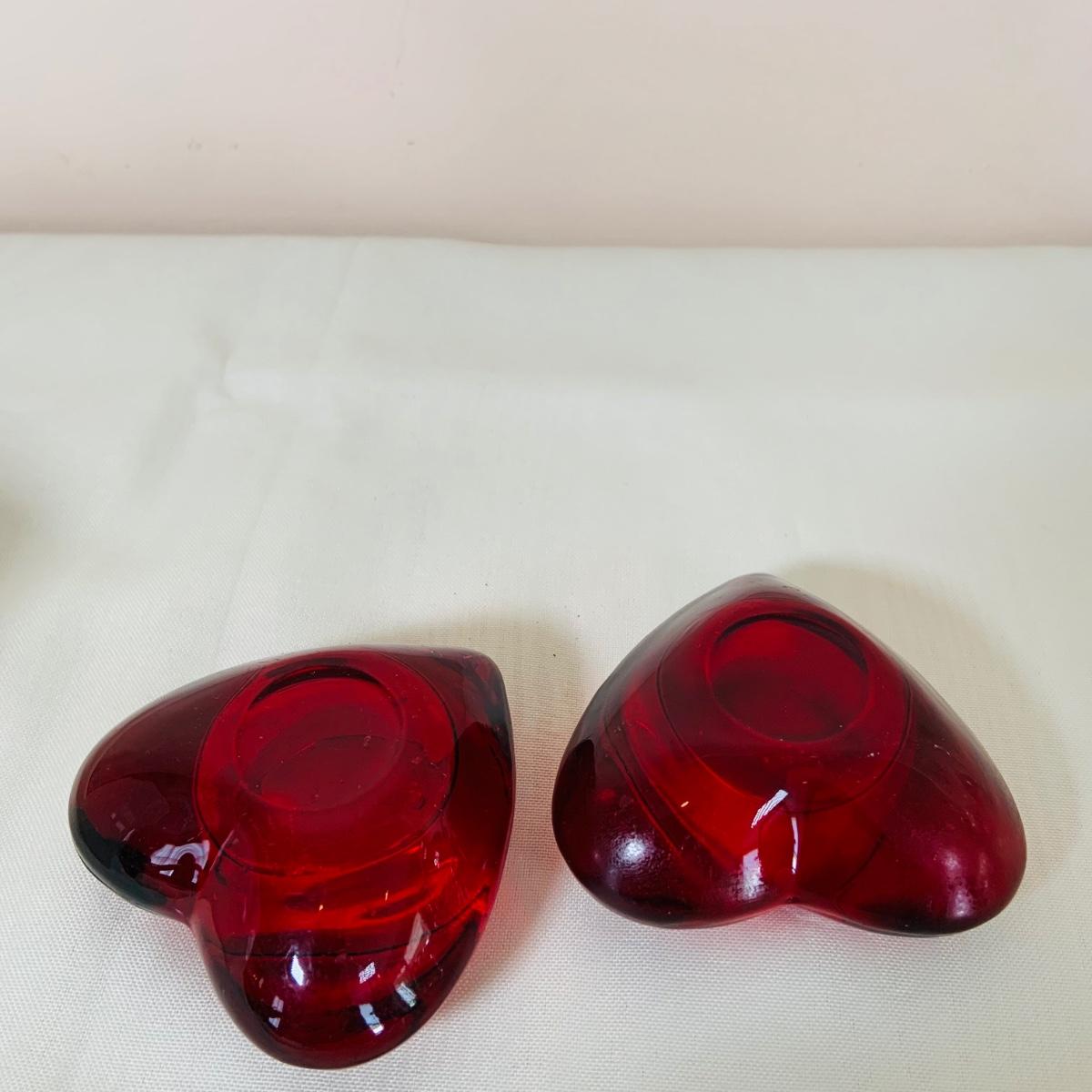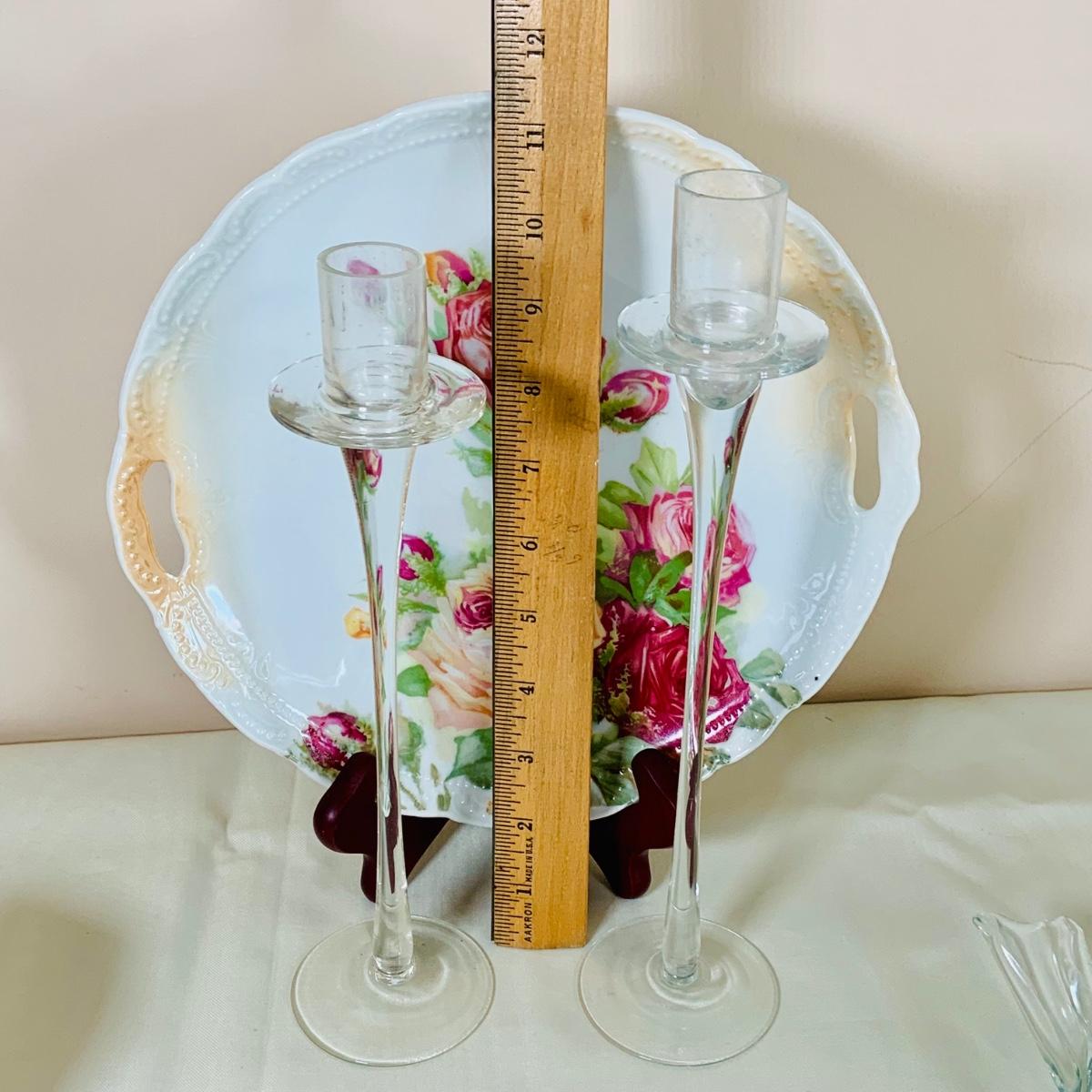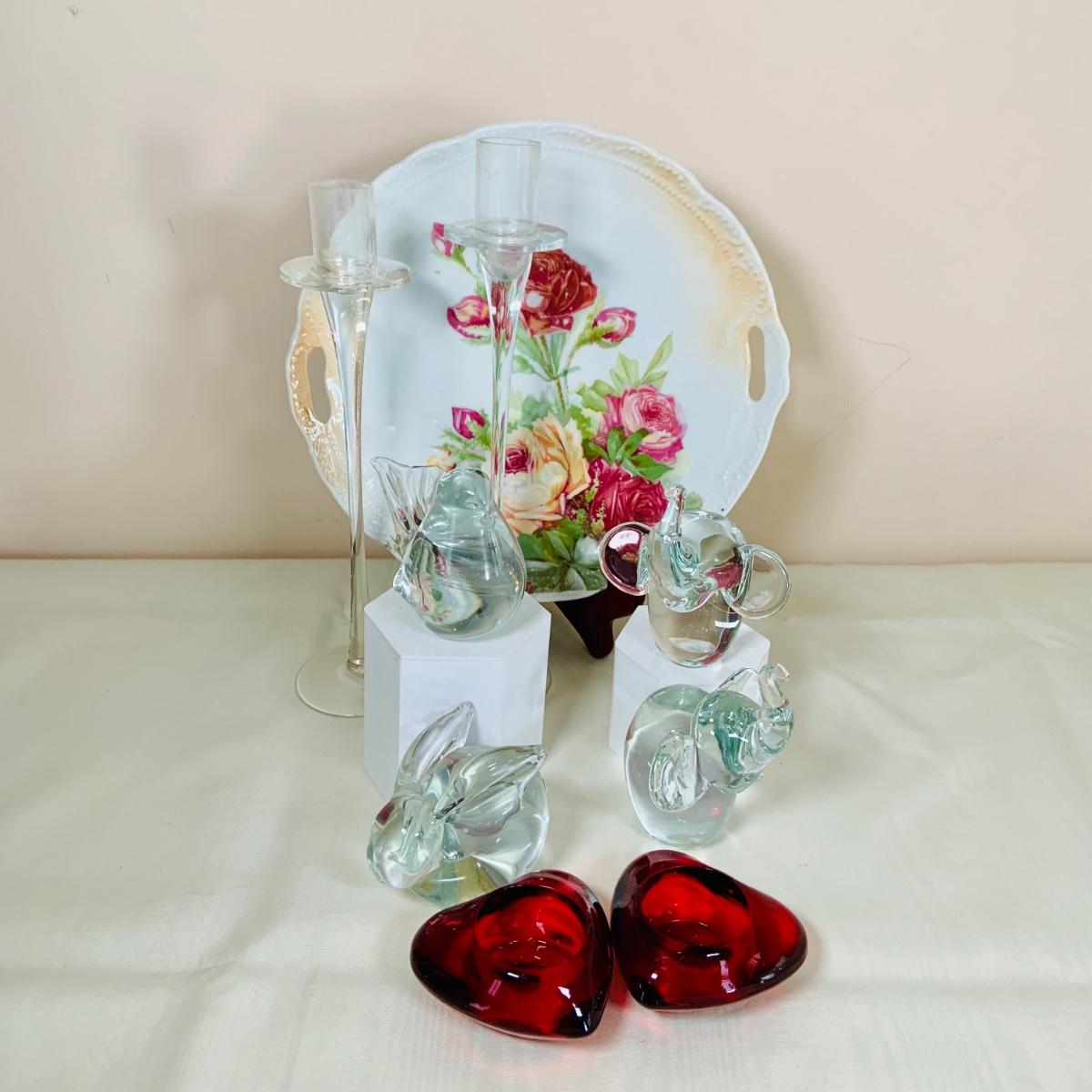LOT 49: Glass Animal Figurines, Elephants, Bird and Rabbit, Glass Red Heart and Clear Glass Candle Holders and Vintage Floral Plate