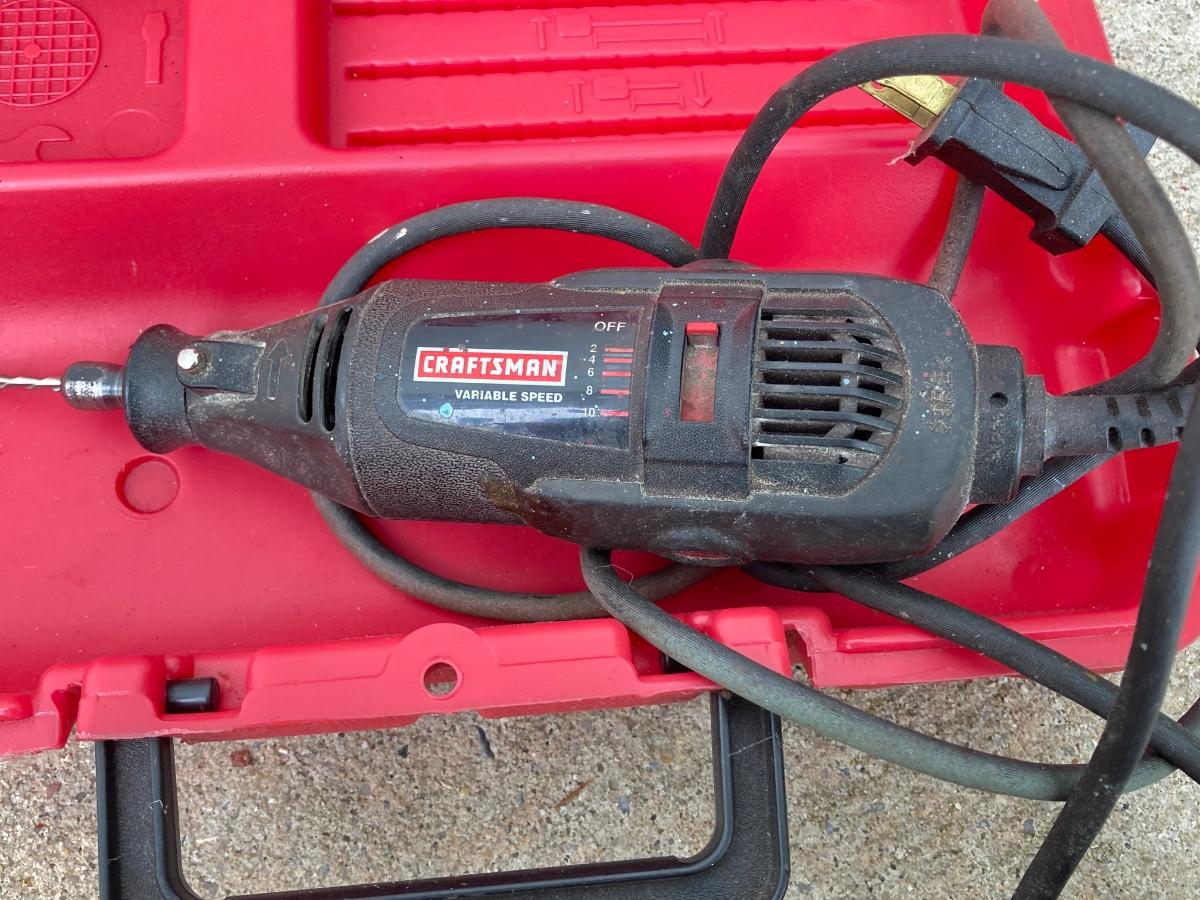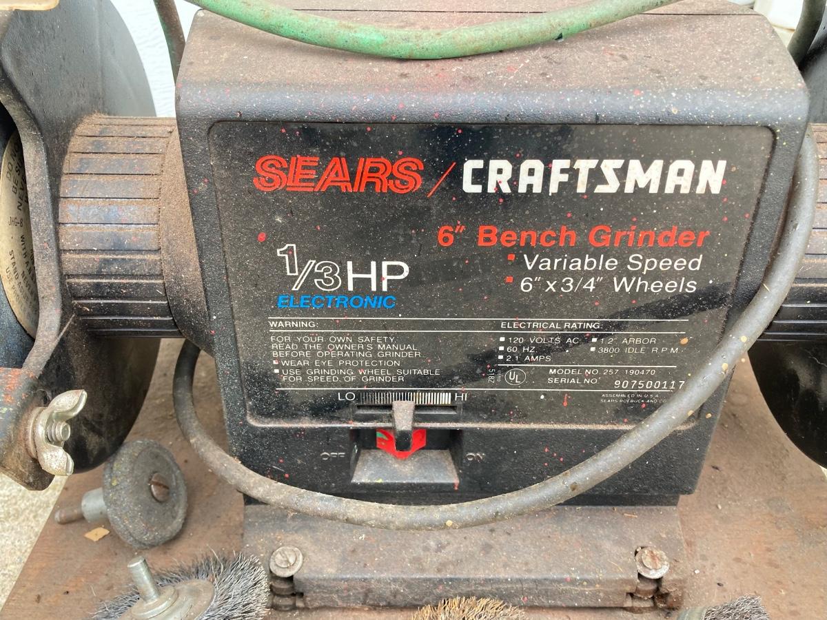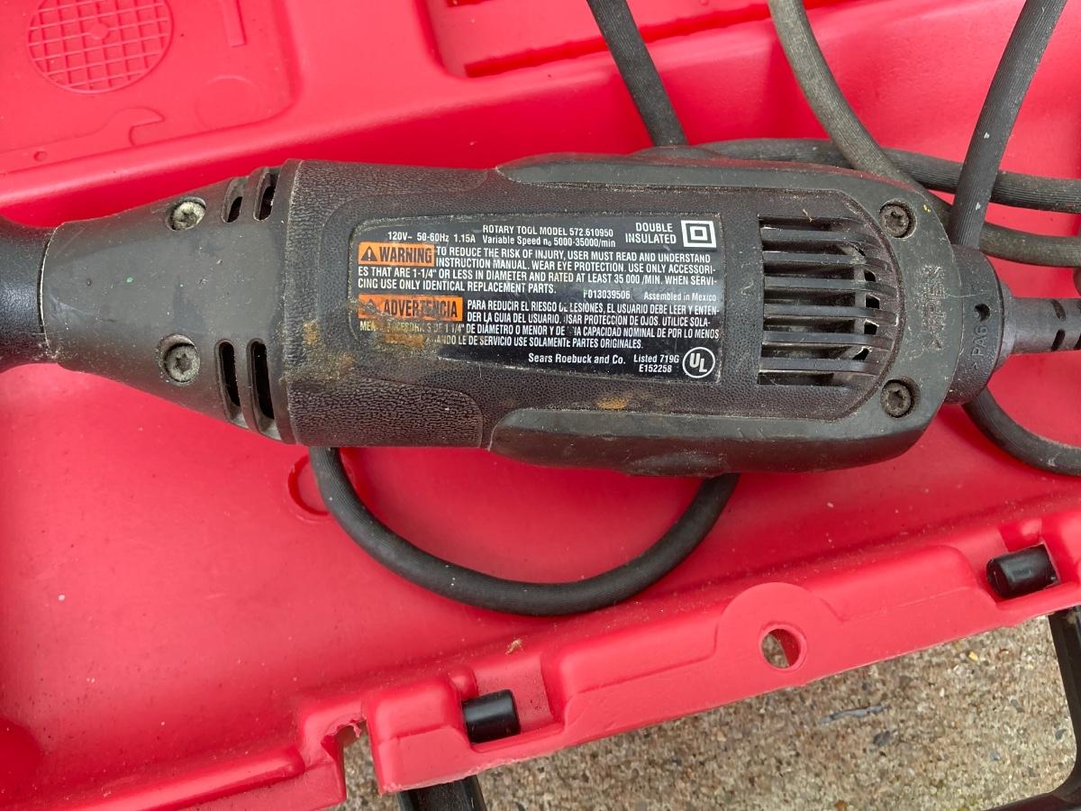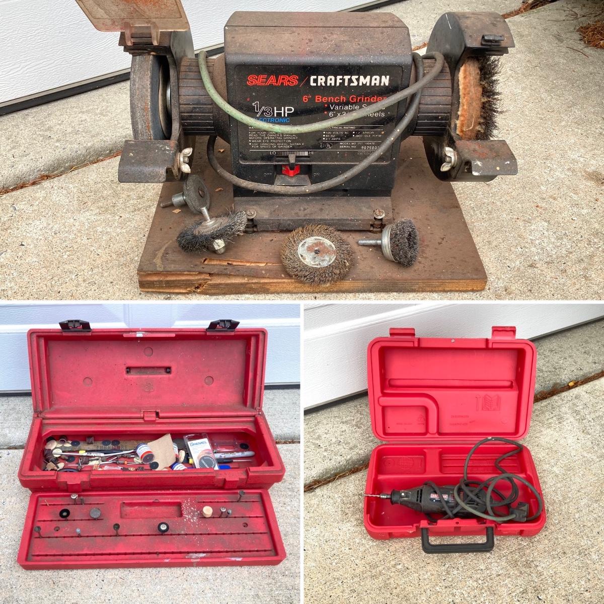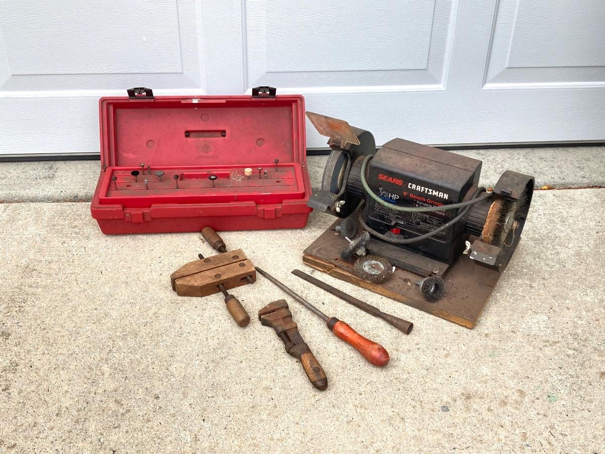LOT 58: Sears Craftsman Bench Grinder Model 257 190470, Craftsman Rotary Tool Model 572.610950 with Cases / Accessories and Vintage Hand Tools