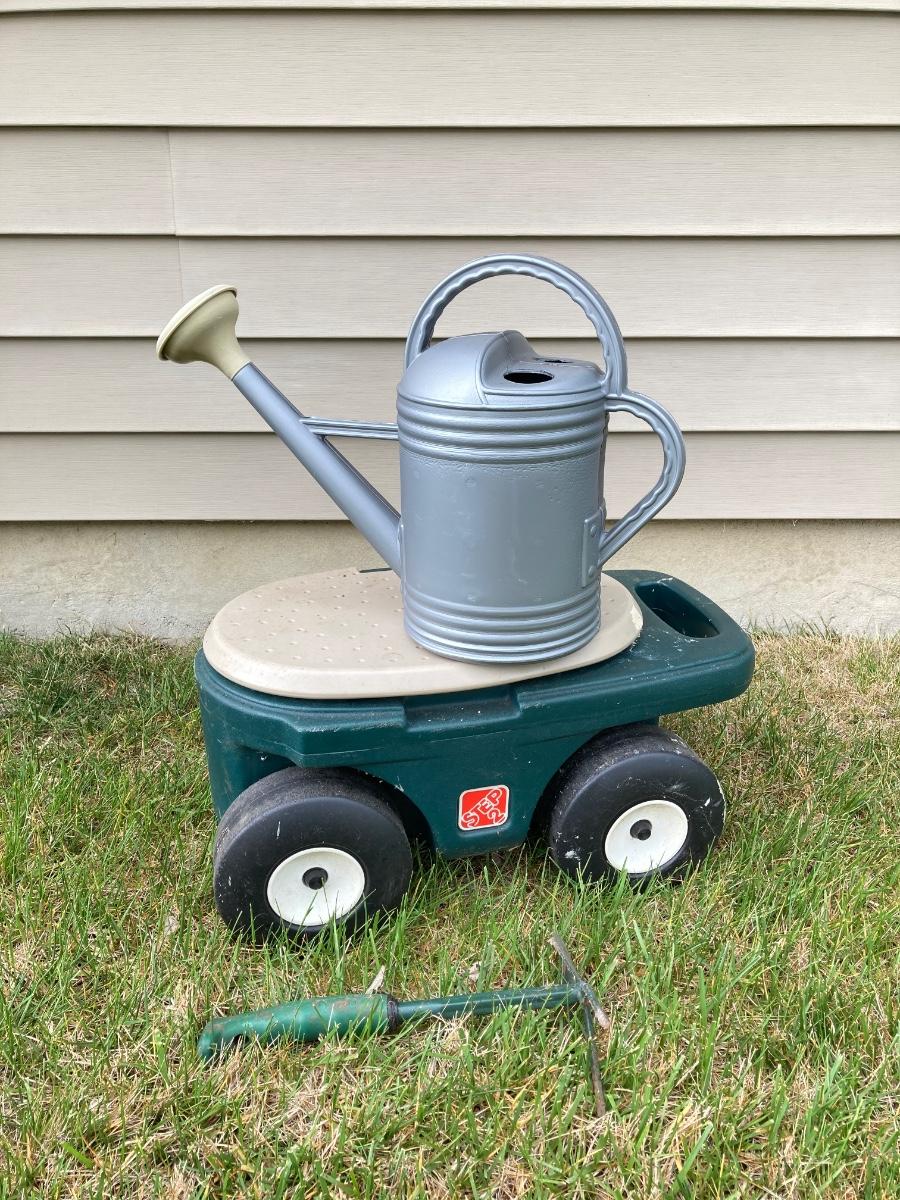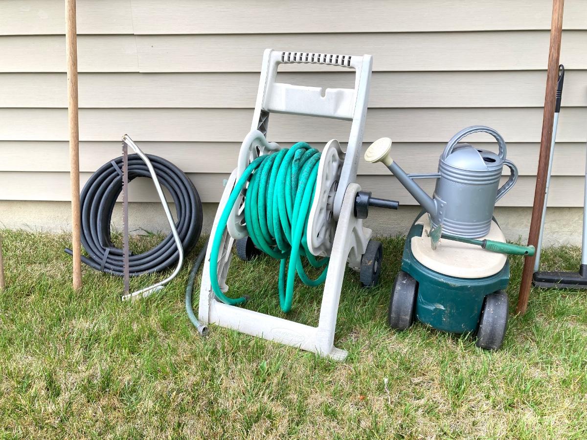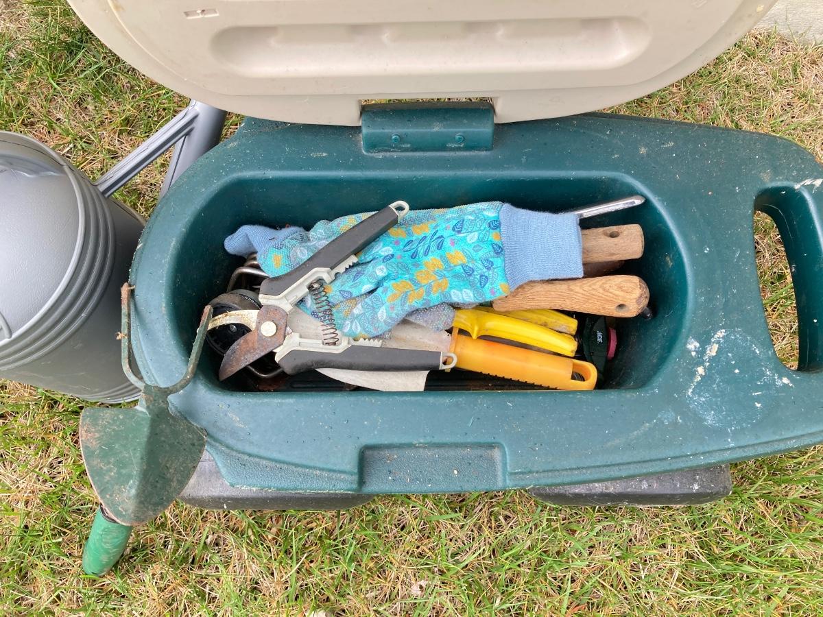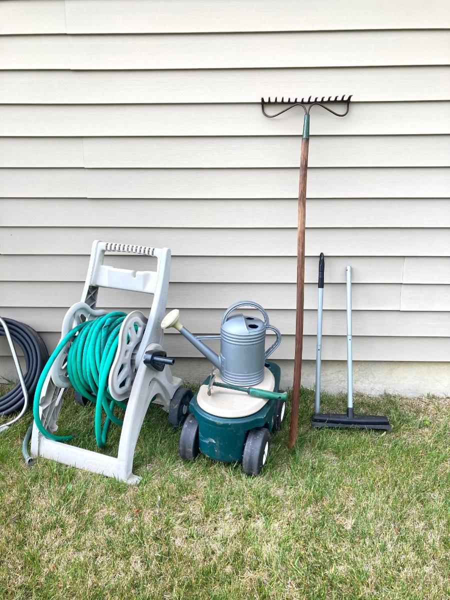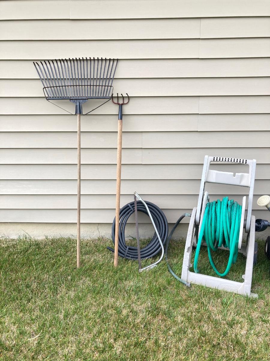 LOT 60: Lawn and Garden - Hose and Hose Mobile Holder, Rakes, Step 2 Rolling Garden Cart / Seat with Contents and More