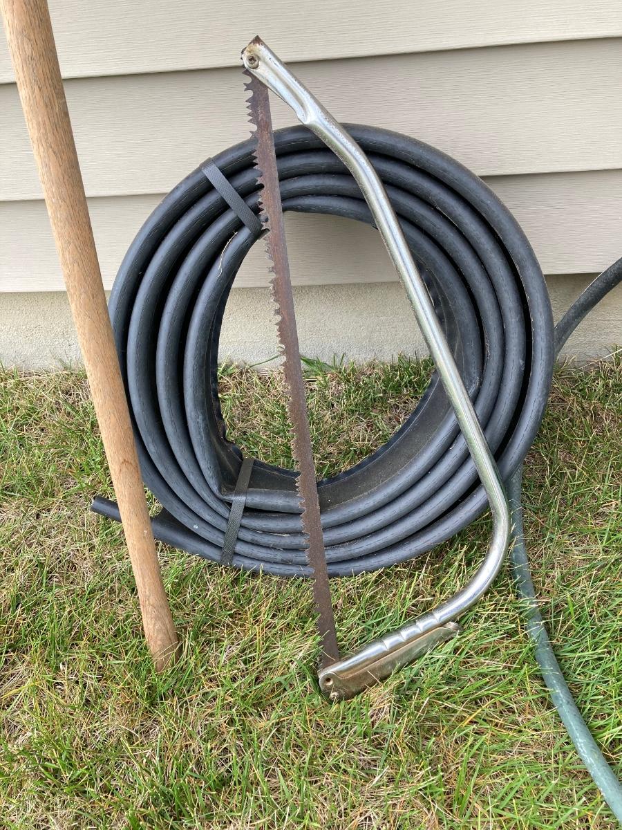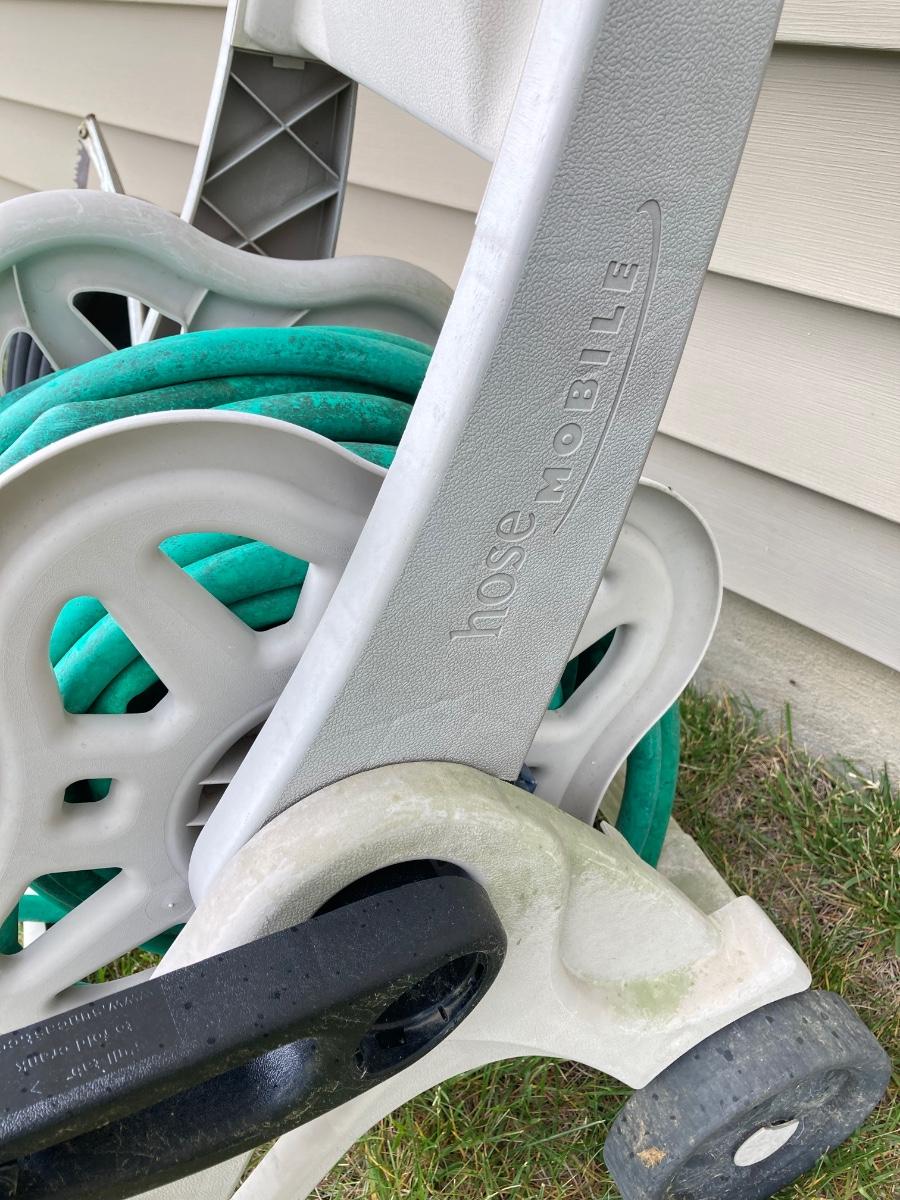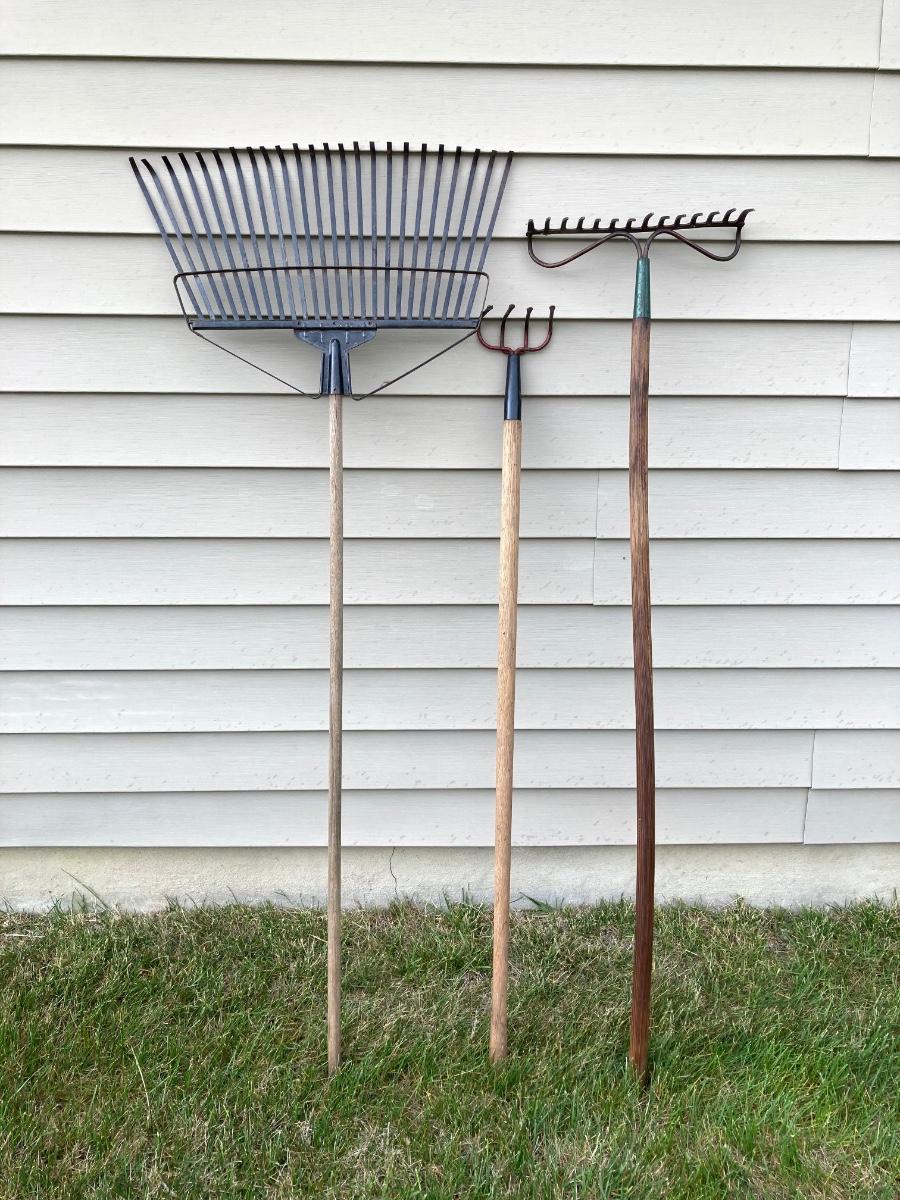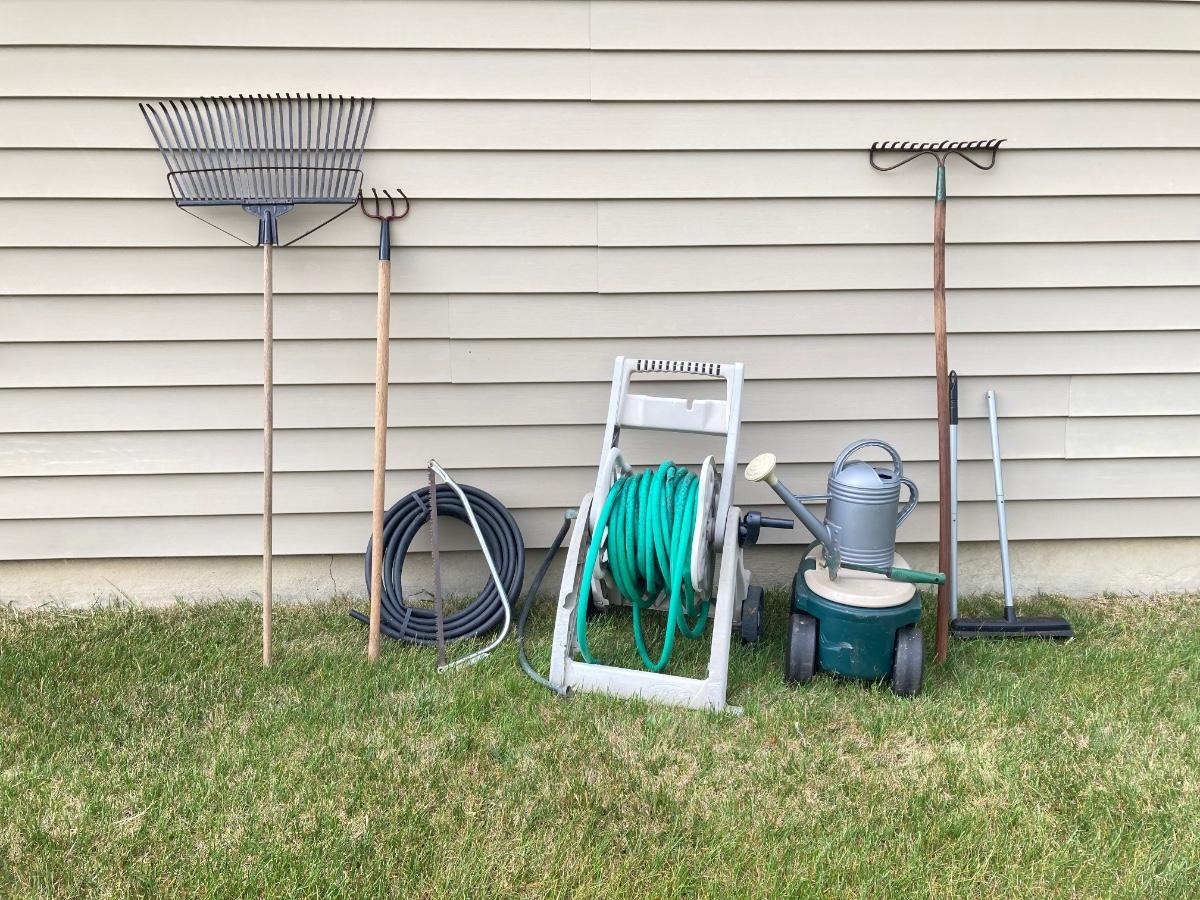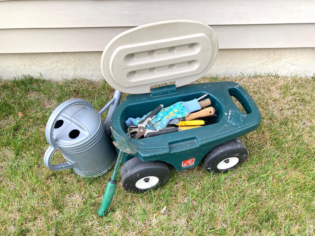 LOT 60: Lawn and Garden - Hose and Hose Mobile Holder, Rakes, Step 2 Rolling Garden Cart / Seat with Contents and More