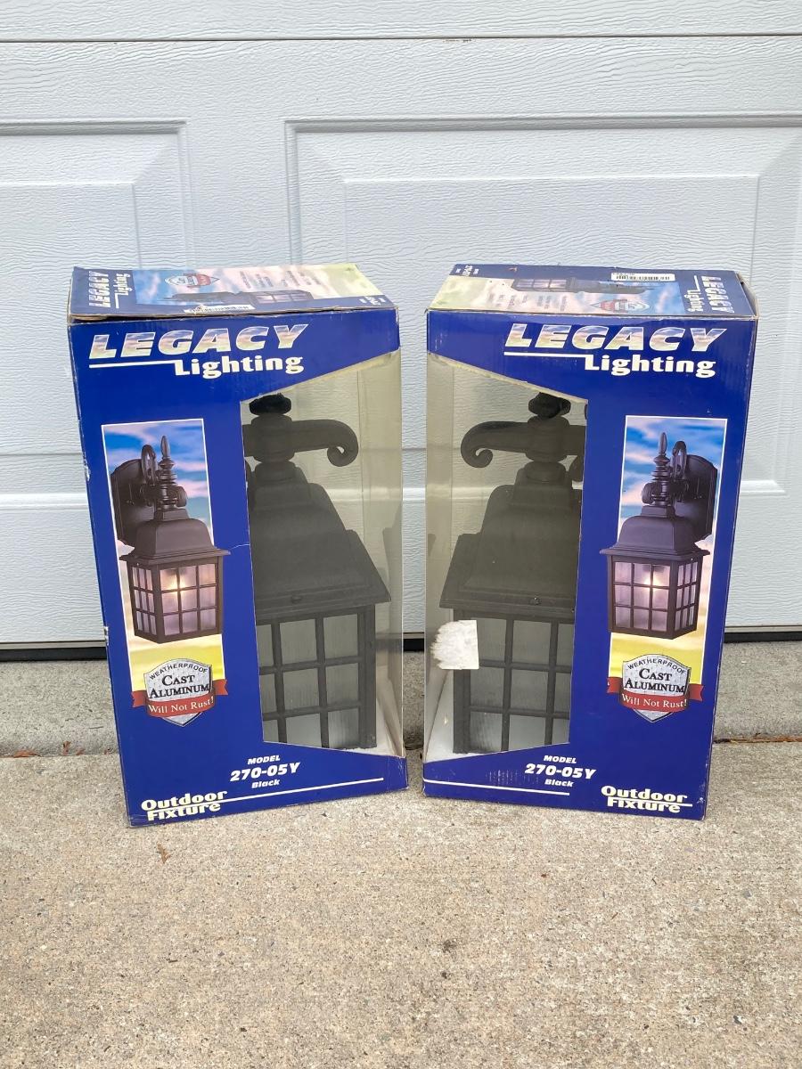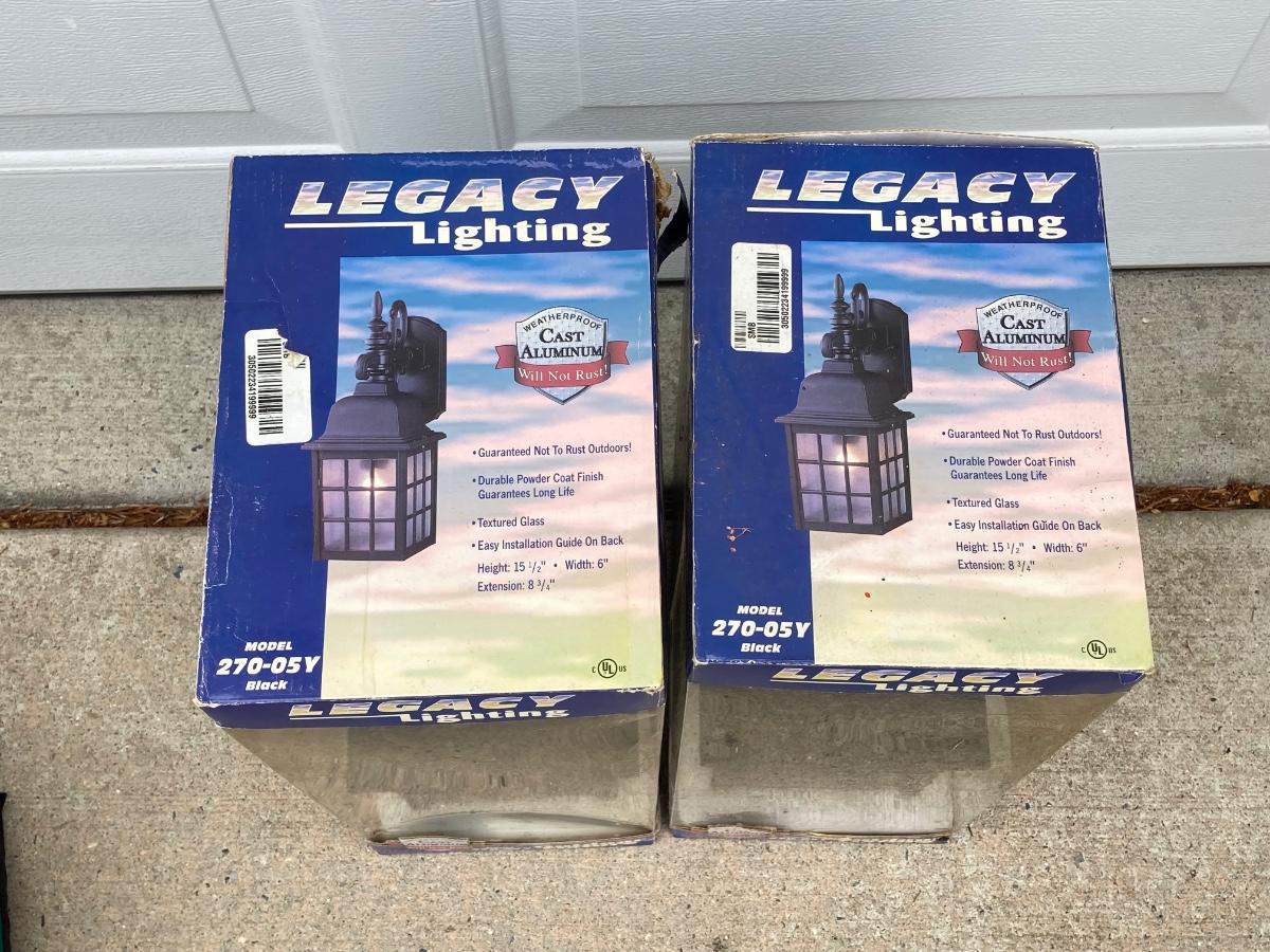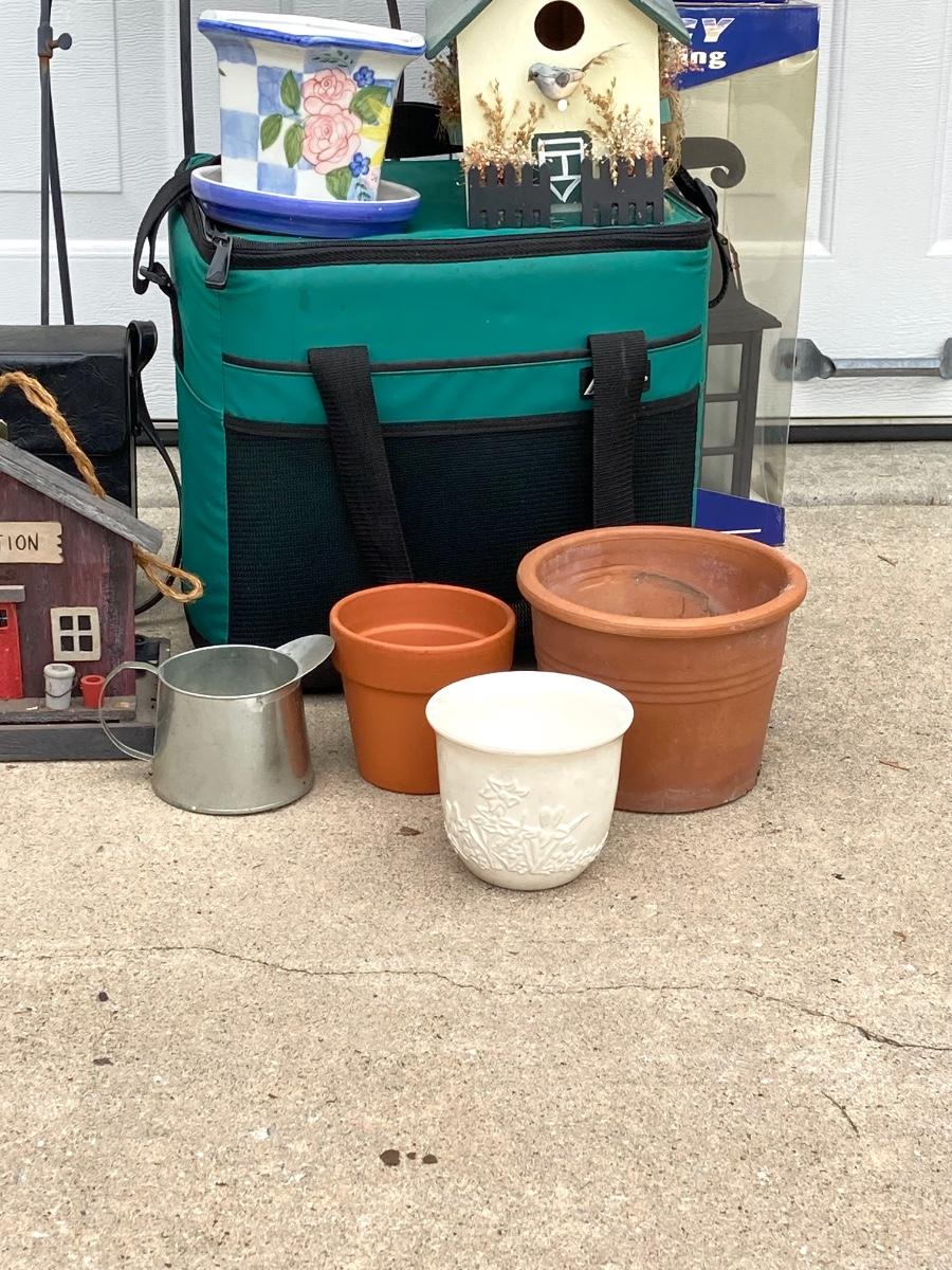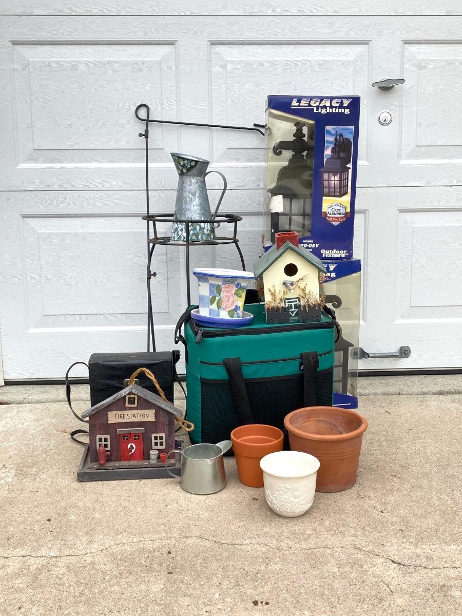 LOT 63: Outdoor Lawn and Garden Collection - Pair of Legacy Lighting Outdoor Fixtures, Planters / Plant Stand, Bird Houses, Cooler, Binoculars and More