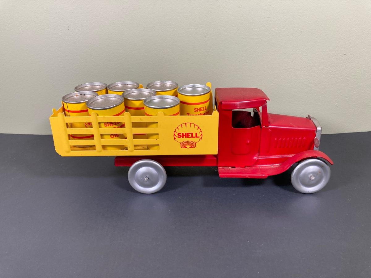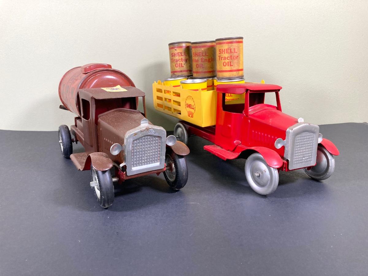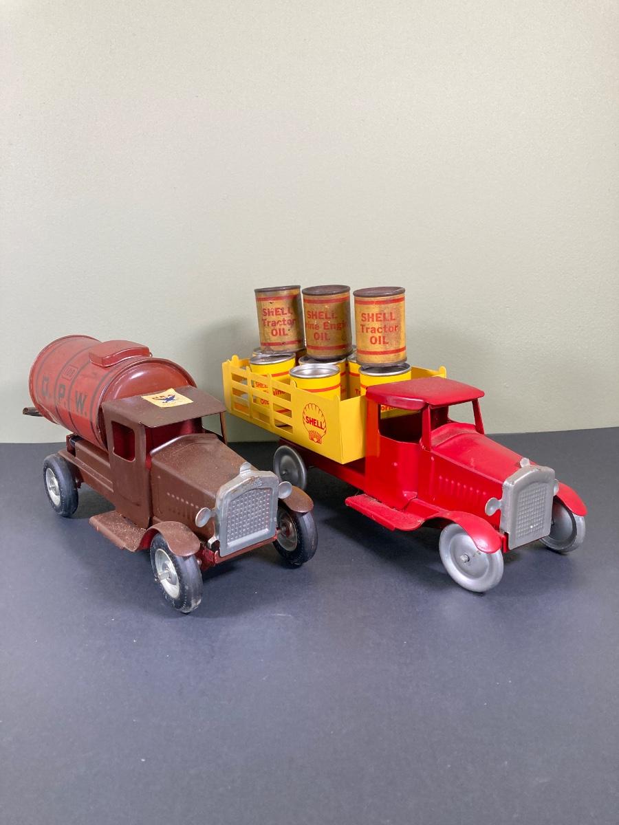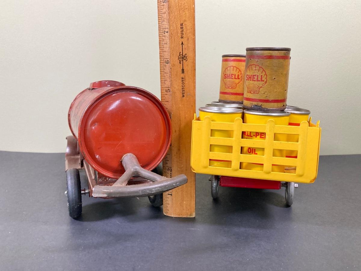 LOT 68: Shell Oil Metal Truck with Miniature Oil Drums and D.P.W. Oil Delivery Truck (Metalcraft Gearbox)