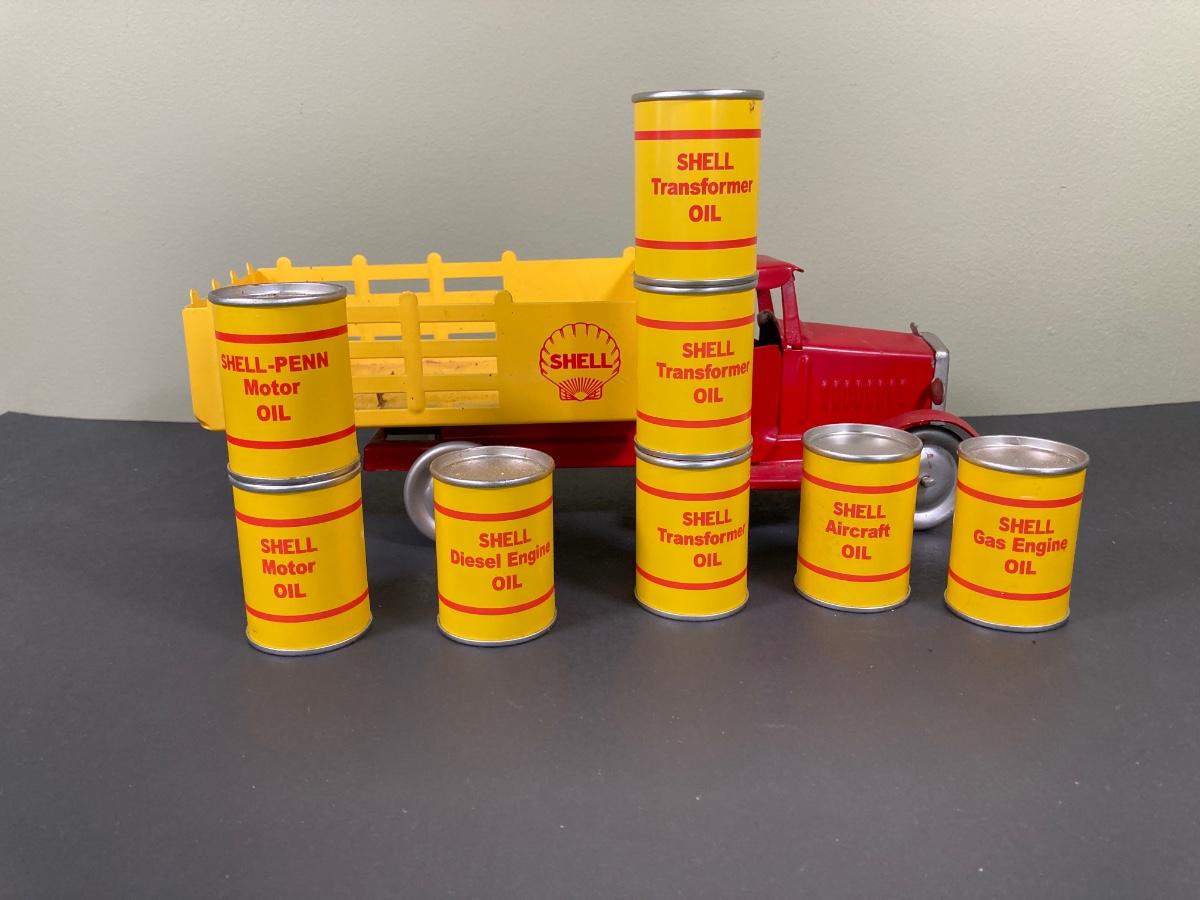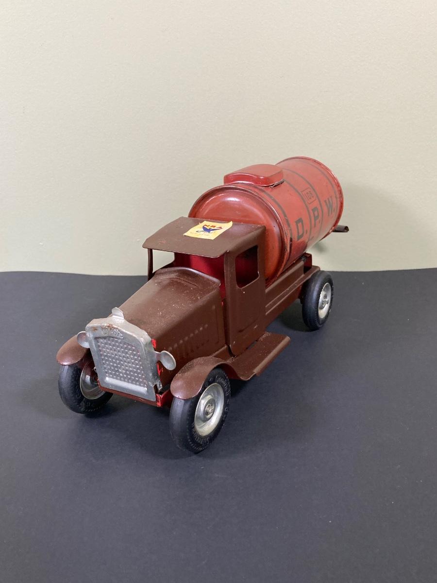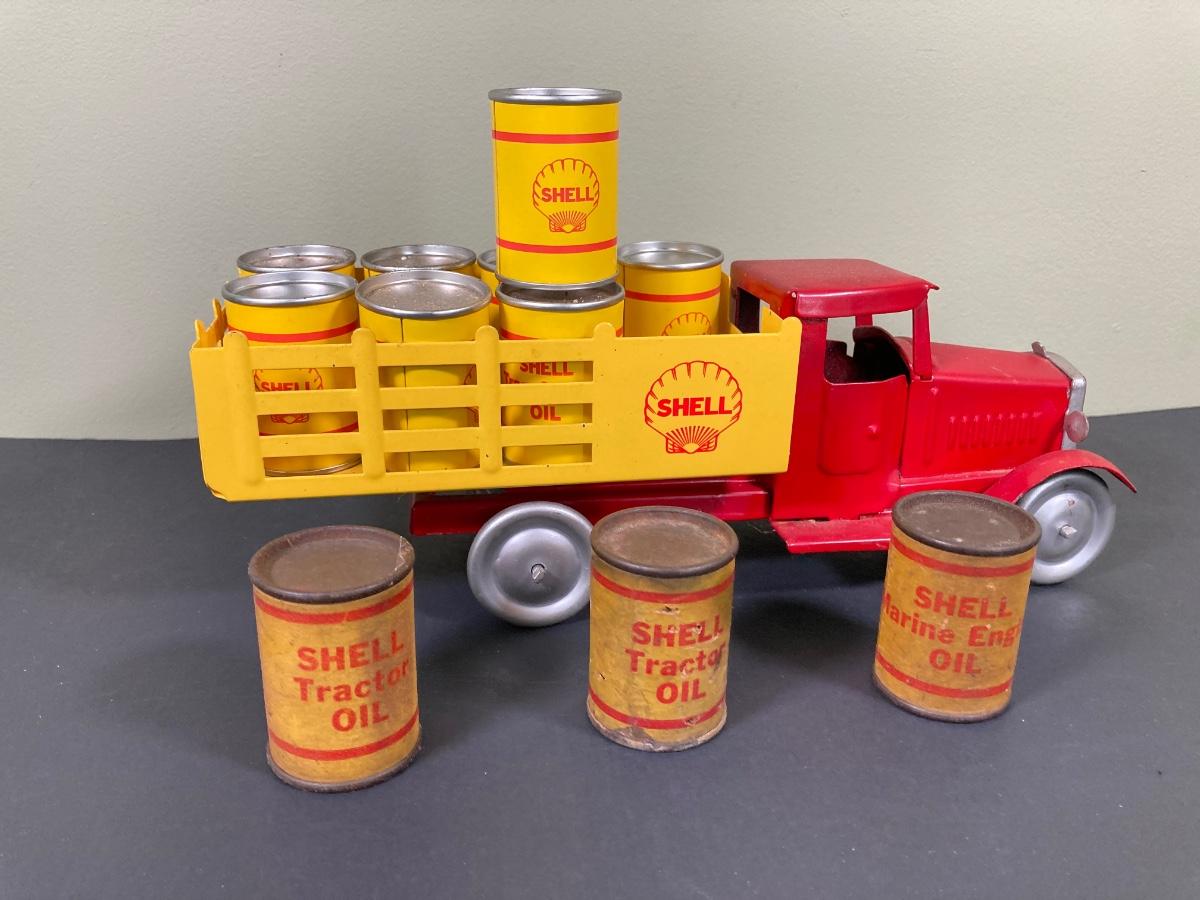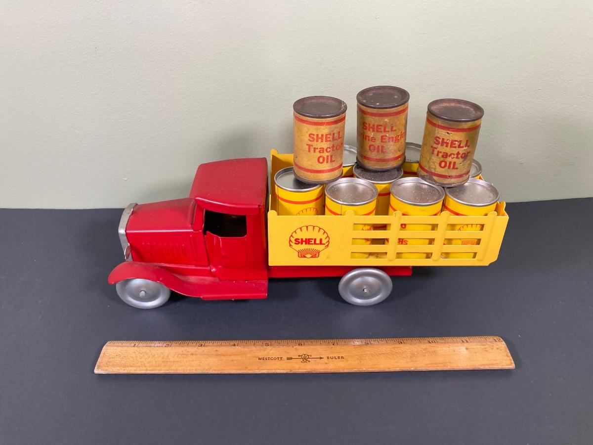 LOT 68: Shell Oil Metal Truck with Miniature Oil Drums and D.P.W. Oil Delivery Truck (Metalcraft Gearbox)
