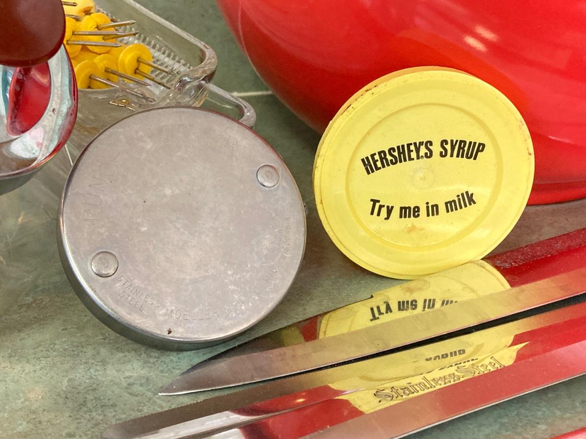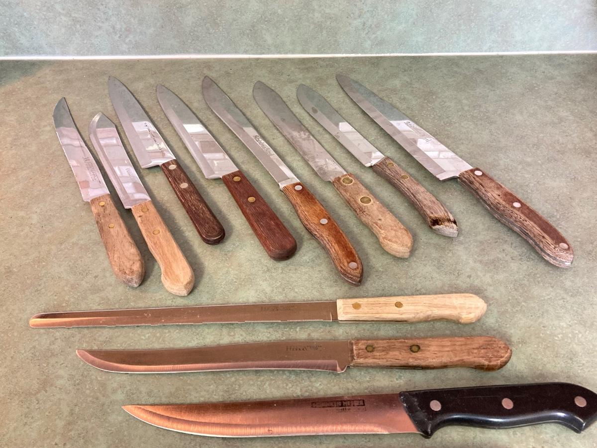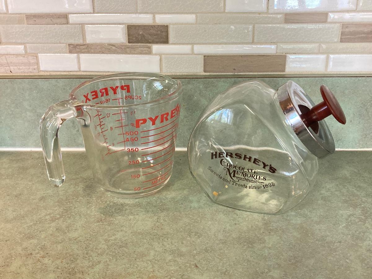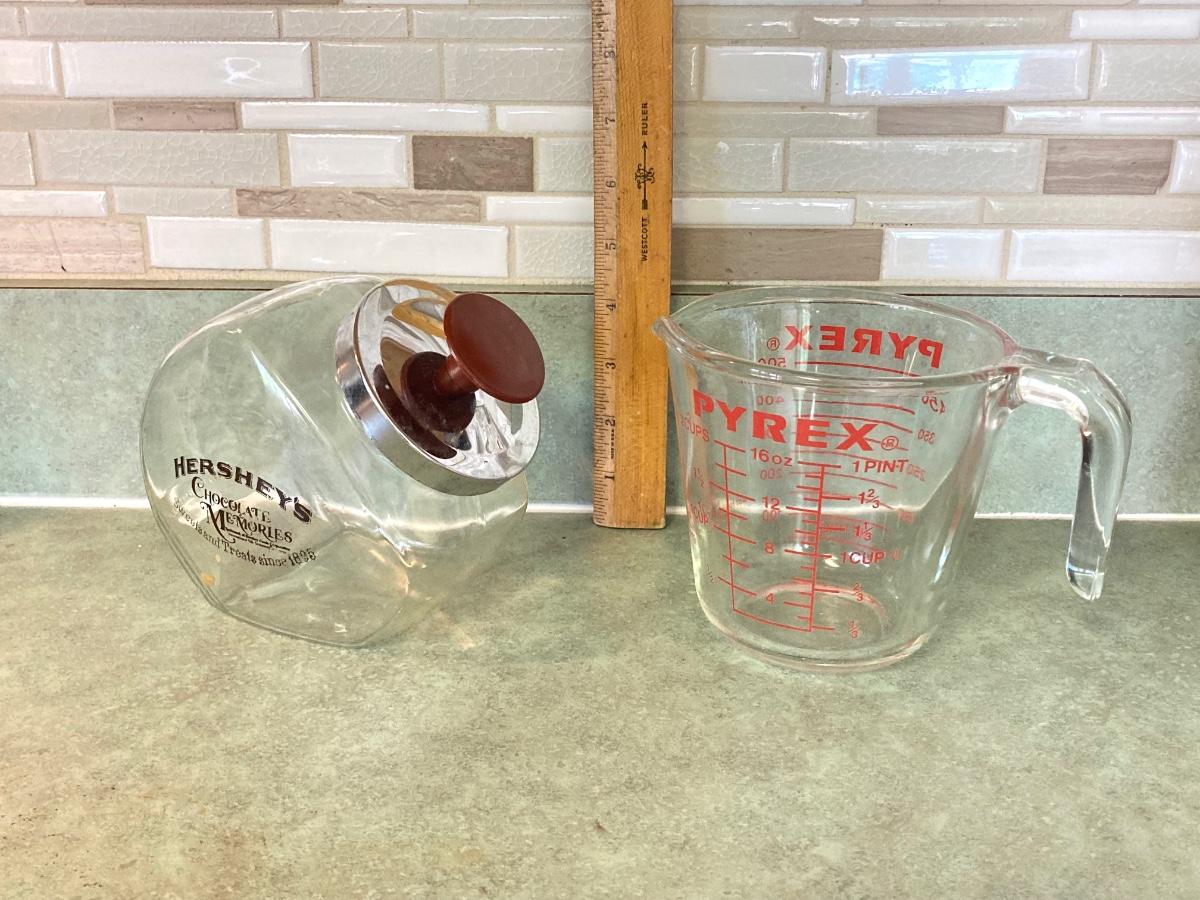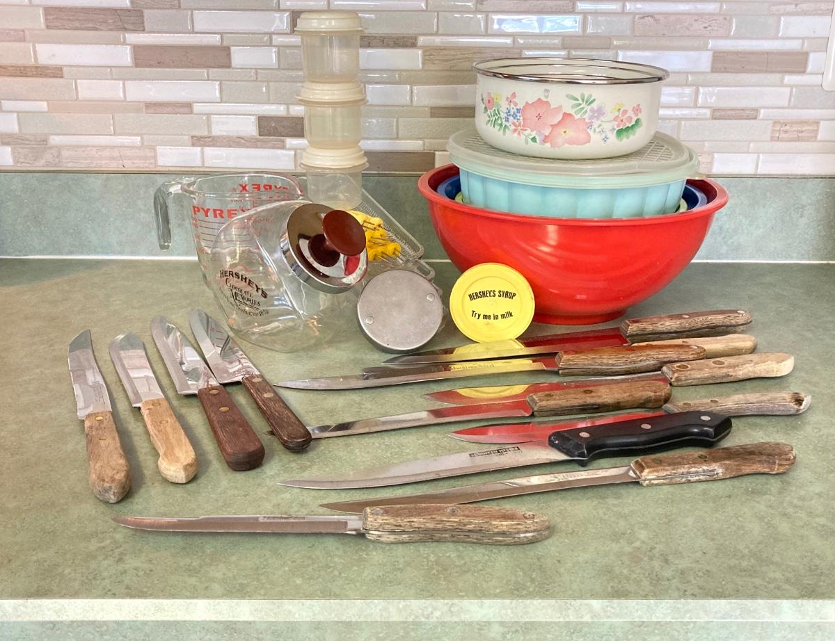 LOT 75: Kitchen Essentials - OGGI Corporation Nesting Bowls, Corn Holders, Pyrex Measuring Cup, Hershey's Candy Jar, Punch N Cover, Assorted Stainless Steel Knives, Tupperrware and More