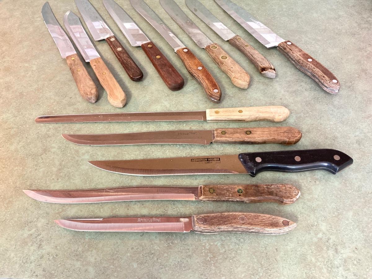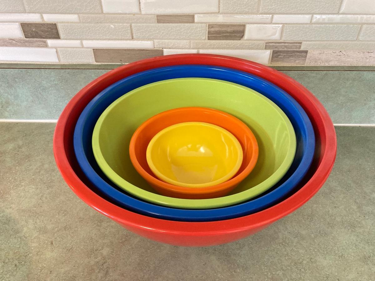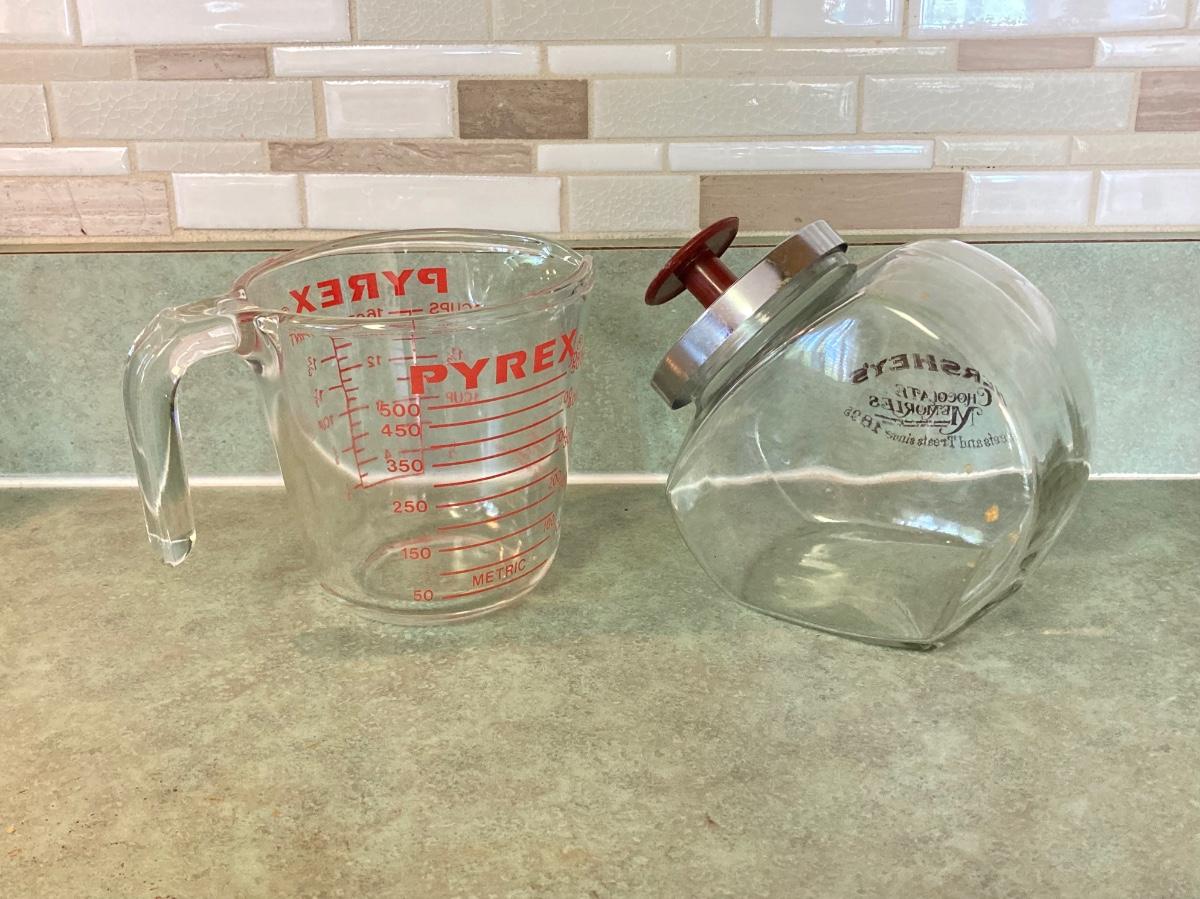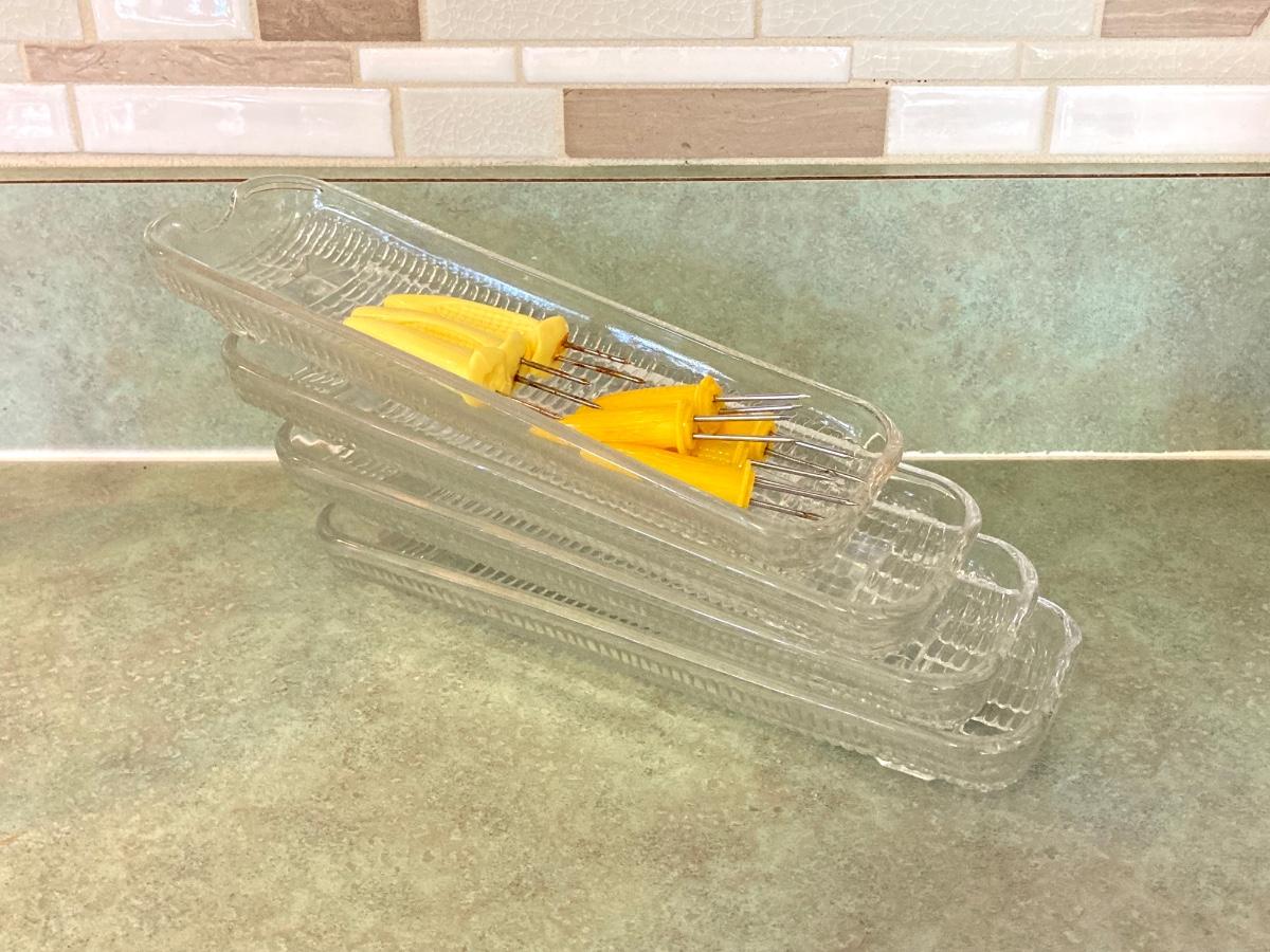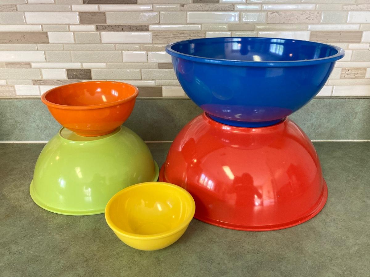 LOT 75: Kitchen Essentials - OGGI Corporation Nesting Bowls, Corn Holders, Pyrex Measuring Cup, Hershey's Candy Jar, Punch N Cover, Assorted Stainless Steel Knives, Tupperrware and More