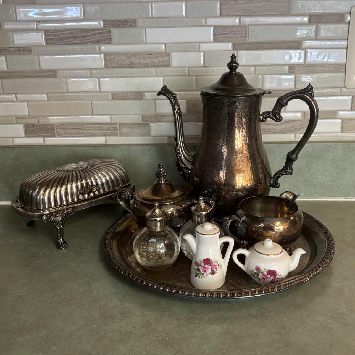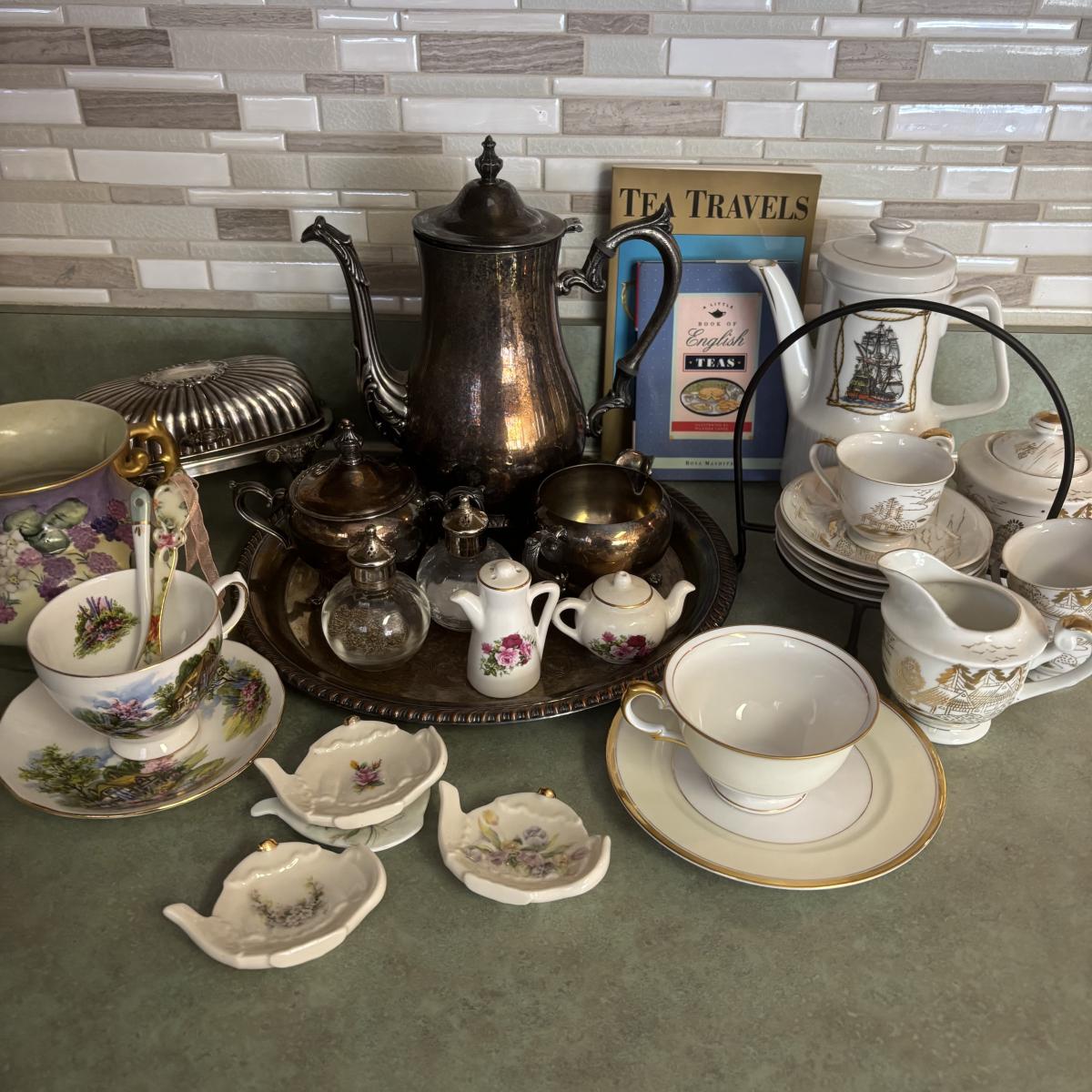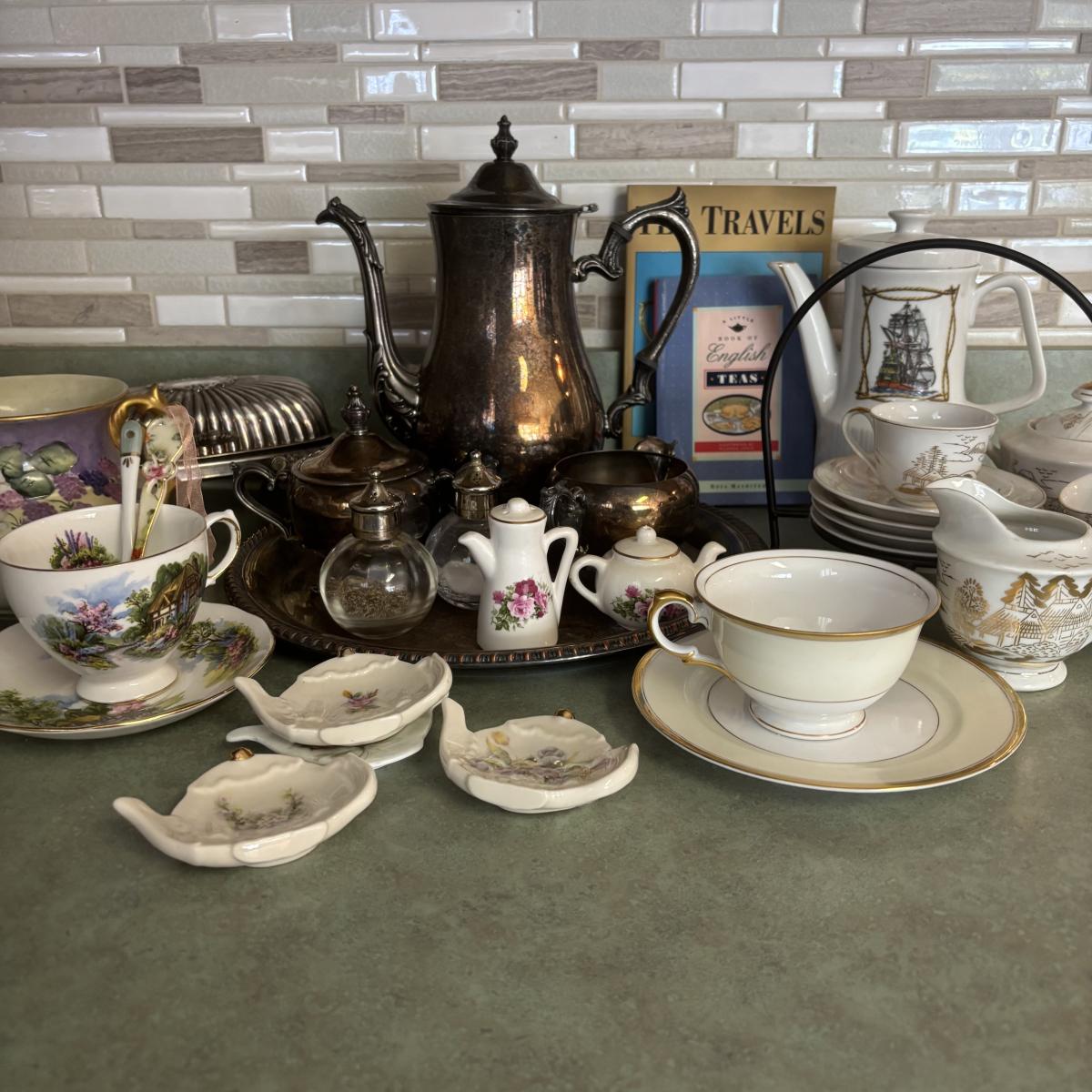 LOT 89: Time for Tea: Silverplate Teapot, Sugar & Creamer, Royal Vale, Meito China, Vintage Electric Teapot, Hand Painted Vase & More