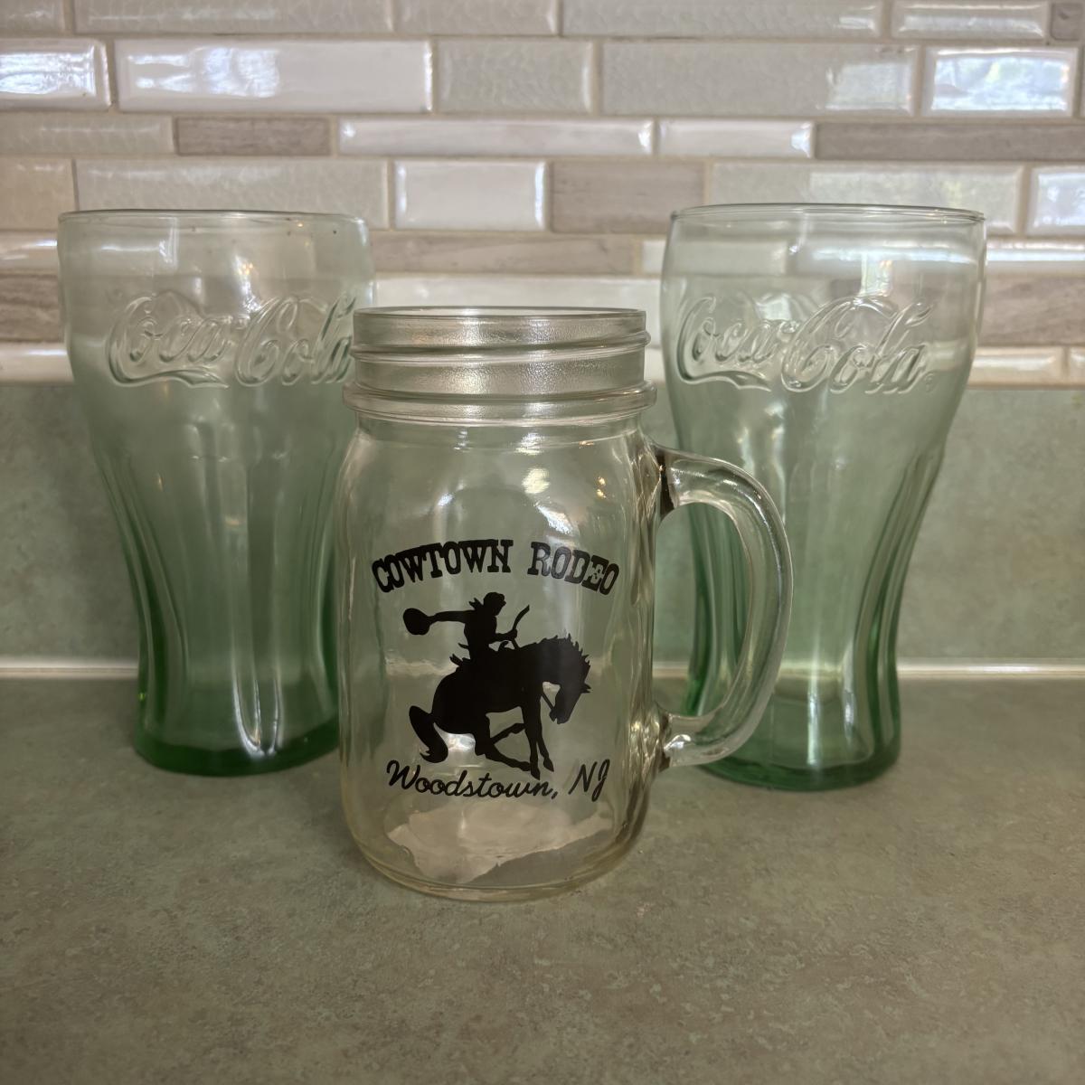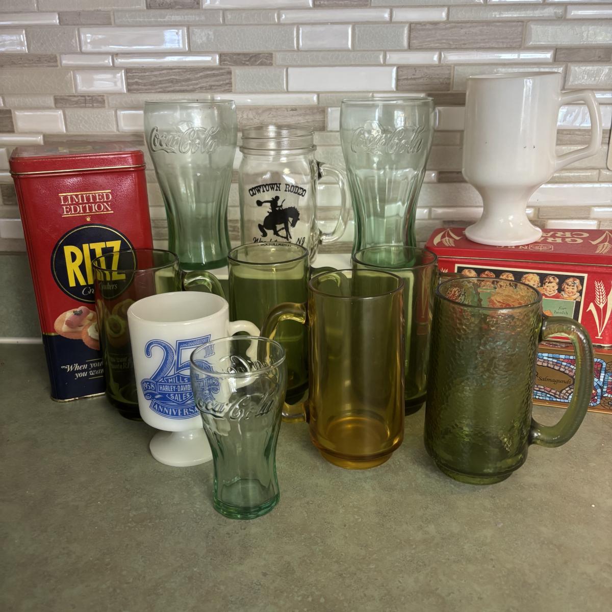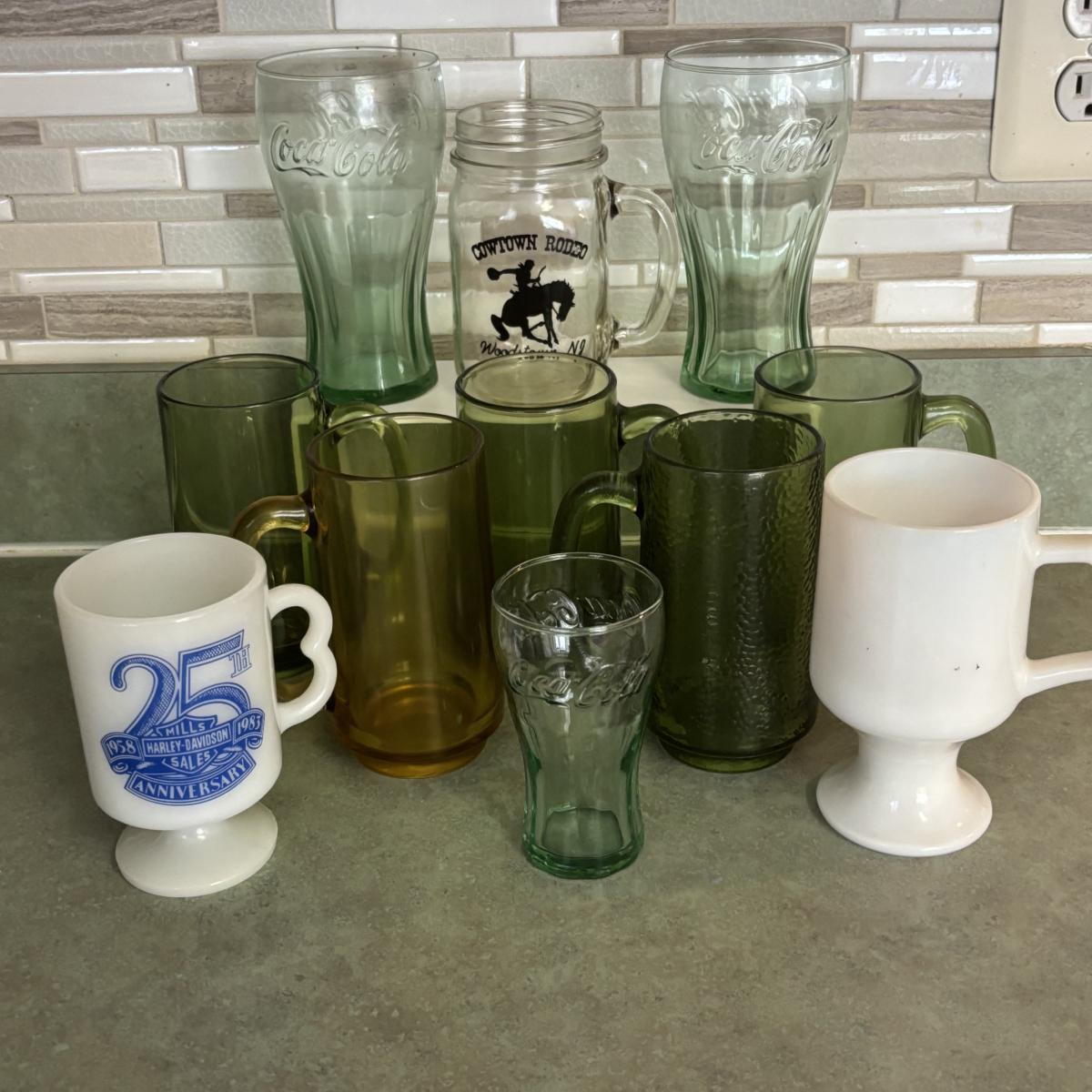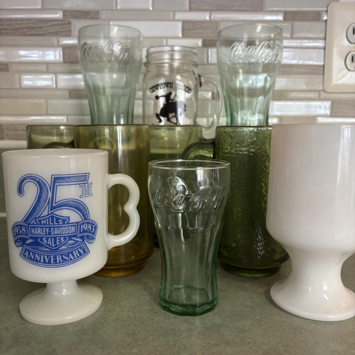 LOT 90: Glass Collection with Avocado Green Glass Mugs, Amber Glass Mug, Milk Glass, 25th Harley Davidson Mug, Coca-Cola Glasses, Cowtown Rodeo Mason Jar Glass & More
