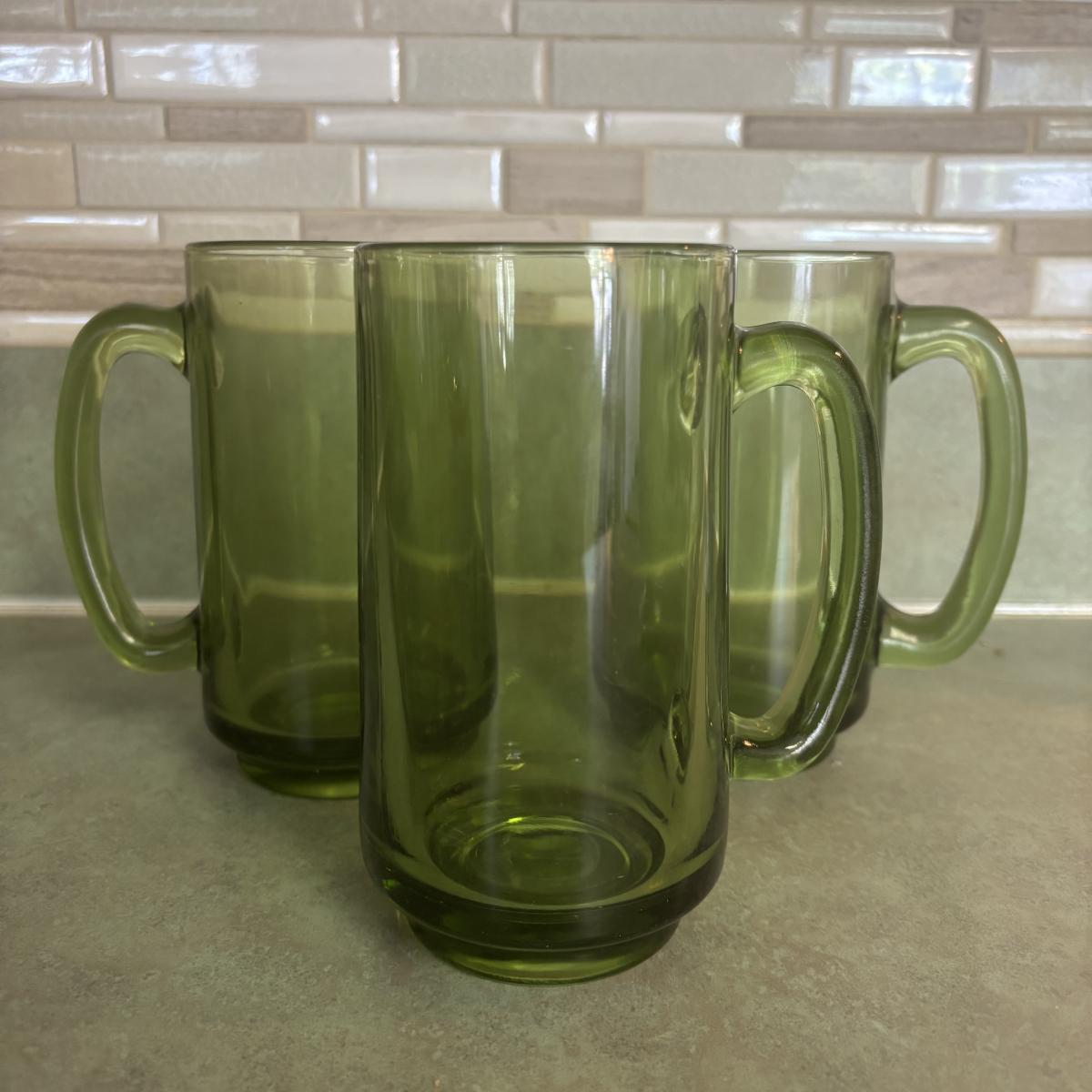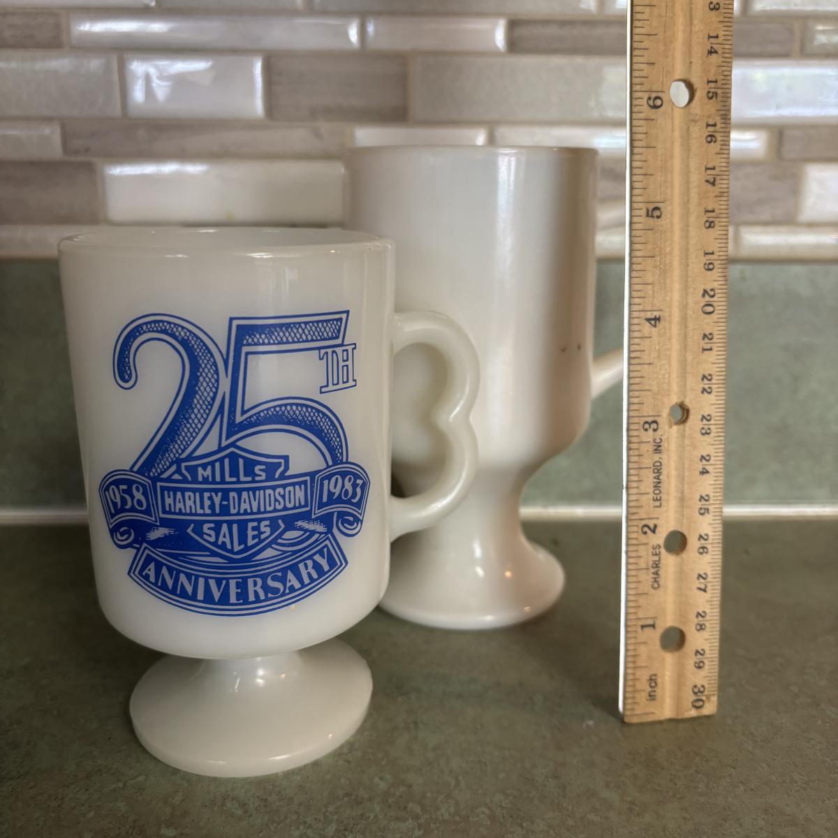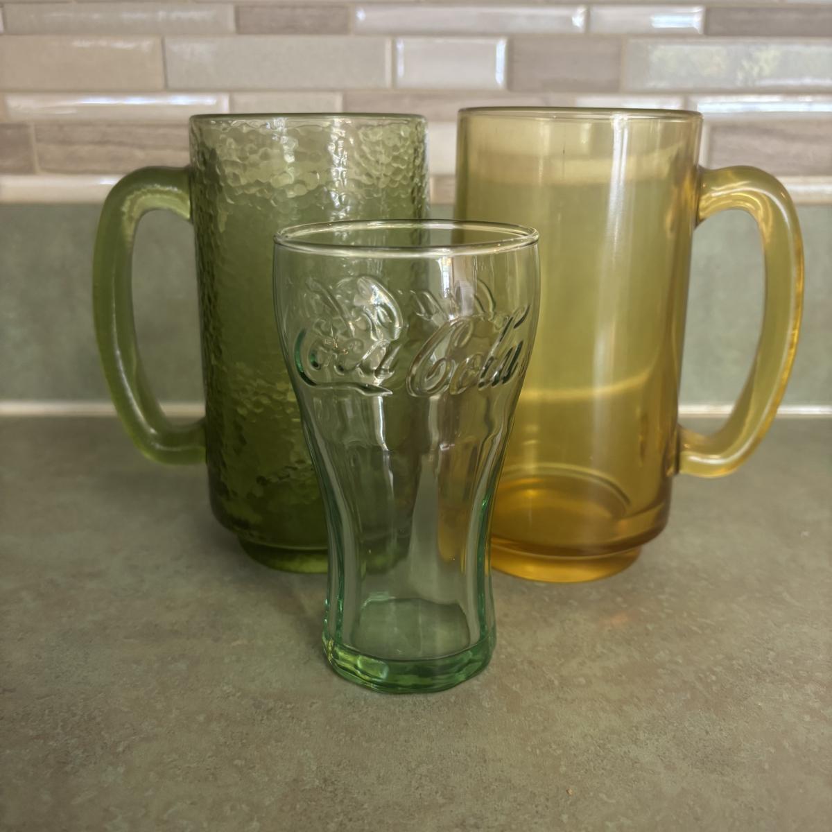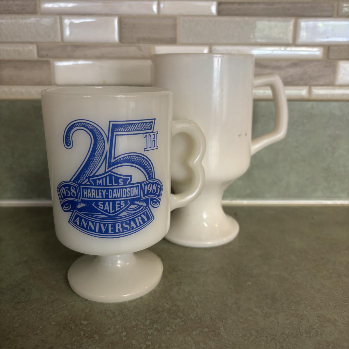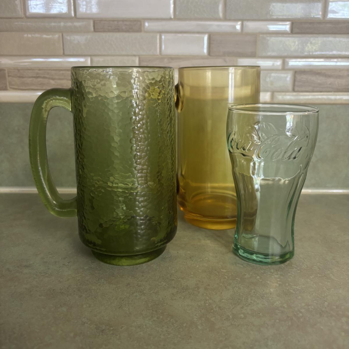 LOT 90: Glass Collection with Avocado Green Glass Mugs, Amber Glass Mug, Milk Glass, 25th Harley Davidson Mug, Coca-Cola Glasses, Cowtown Rodeo Mason Jar Glass & More
