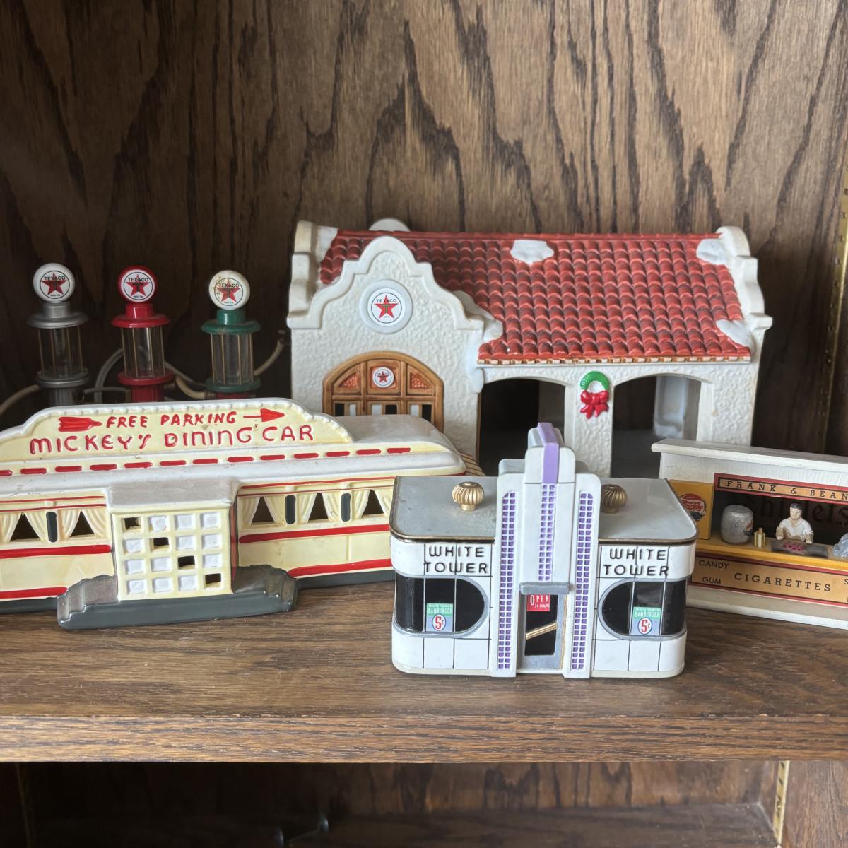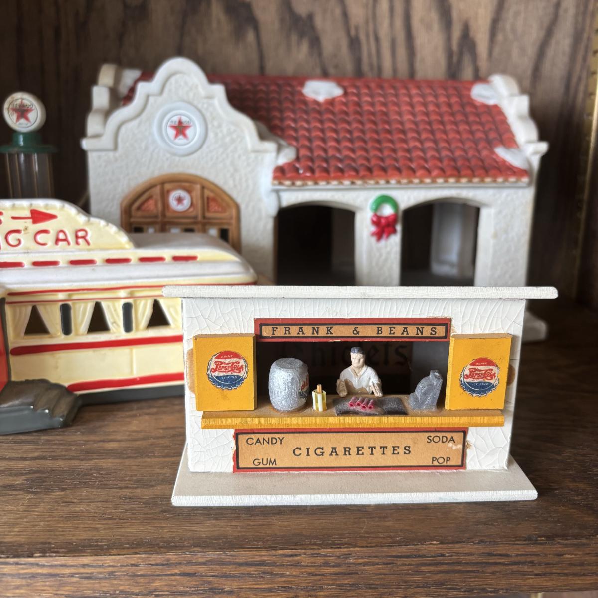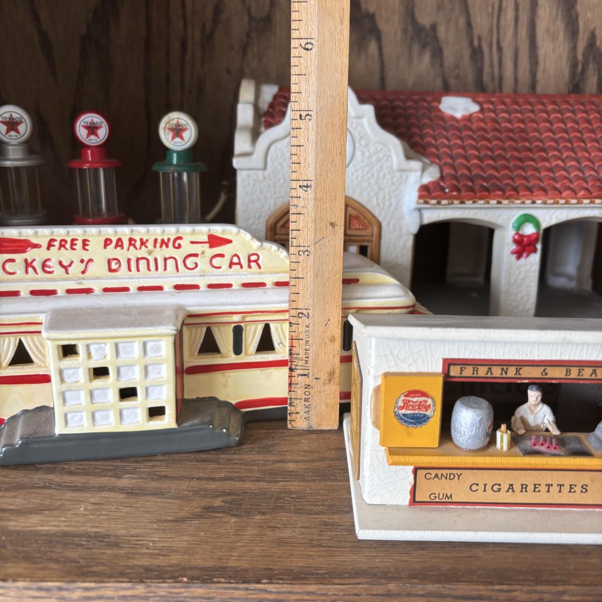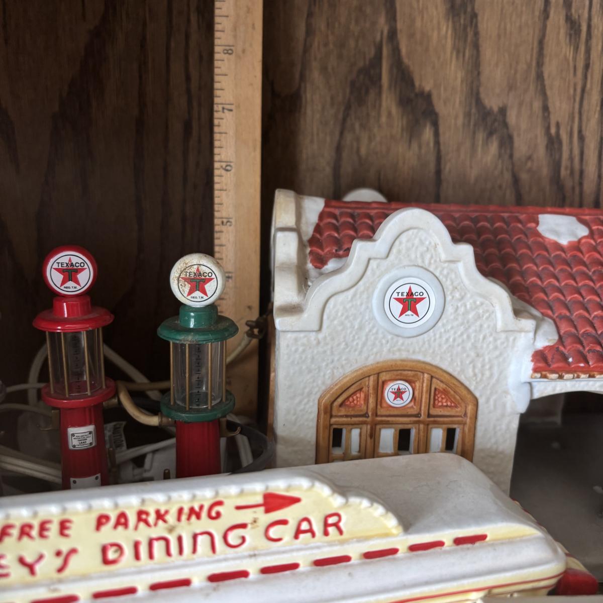 LOT 93: Roadside Diners & More: Lefton"s Great American Diner Series, A.C. Gilbert American Flyer "Frank & Beans", Dept 56. Diner 1956 & Texaco Gas Station & Gas Pumps
