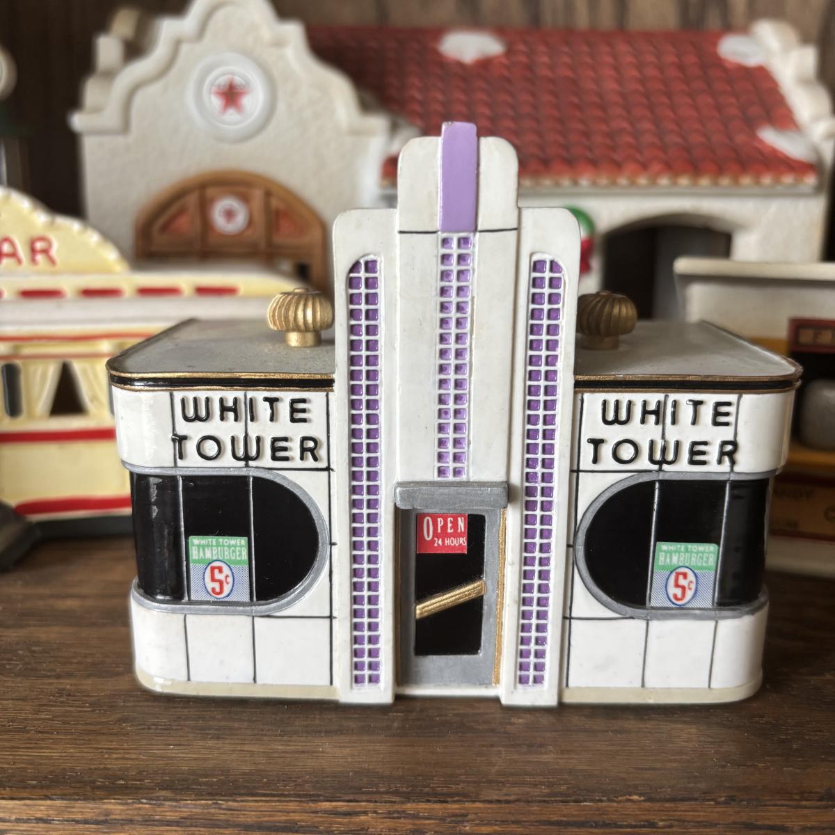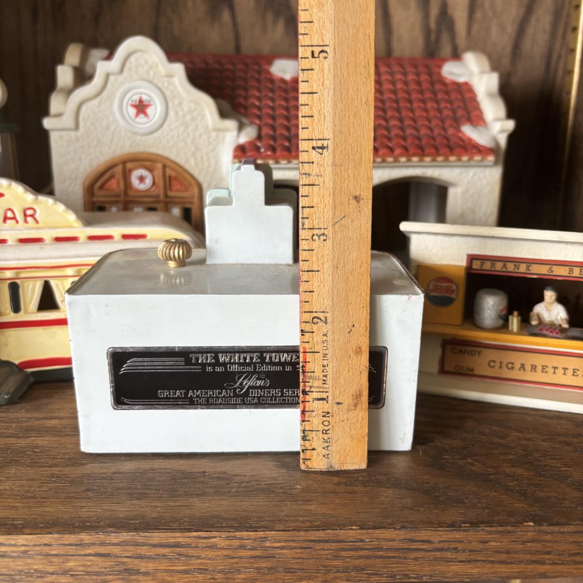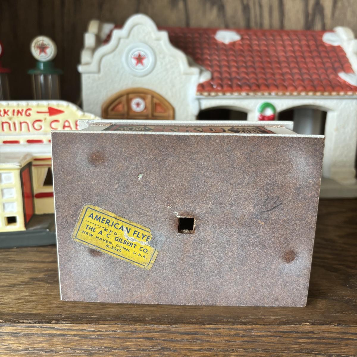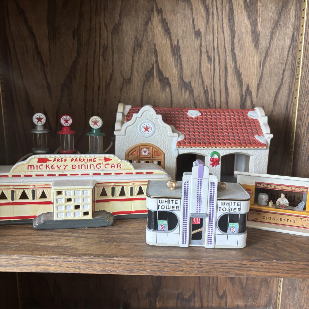 LOT 93: Roadside Diners & More: Lefton"s Great American Diner Series, A.C. Gilbert American Flyer "Frank & Beans", Dept 56. Diner 1956 & Texaco Gas Station & Gas Pumps