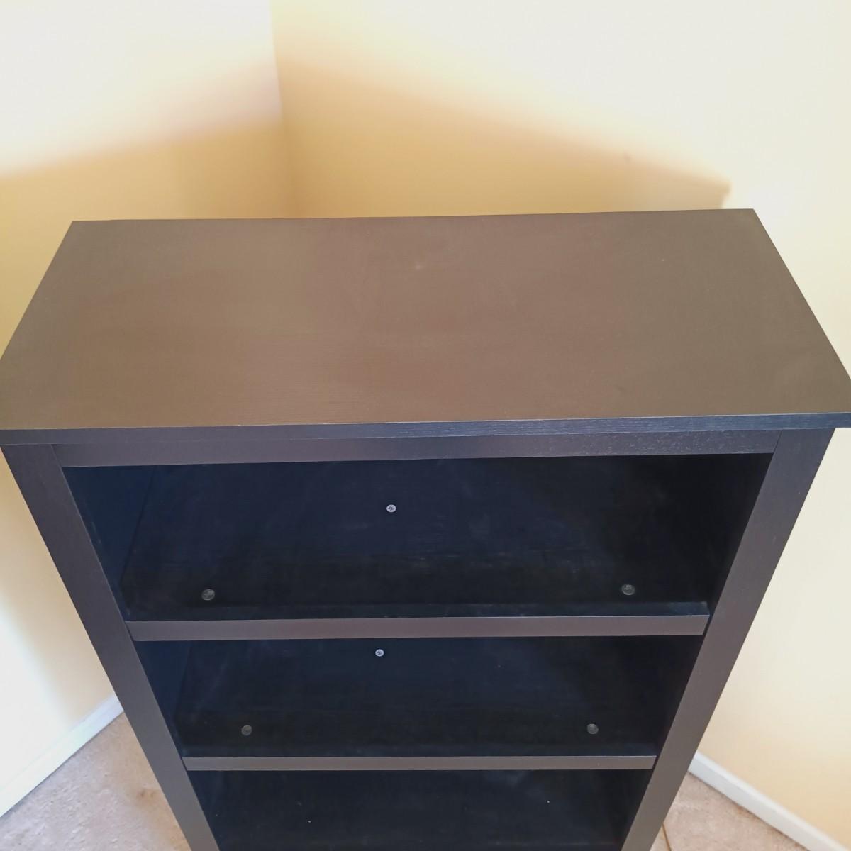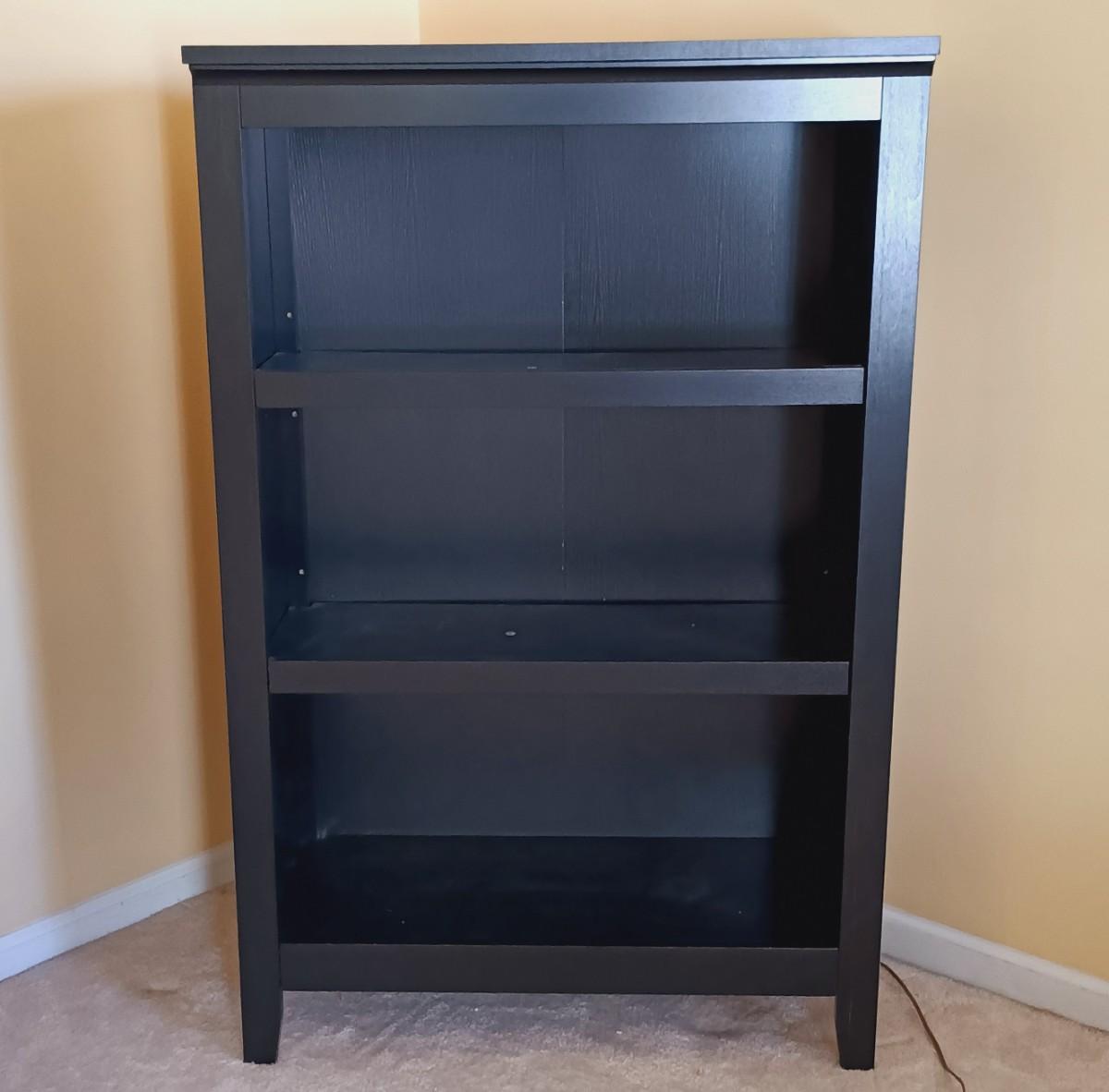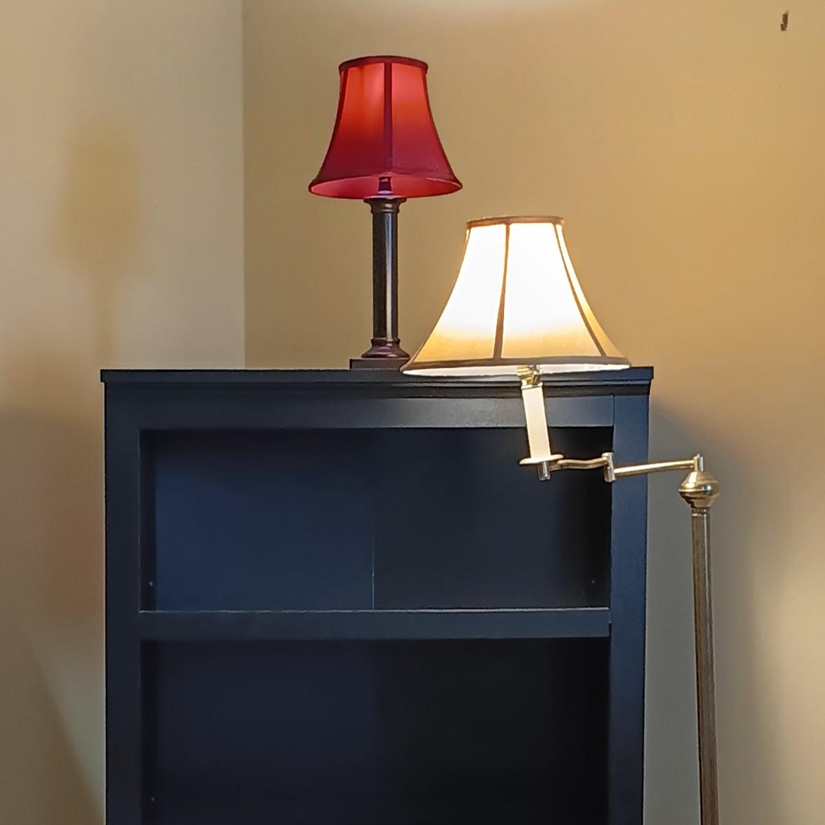 LOT 125: Bookshelf with Metal Swing-Arm Floor Lamp & Table Lamp