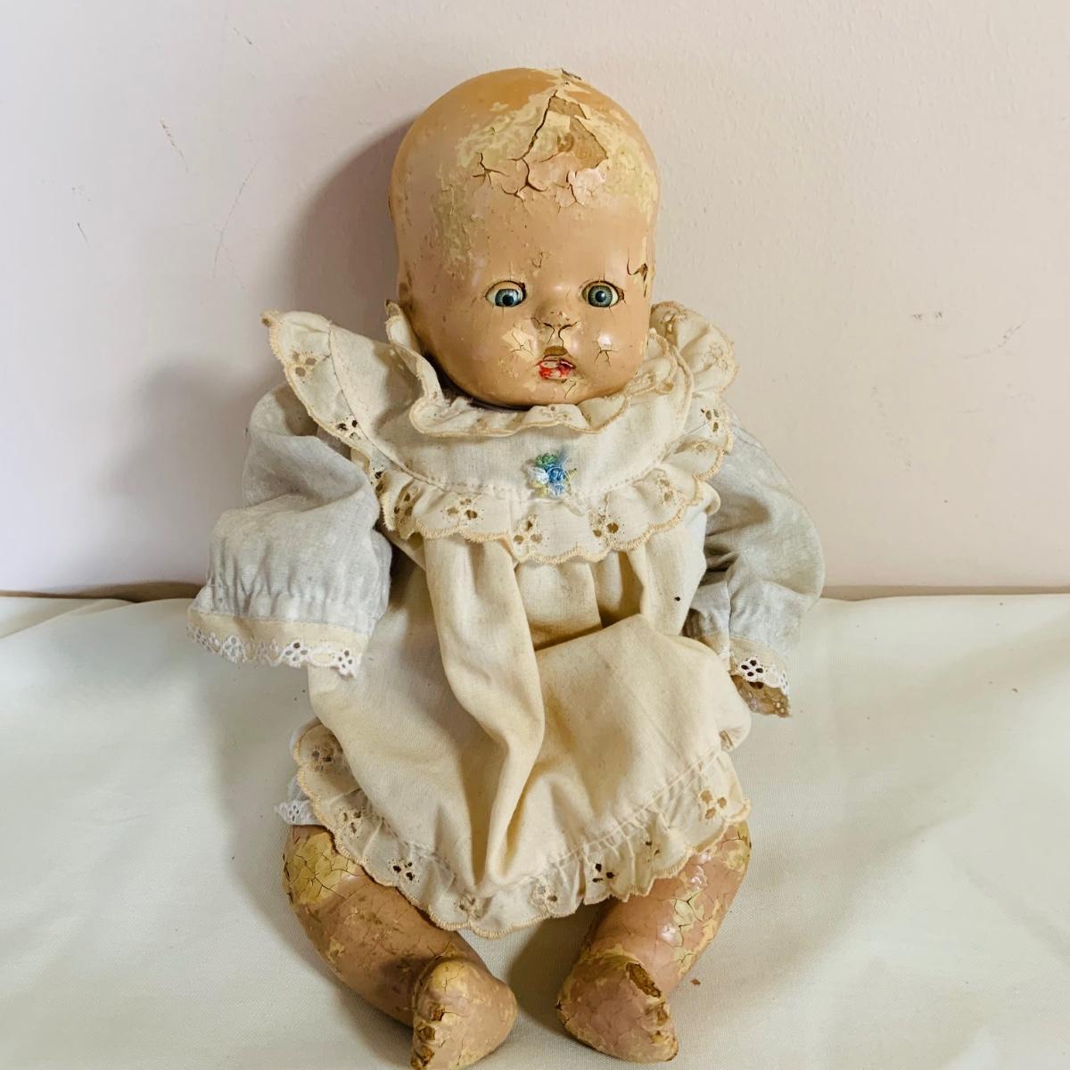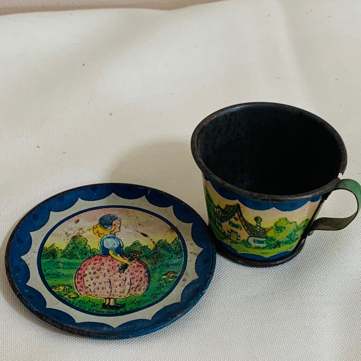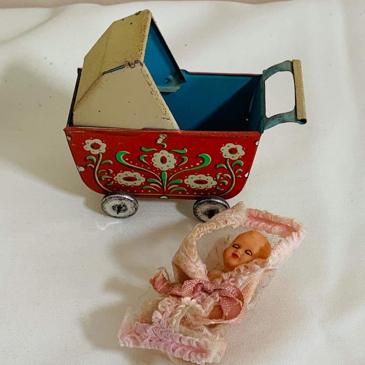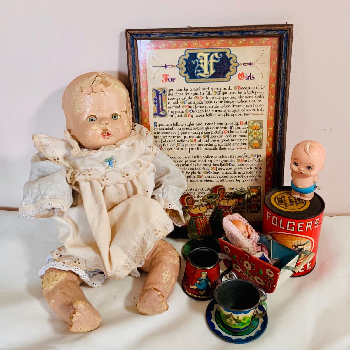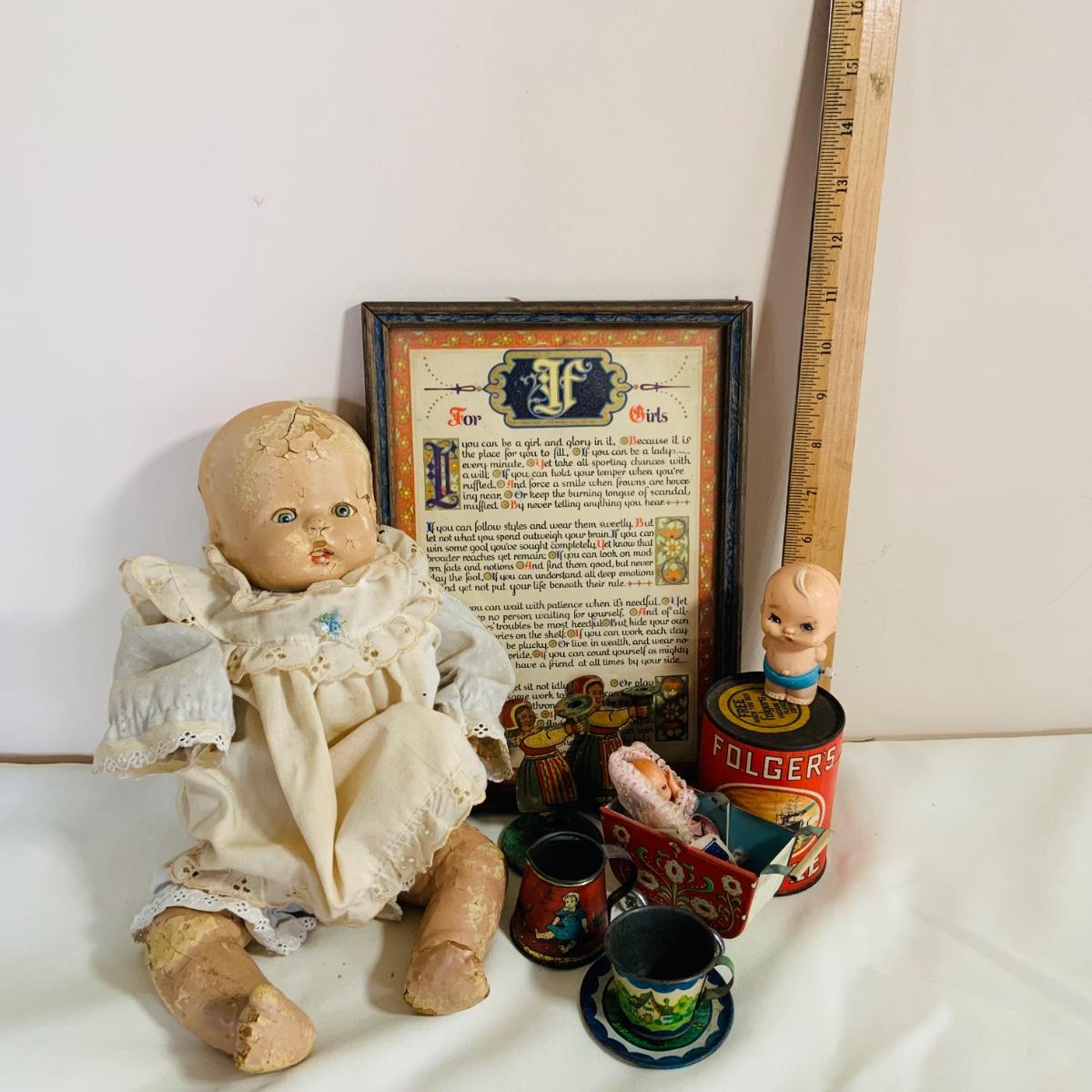 LOT 160: Vintage Little Miss Collection Including Baby Dolls, Unopened Folger Coffee Puzzle Metal Tea Cup and Saucer and Metal Carriage and More