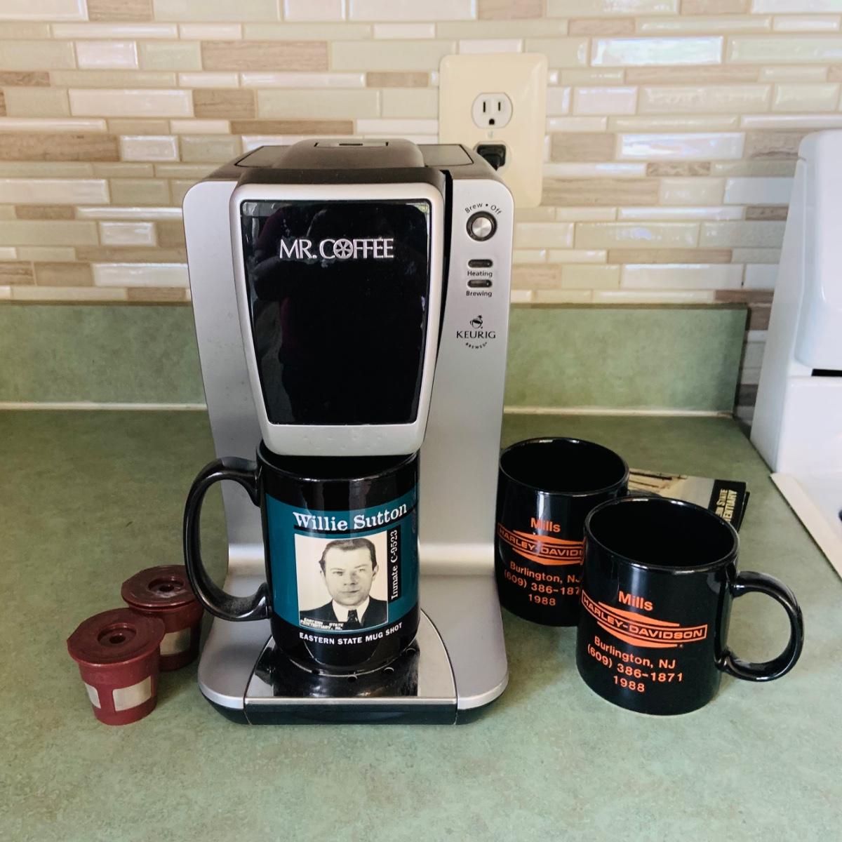 LOT 161: Mr Coffee/Keurig One Cup Coffee Maker Harley Davidson and Eastern State Pen Mugs