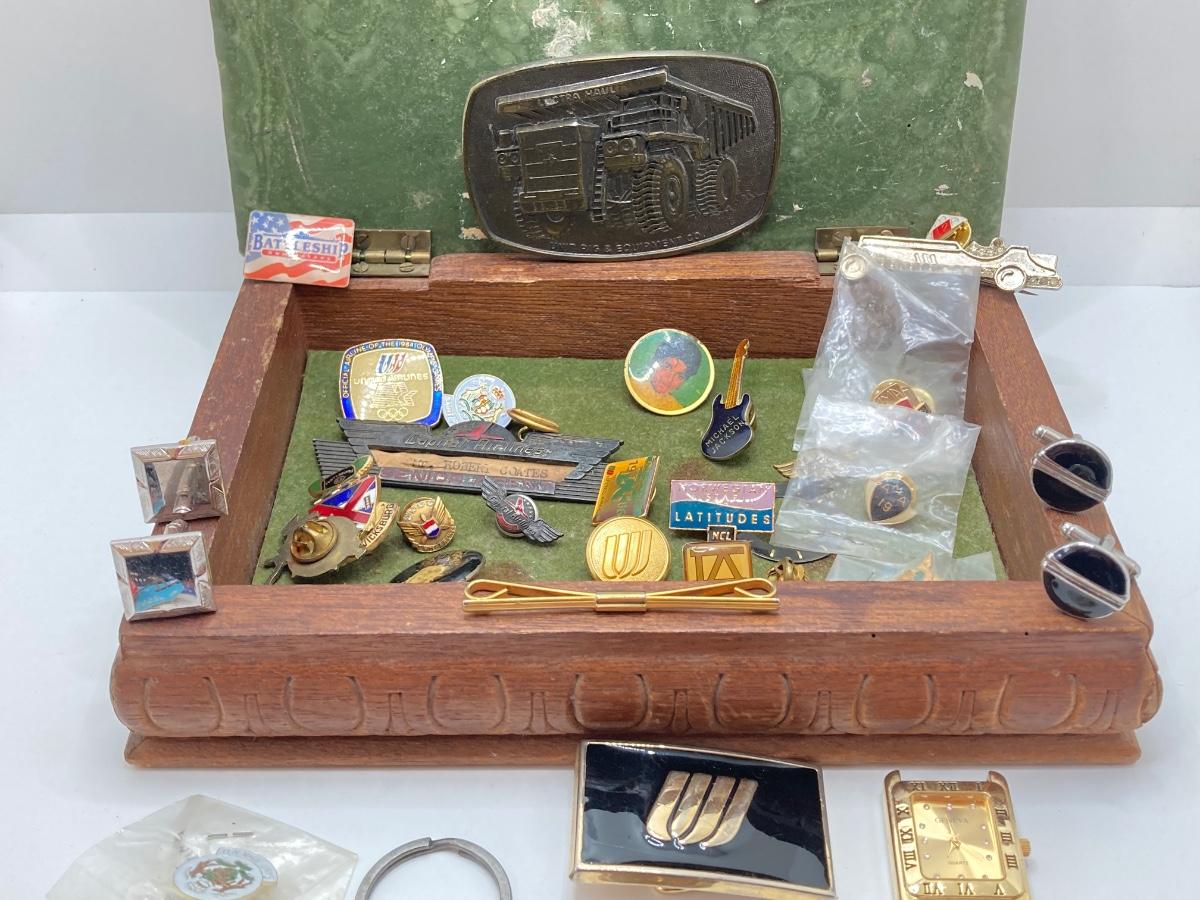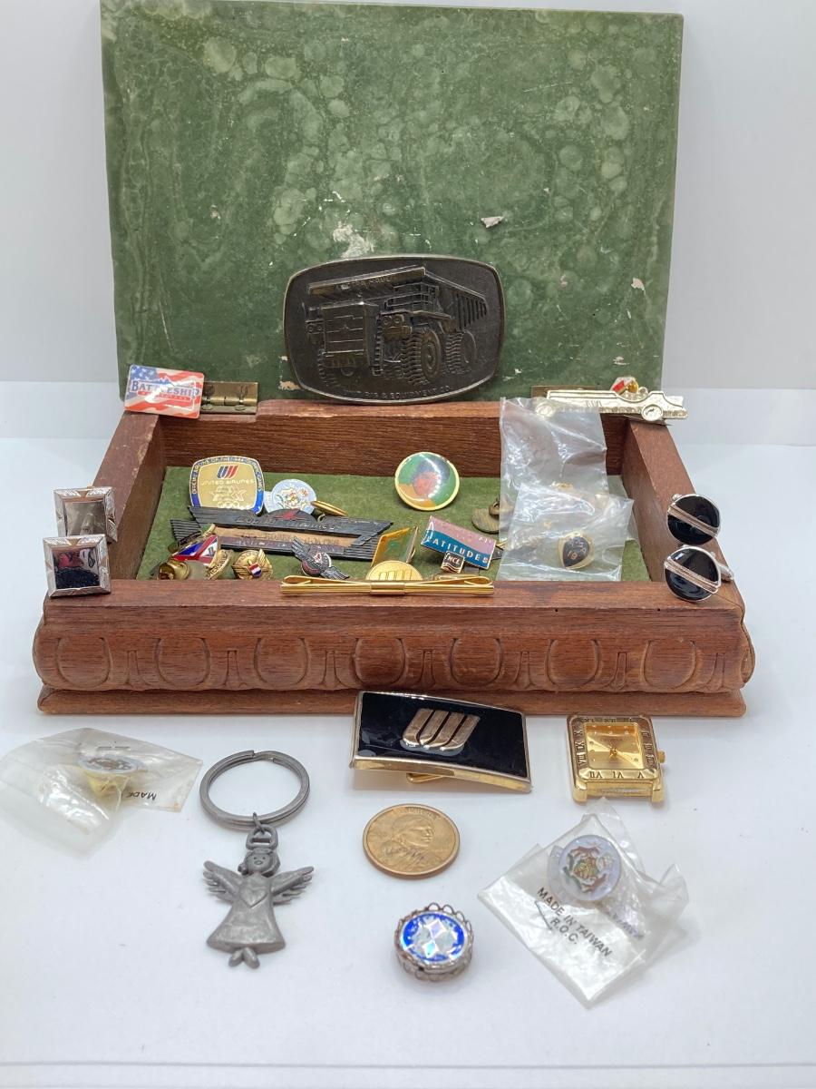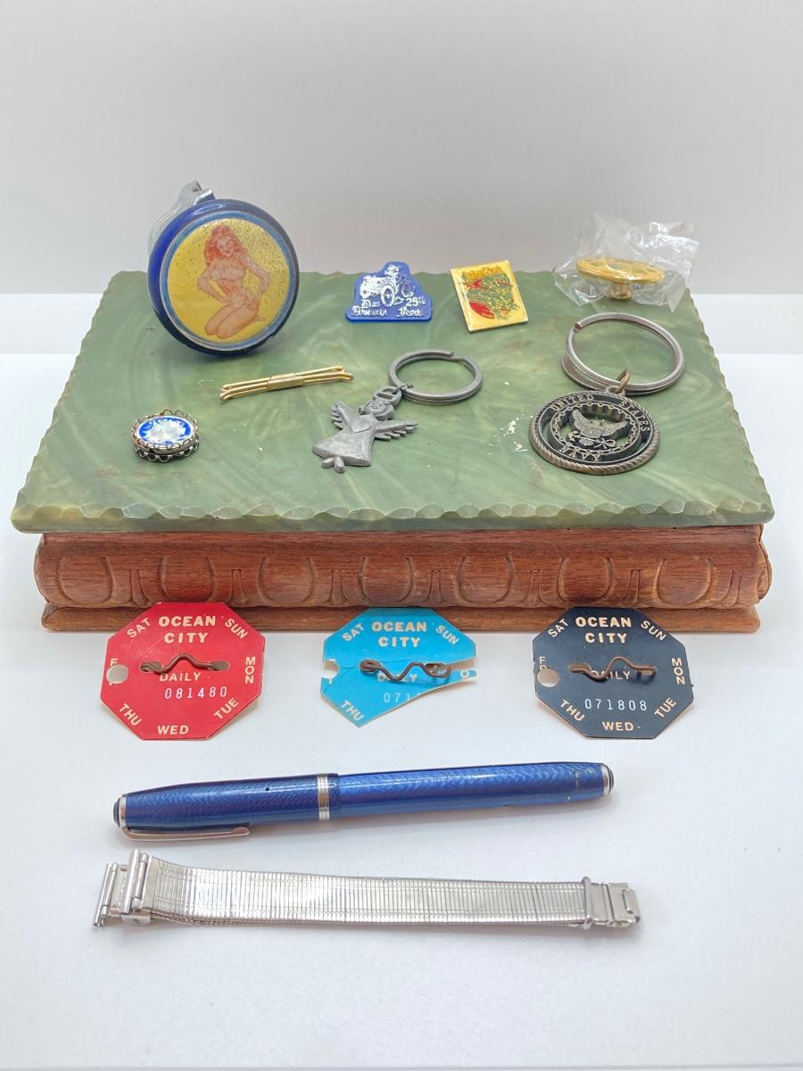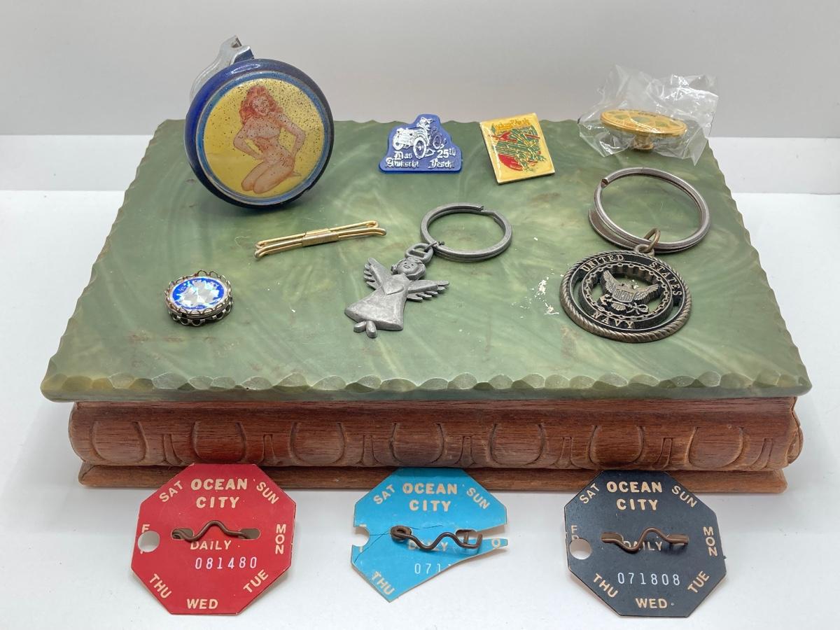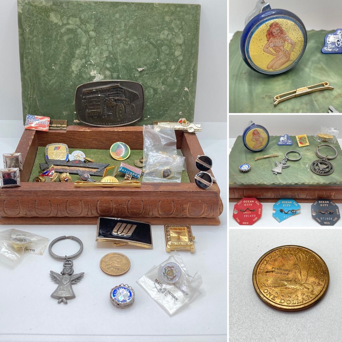LOT 187: Vintage Collection - Pins, Jewelry, U.S. Coin, Keychains, Beach Tags and More in Wood with Slate Top Box