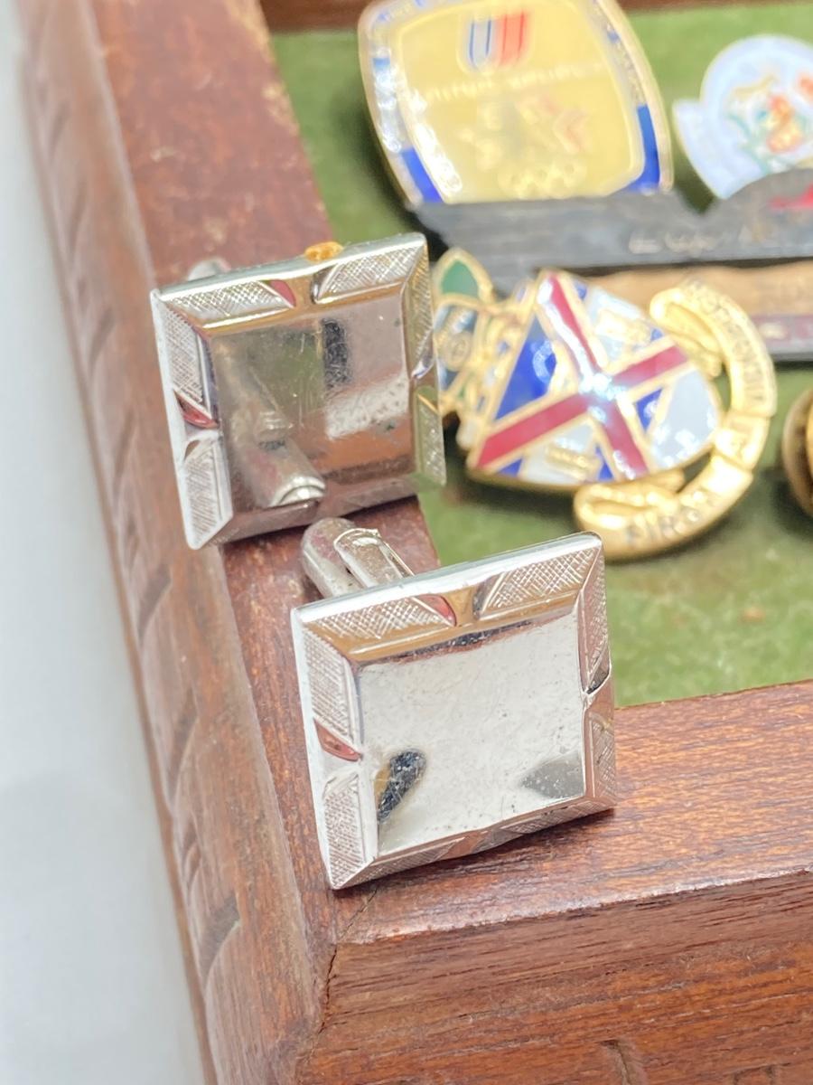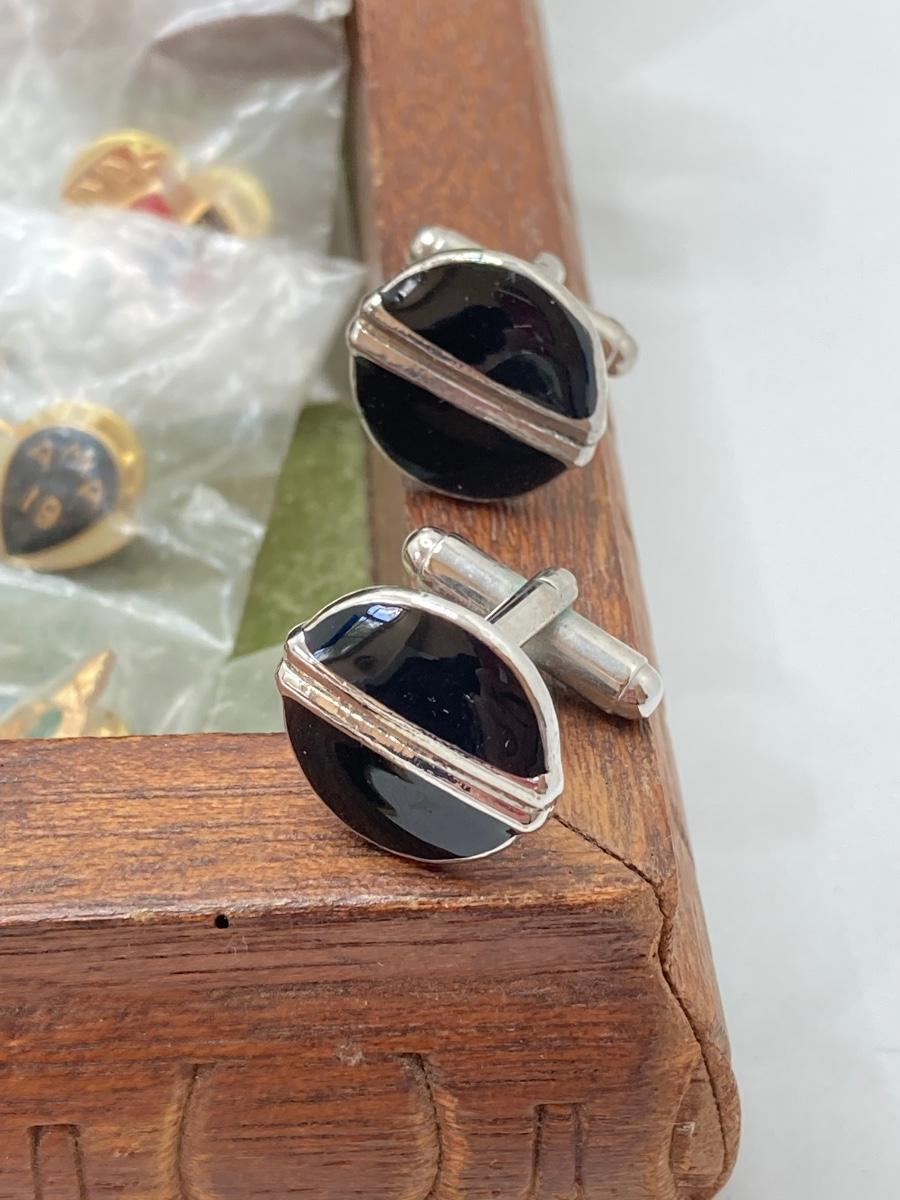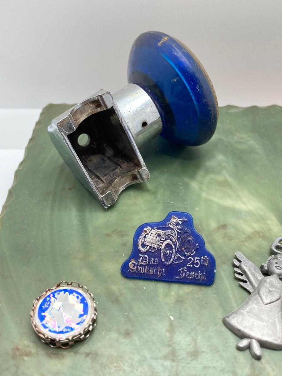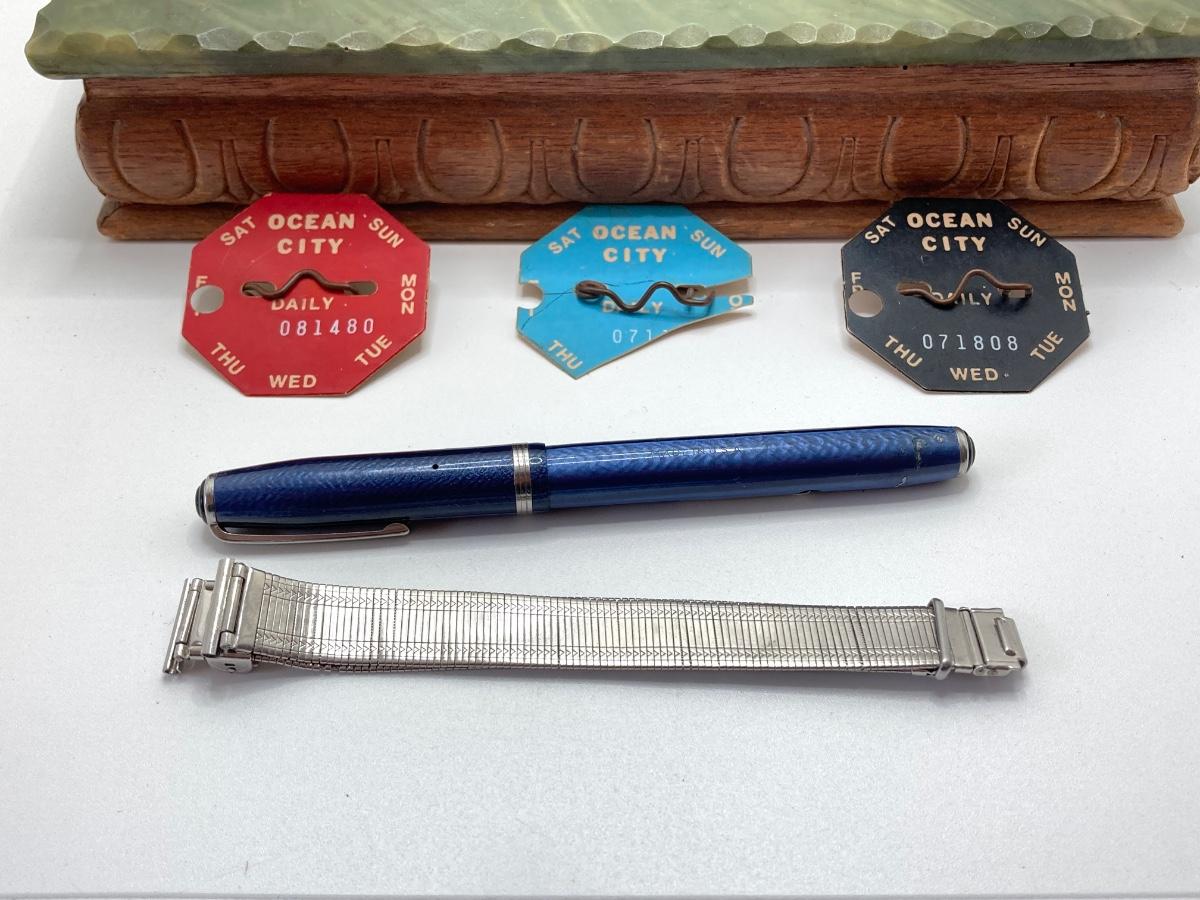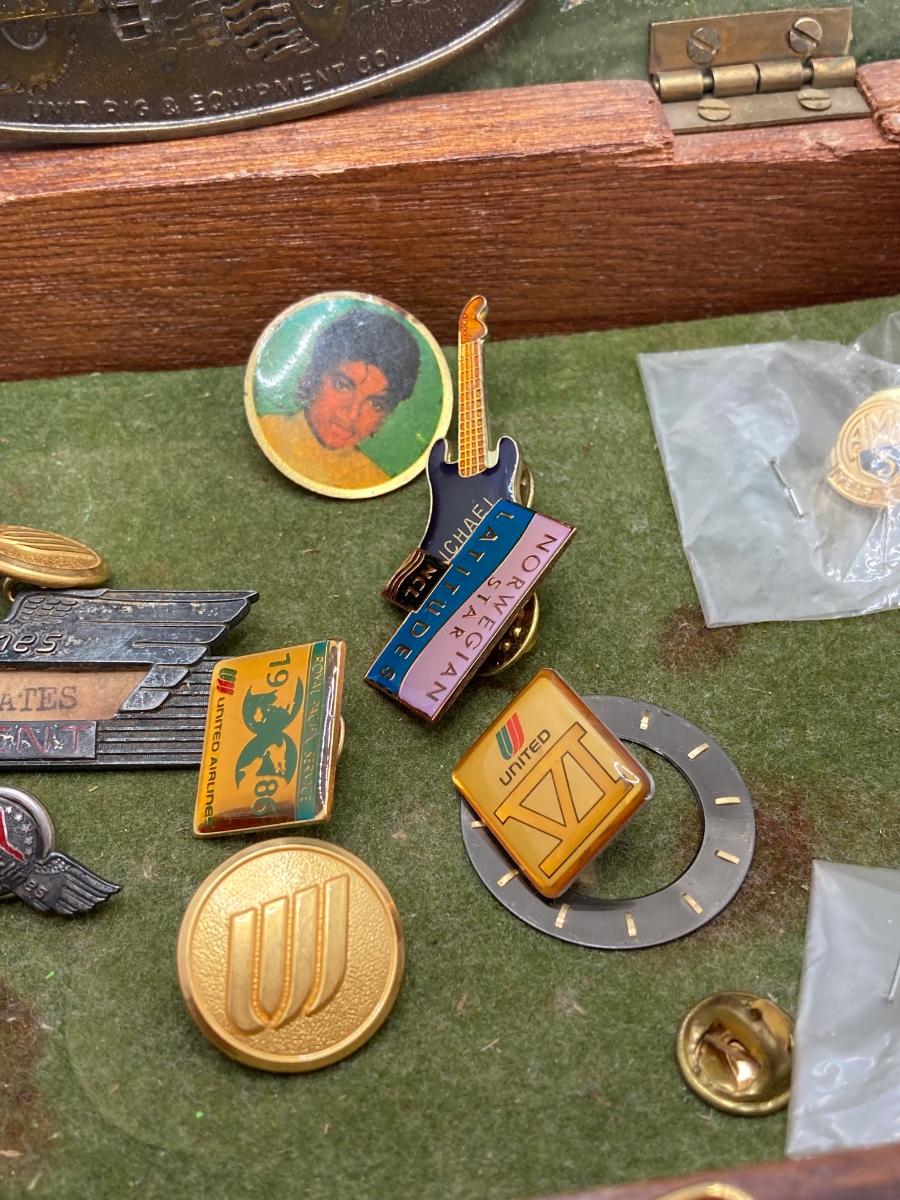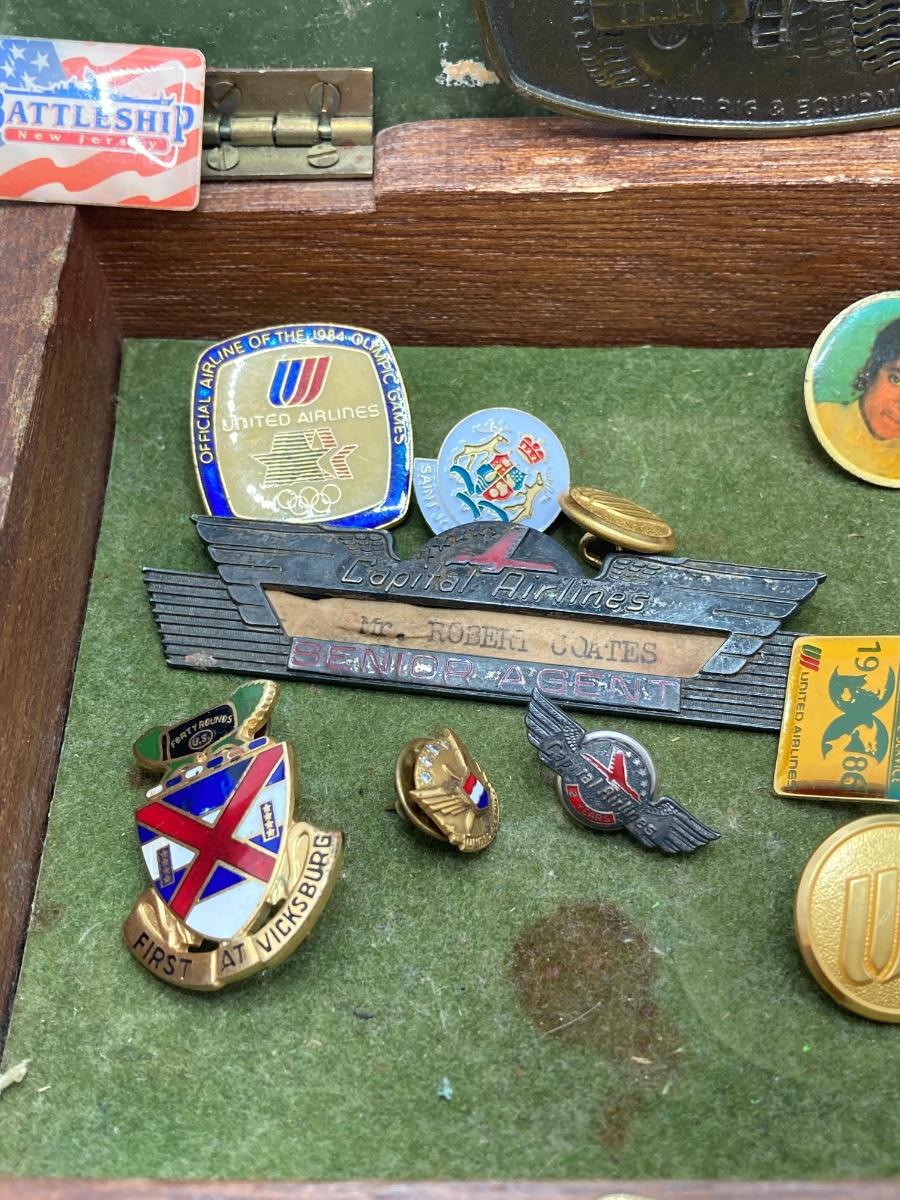 LOT 187: Vintage Collection - Pins, Jewelry, U.S. Coin, Keychains, Beach Tags and More in Wood with Slate Top Box