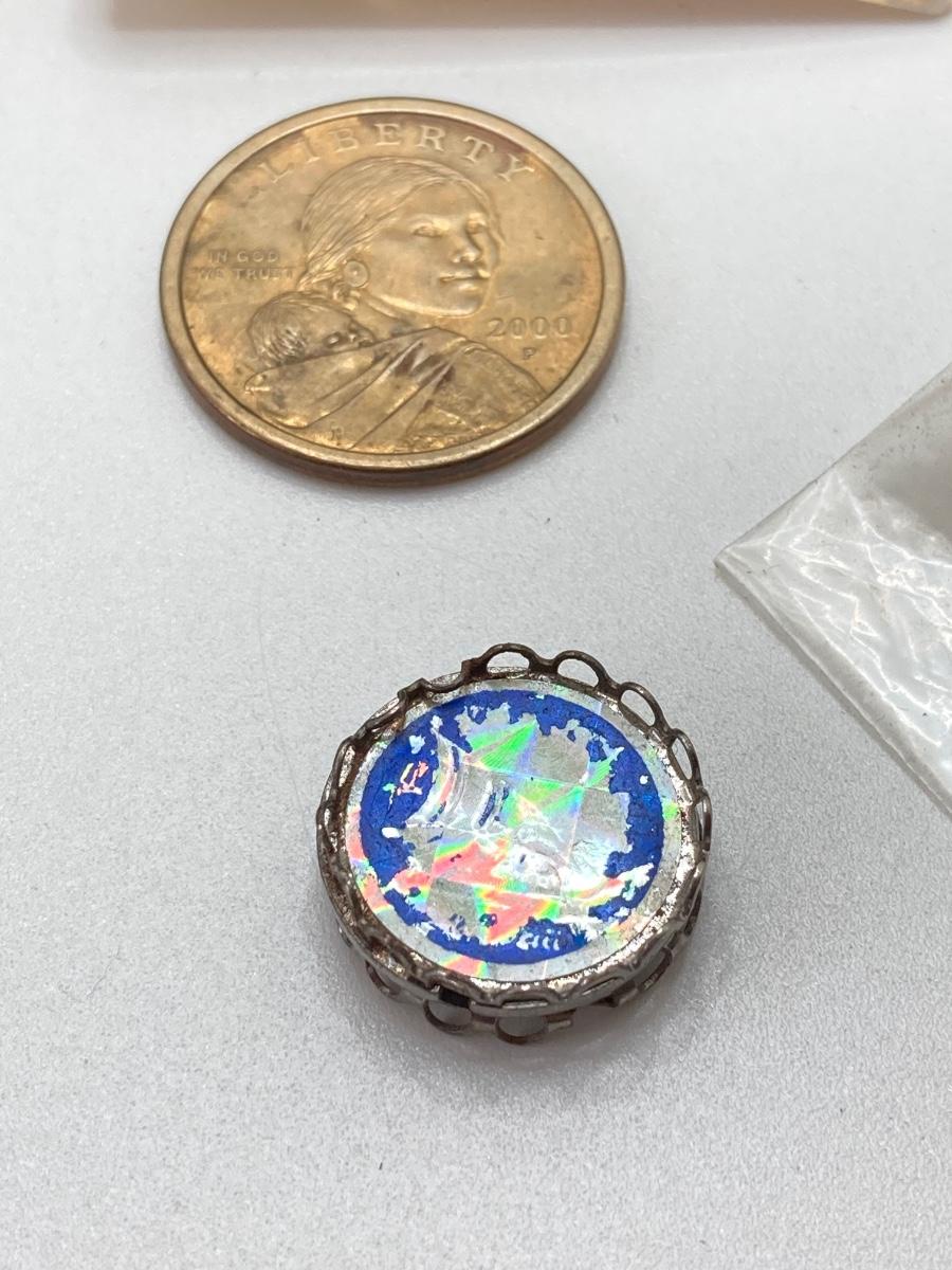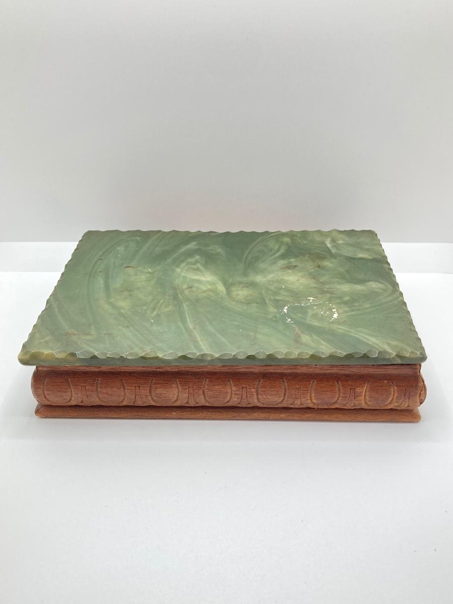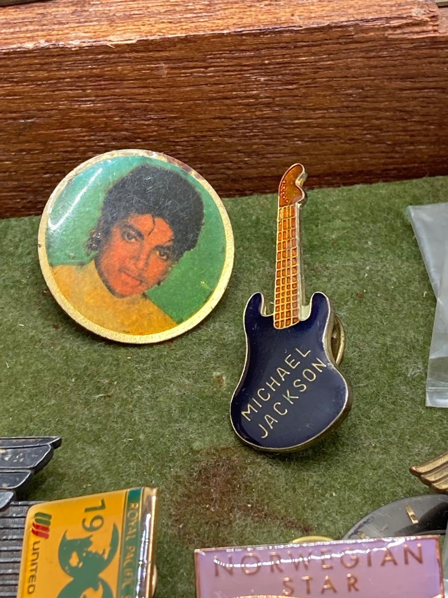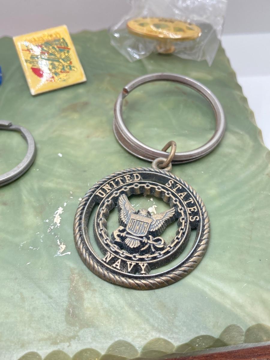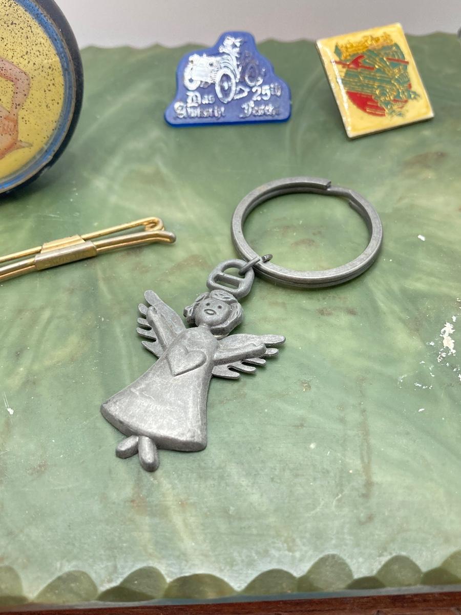 LOT 187: Vintage Collection - Pins, Jewelry, U.S. Coin, Keychains, Beach Tags and More in Wood with Slate Top Box