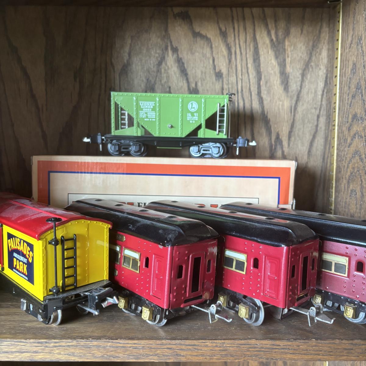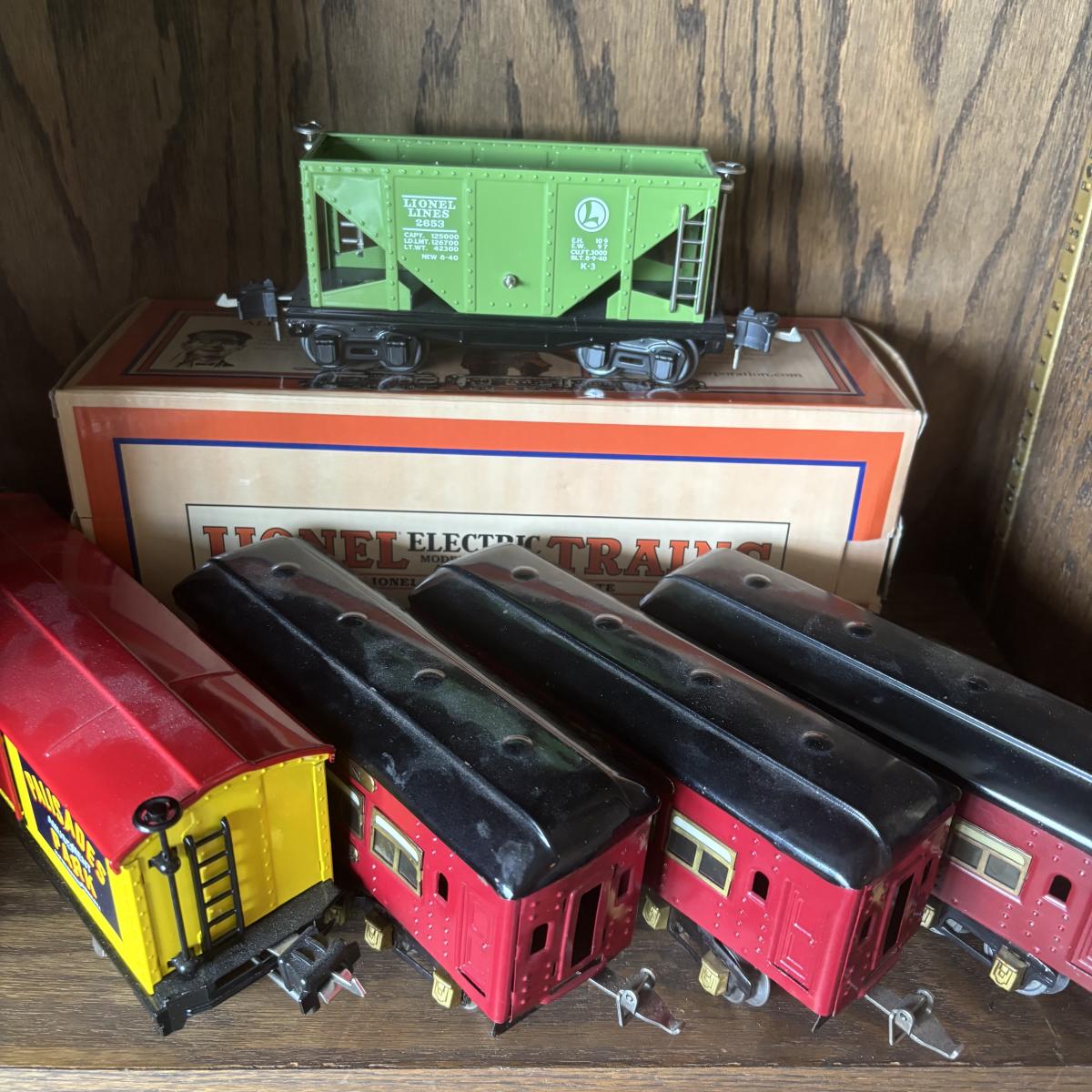 LOT 193: Train Car Collection: Lionel Hopper Car, Tin Pullman Cars & Box Car